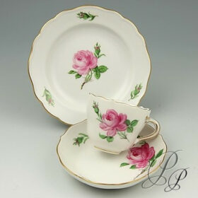 Seit dem Altertum gilt die Rote Rose als Symbol von Liebe und Freude. Im christlichen verkörpert die Rose Unschuld und Reinheit. Auch die Farben der Rosen haben Ihre Symbolik. So steht das Purpur-Rot für Würde, Warheit und Gerechtigkeit. Das Gelb hingegen für Güte und Glaube. Das Meissener Dekor Rote Rose entstand im 19 Jahrhundert zur Biedermeierzeit und seit dem ersten Erscheinen erfreut es sich großer Beliebtheit. Mit nur einer Farbe kann der Maler durch unterschiedlich starkes auf Auftragen die Farbintensität der Rosenblüte beeinflussen.