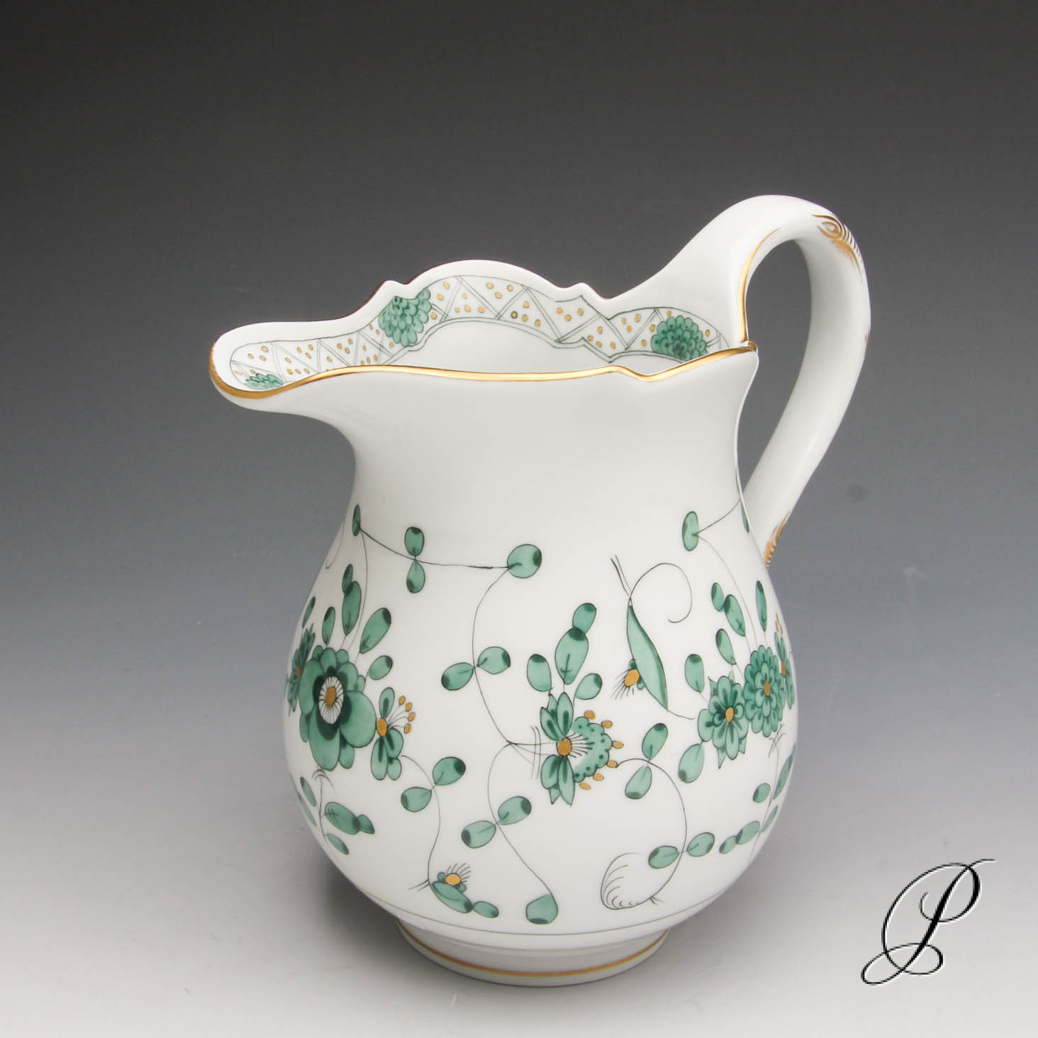 Dekor: Indische Malerei, grün, Goldpunkte und Goldrand.