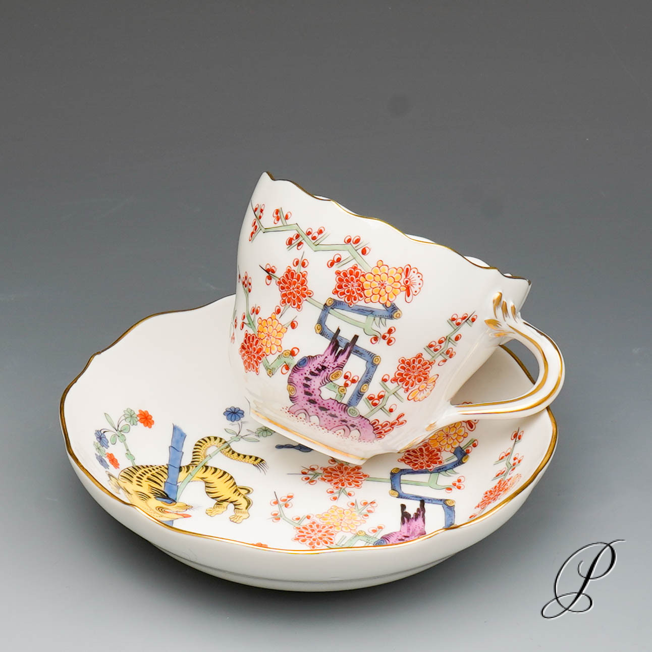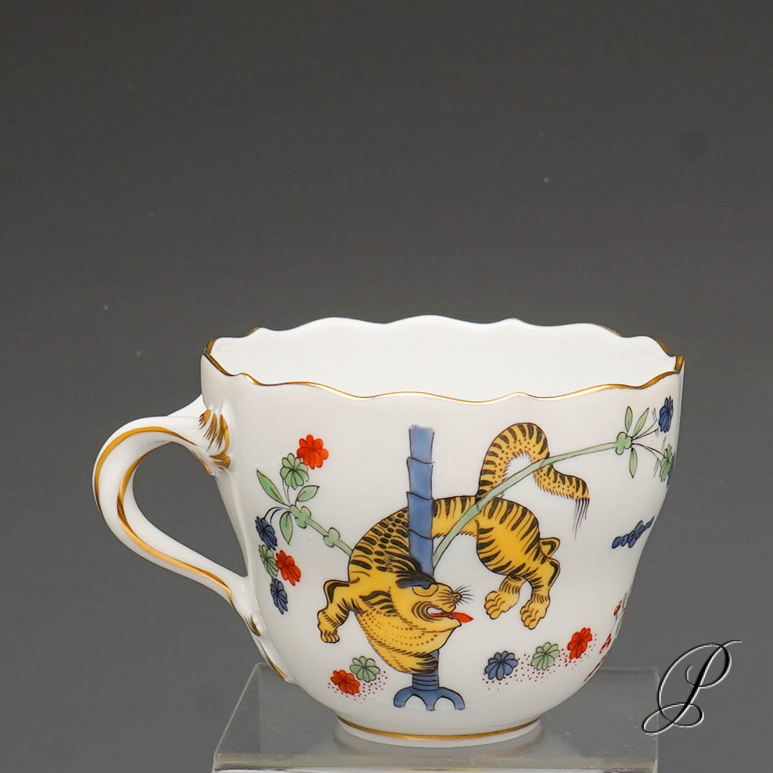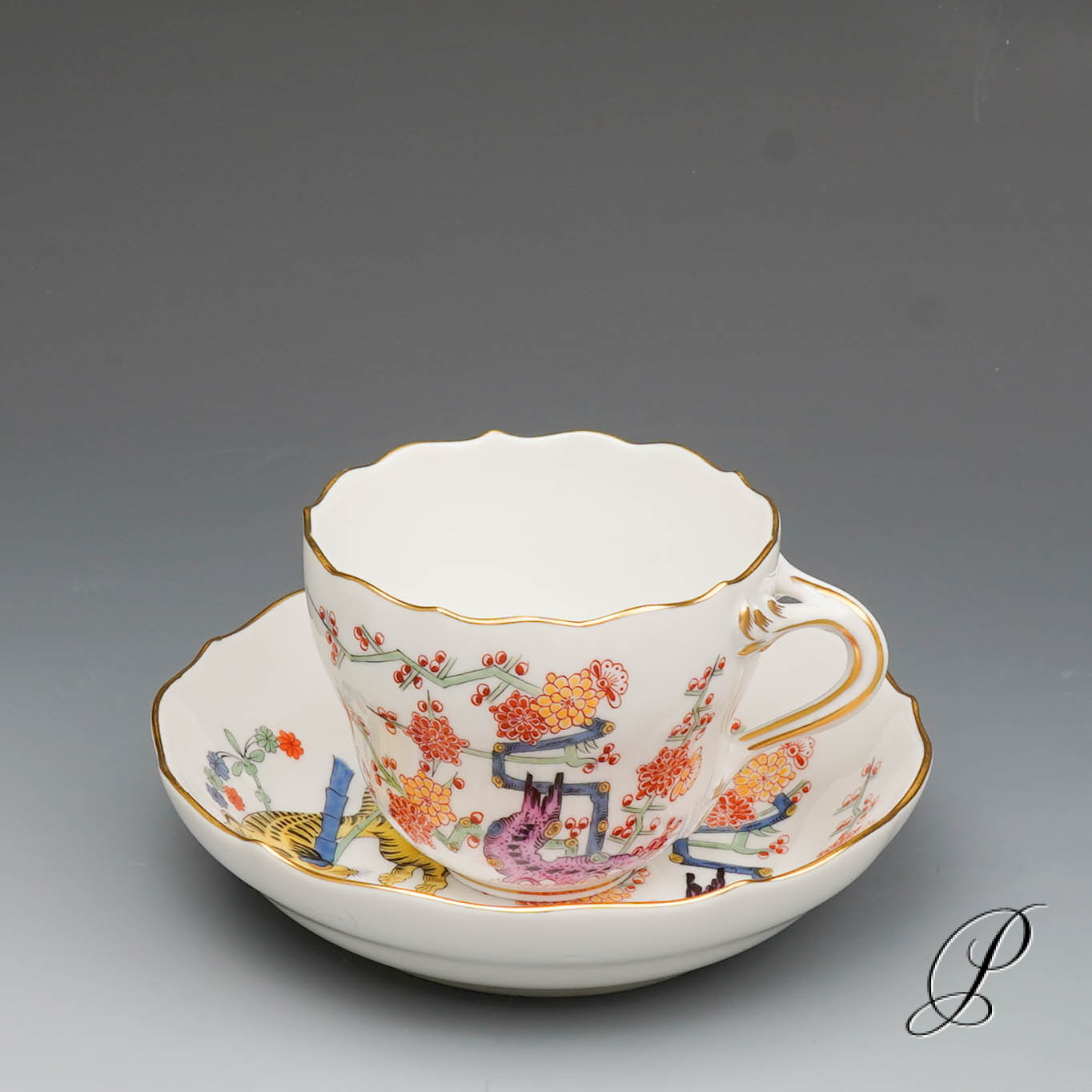 Ein Mokkagedeck Meissen im Dekor Alter reicher gelber Löwe bunt mit Kupferfarben und Goldrand.