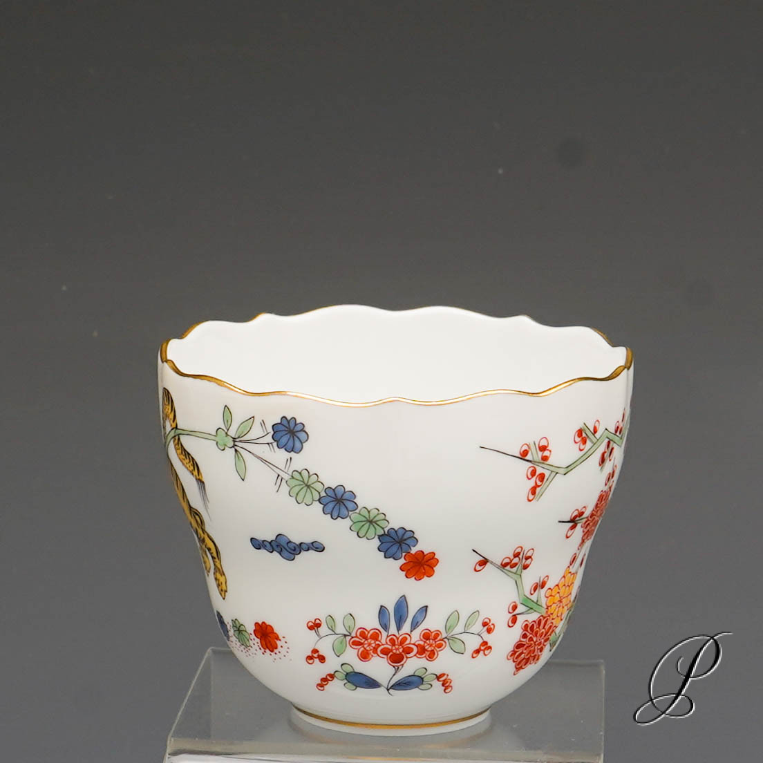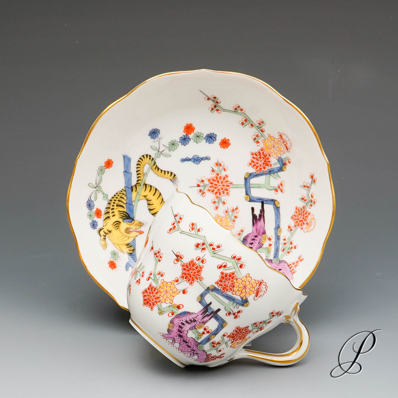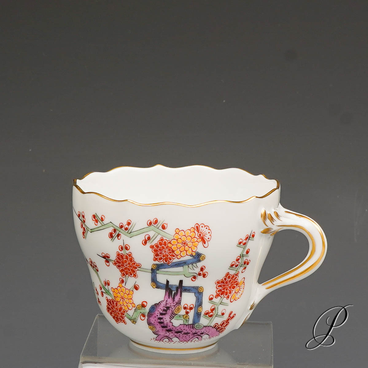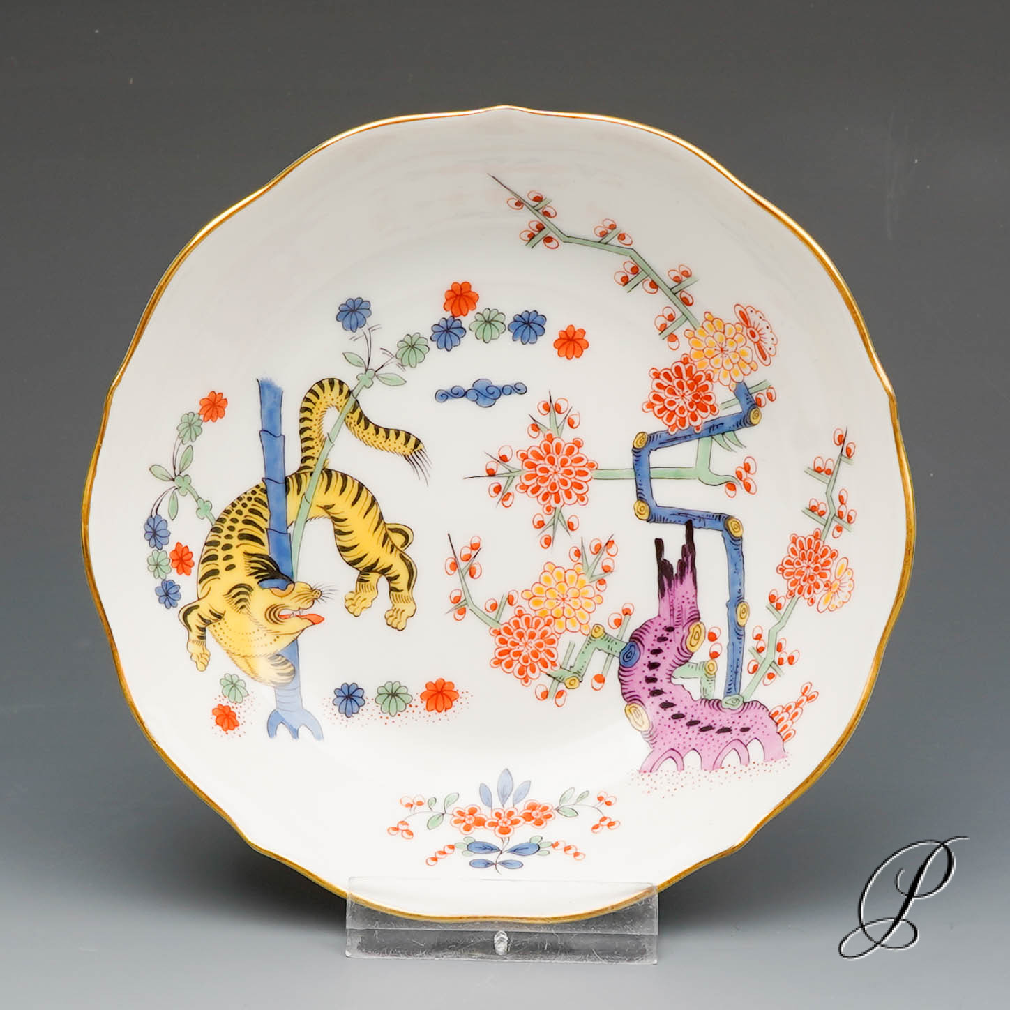 Ein Mokkagedeck Meissen im Dekor Alter reicher gelber Löwe bunt mit Kupferfarben und Goldrand.