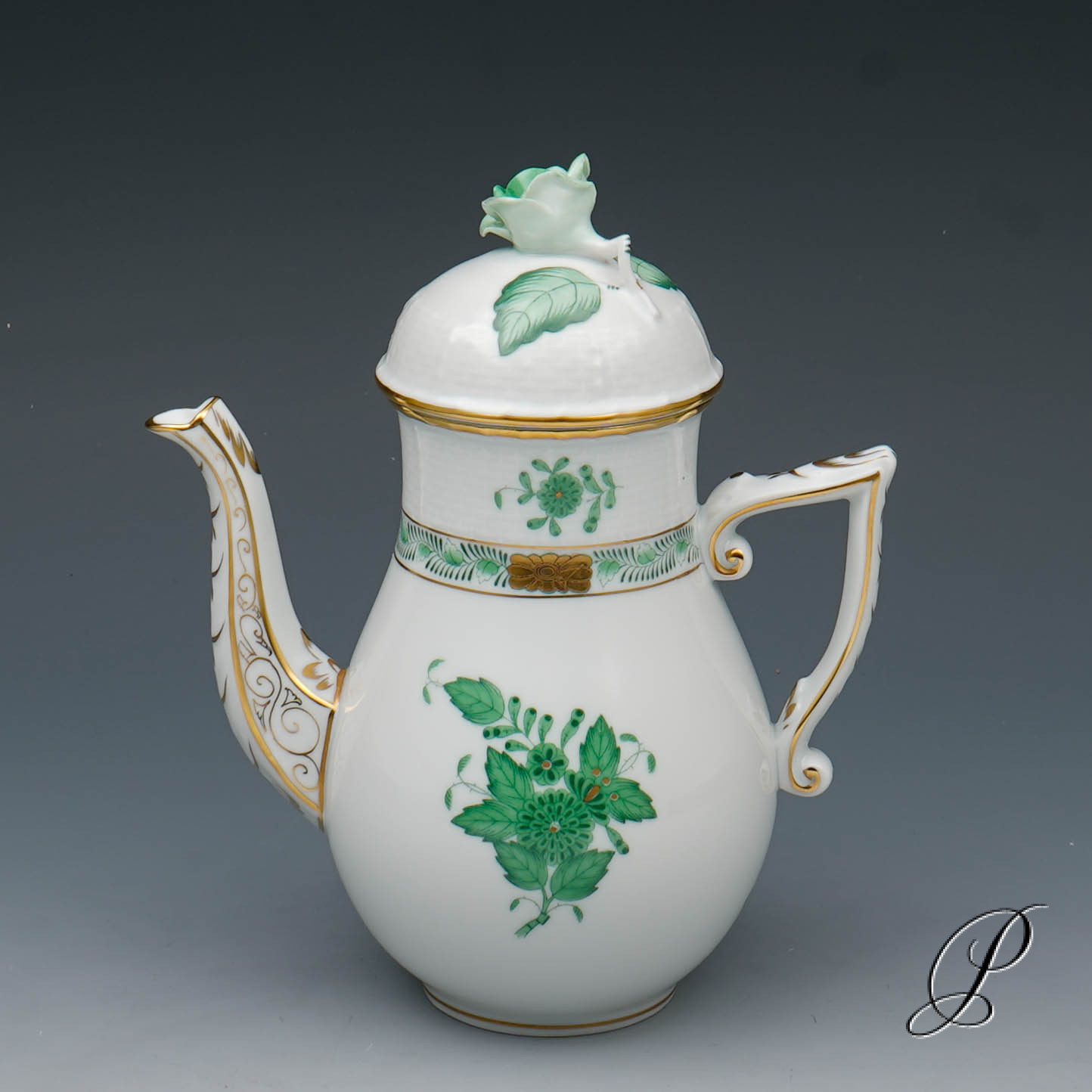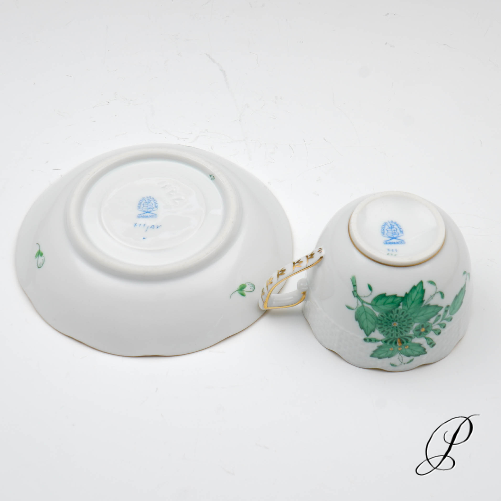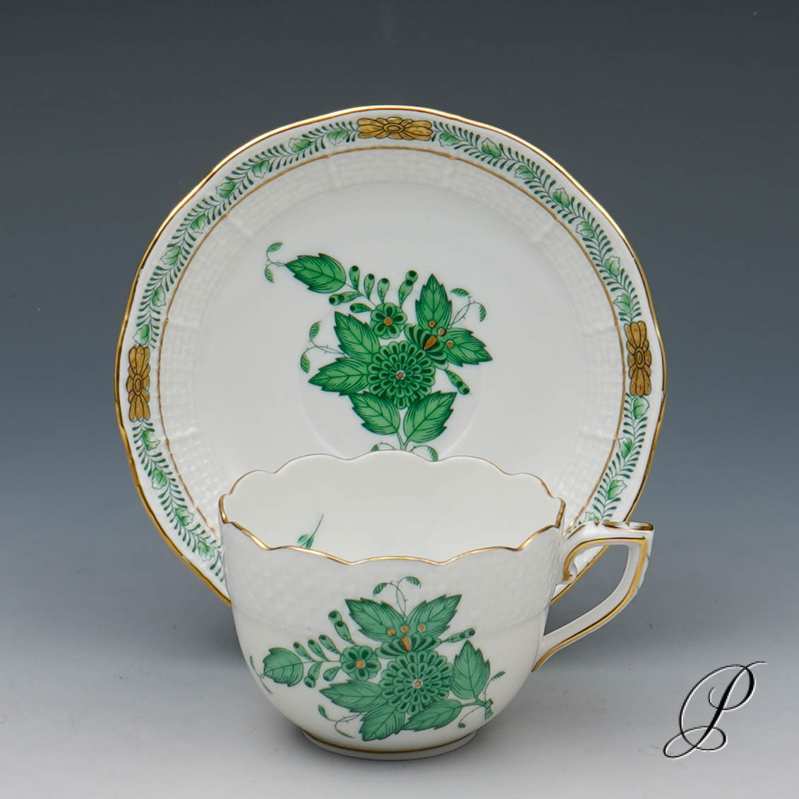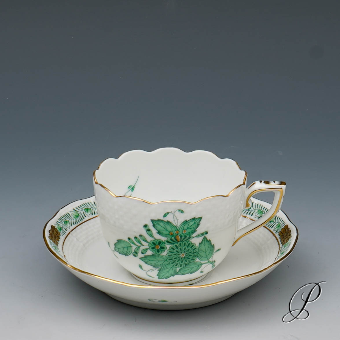 Das Dekor Apponyi gibt es in verschiedenen Farbvarianten. Der Name verbindet sich mit dem Grafen Albert Apponyi, der dieses Motiv in der Herend Manufaktur bestellte. Das Dekor wurde in Anlehnung an das fernöstliche Motiv „Indischer Blumenkorb“ entworfen. Eine stilisierte Pfingstrose in Konturmalerei welche von 6 Streumotiven und einer Girlande aus stilisierten Blättern umgeben ist.