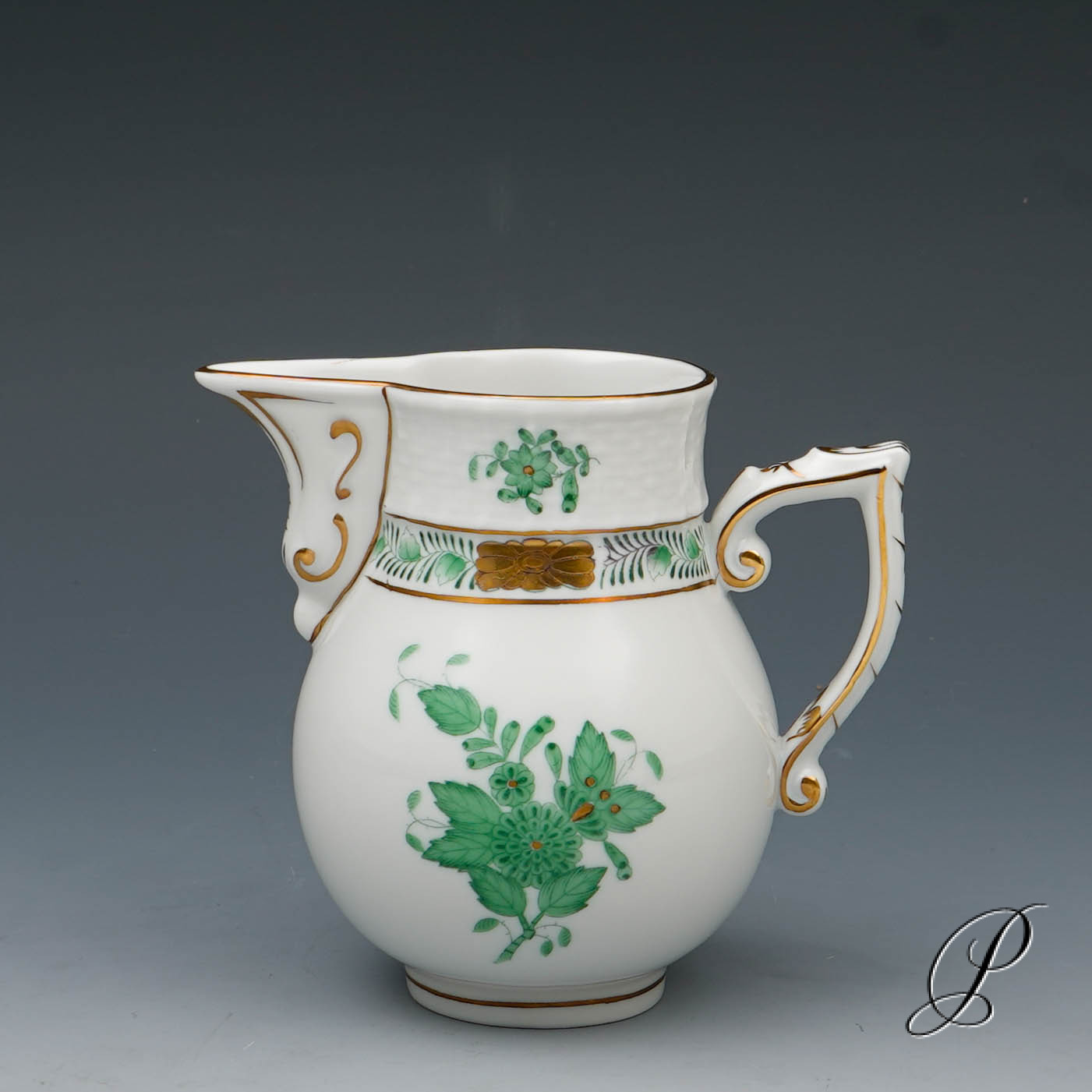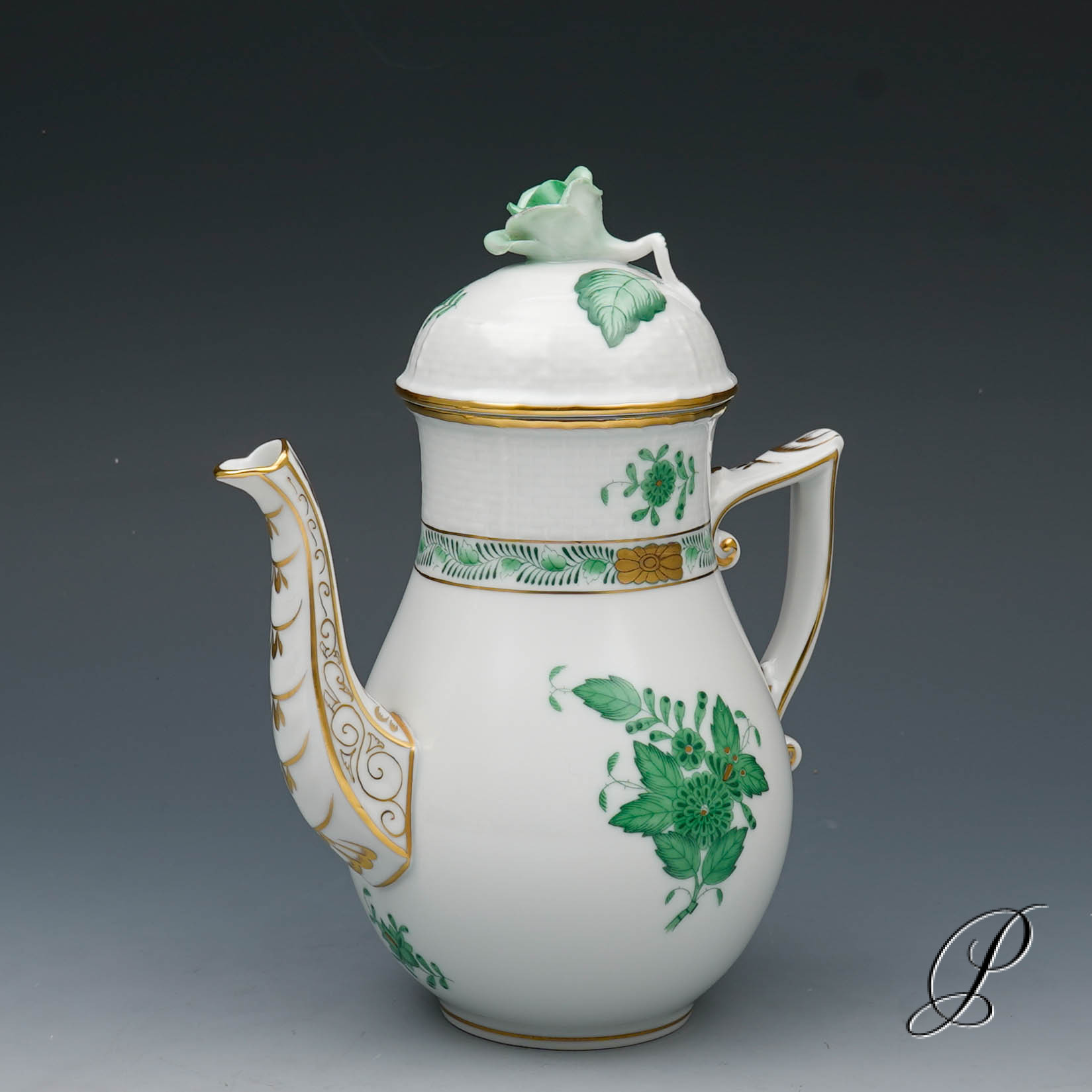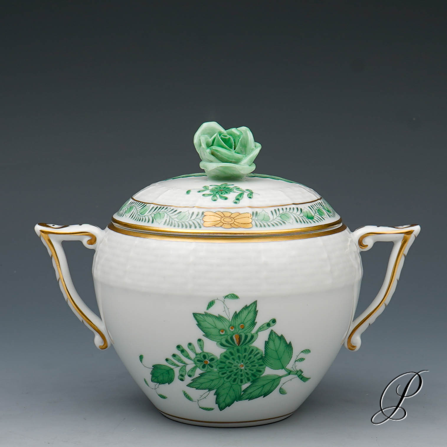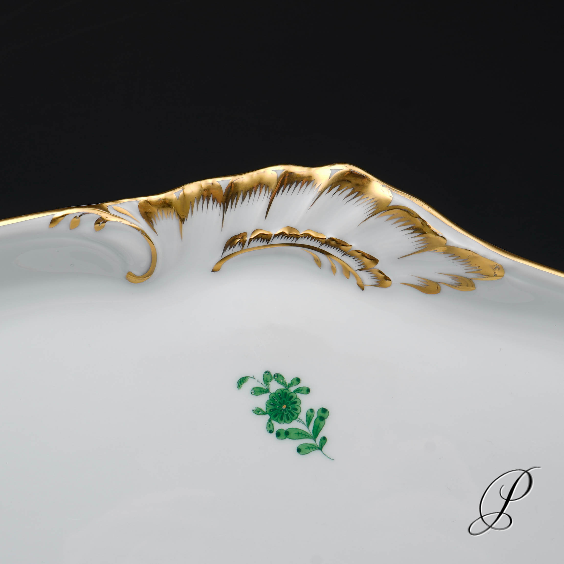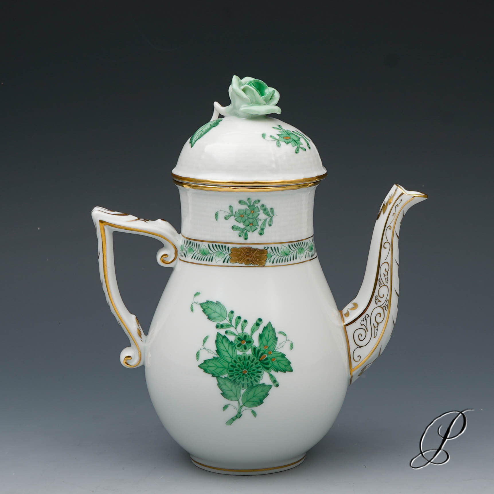 Das Dekor Apponyi gibt es in verschiedenen Farbvarianten. Der Name verbindet sich mit dem Grafen Albert Apponyi, der dieses Motiv in der Herend Manufaktur bestellte. Das Dekor wurde in Anlehnung an das fernöstliche Motiv „Indischer Blumenkorb“ entworfen. Eine stilisierte Pfingstrose in Konturmalerei welche von 6 Streumotiven und einer Girlande aus stilisierten Blättern umgeben ist.