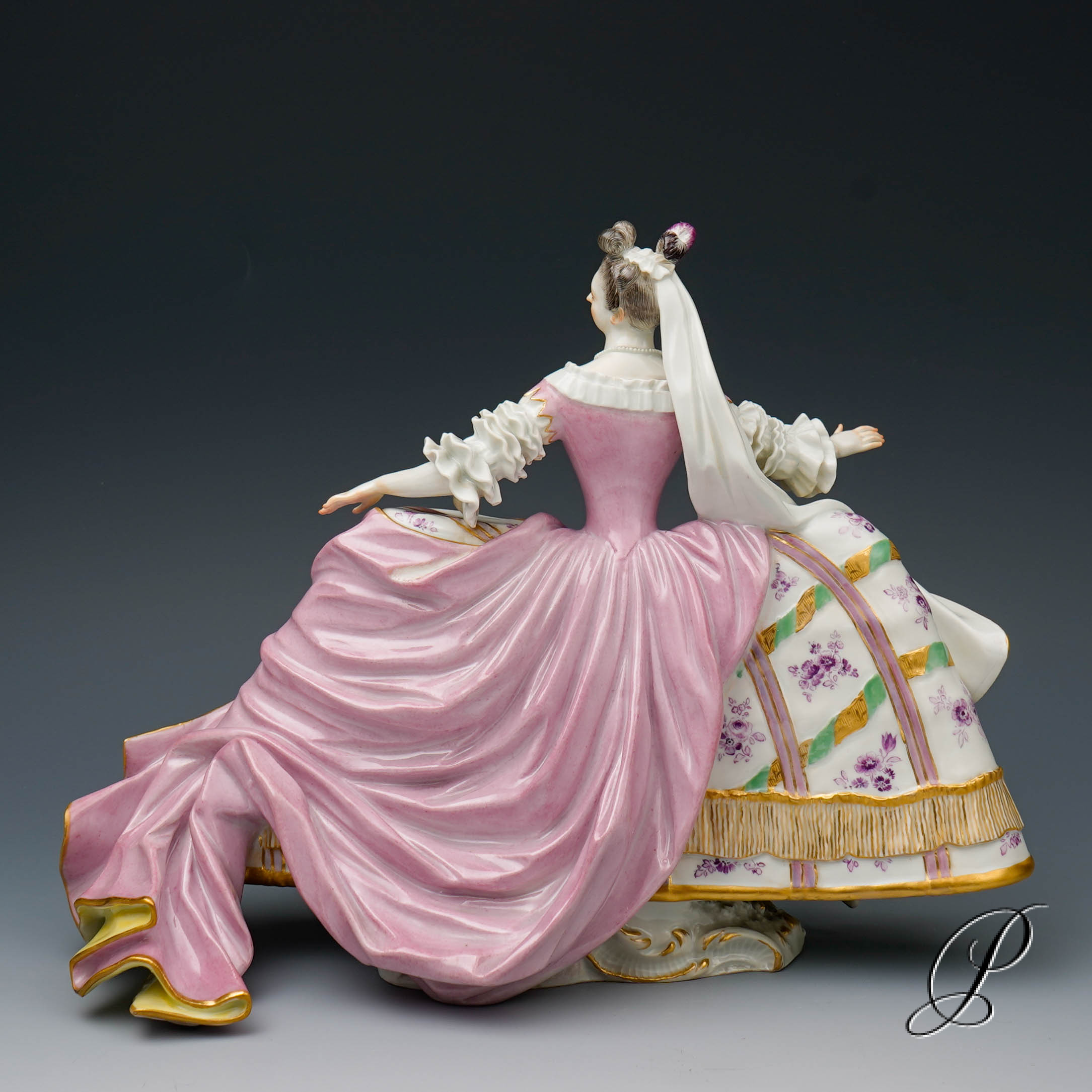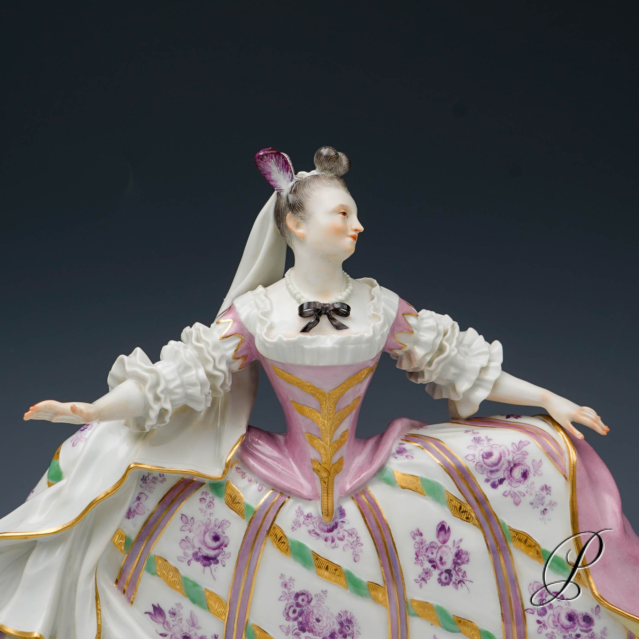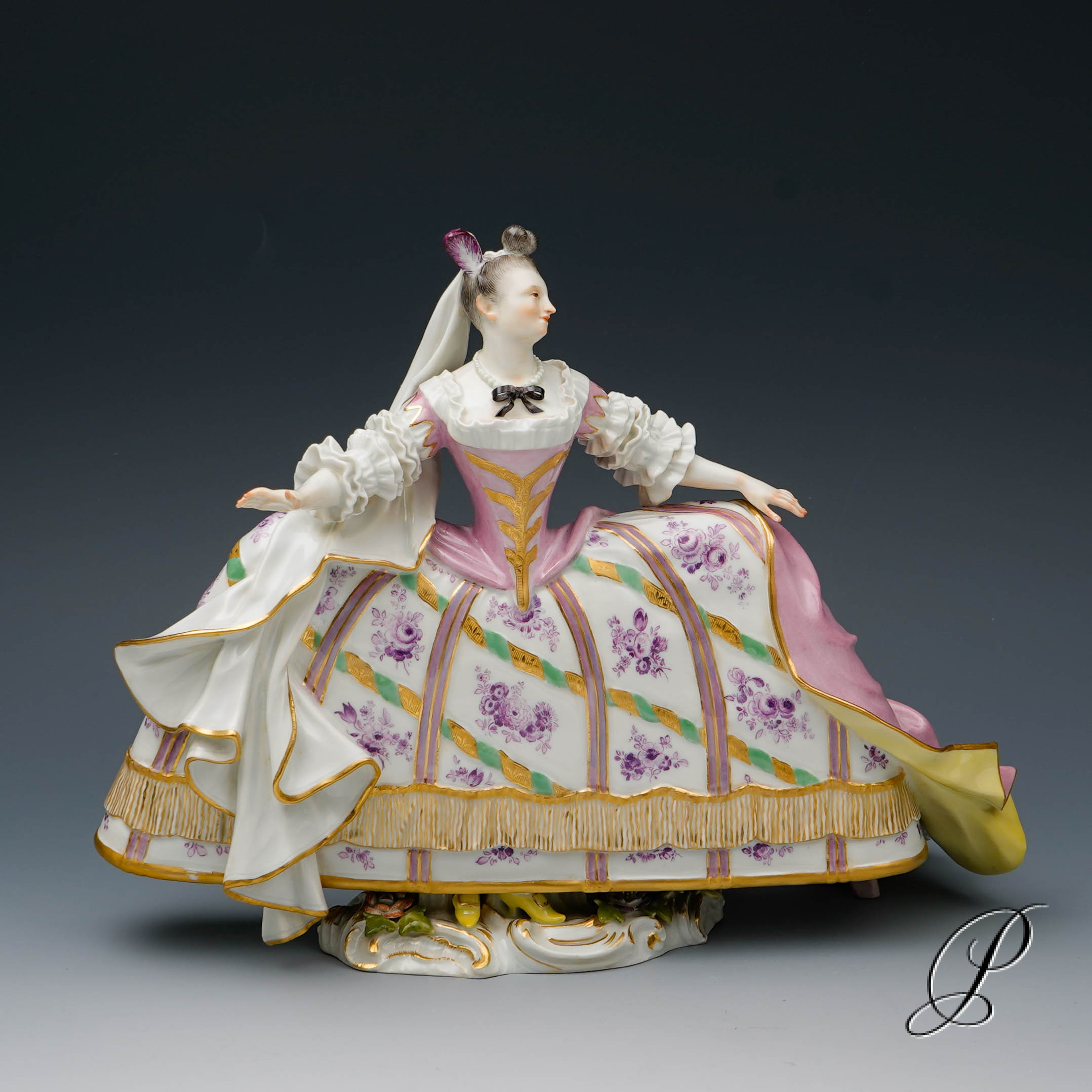 Traumhaft gemalter Reifrock. Wunderschön ausgearbeitet beeindruckt das Gewand mit realistischen Faltenwürfen. Sehr aufwendig modelliert. Ein wunderschönes und seltenes Stück Meissner Porzellan.