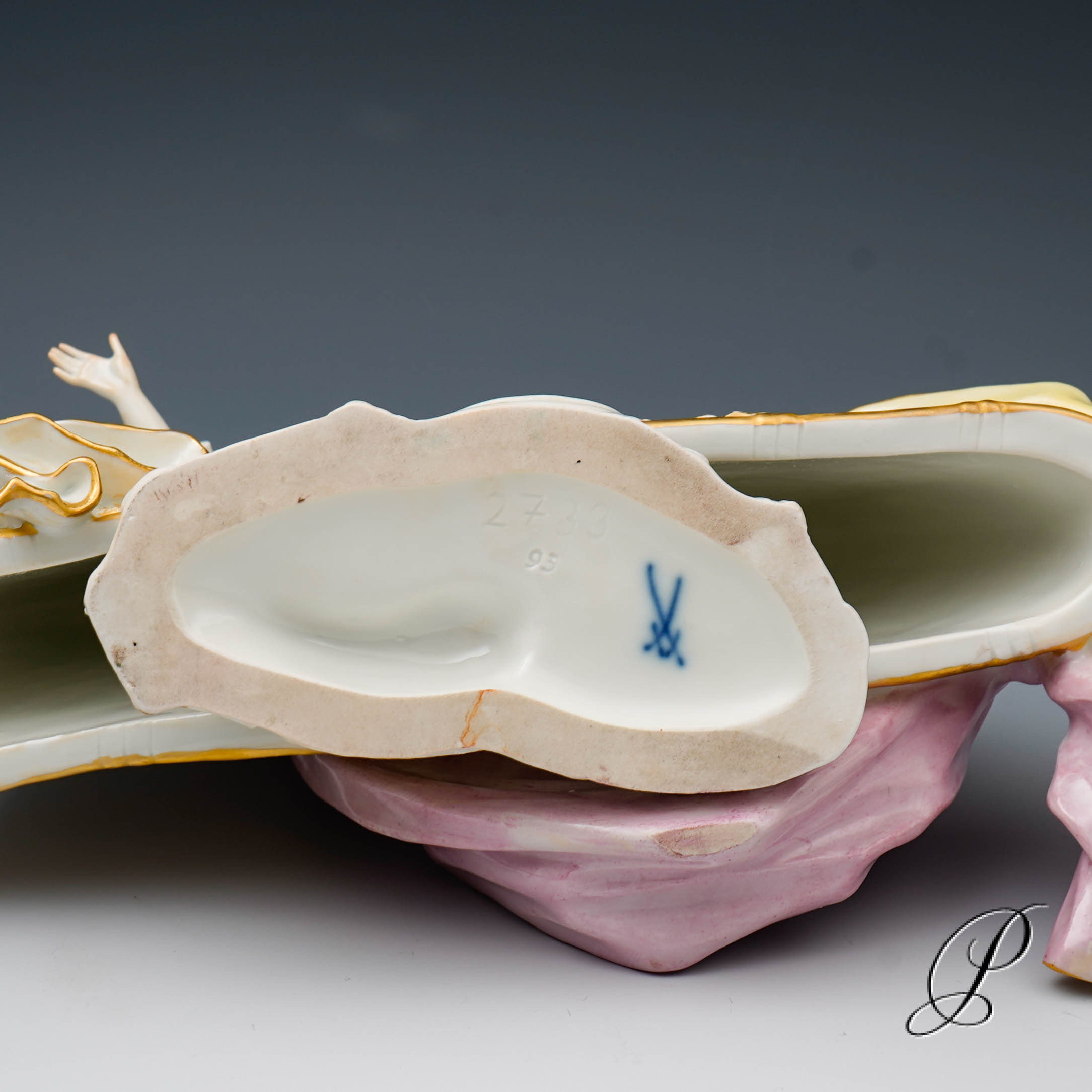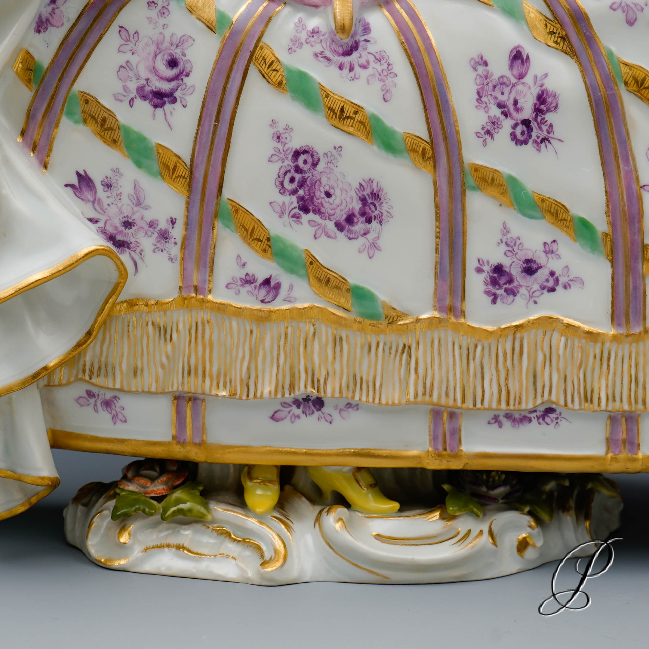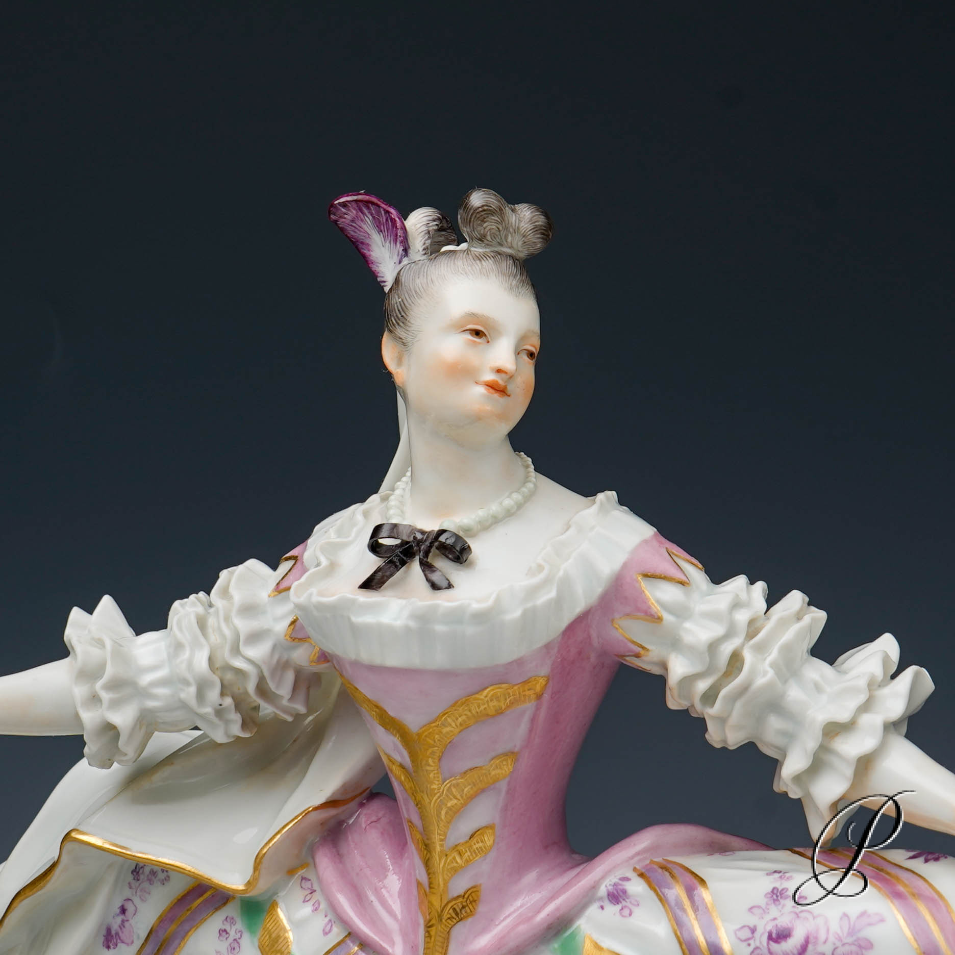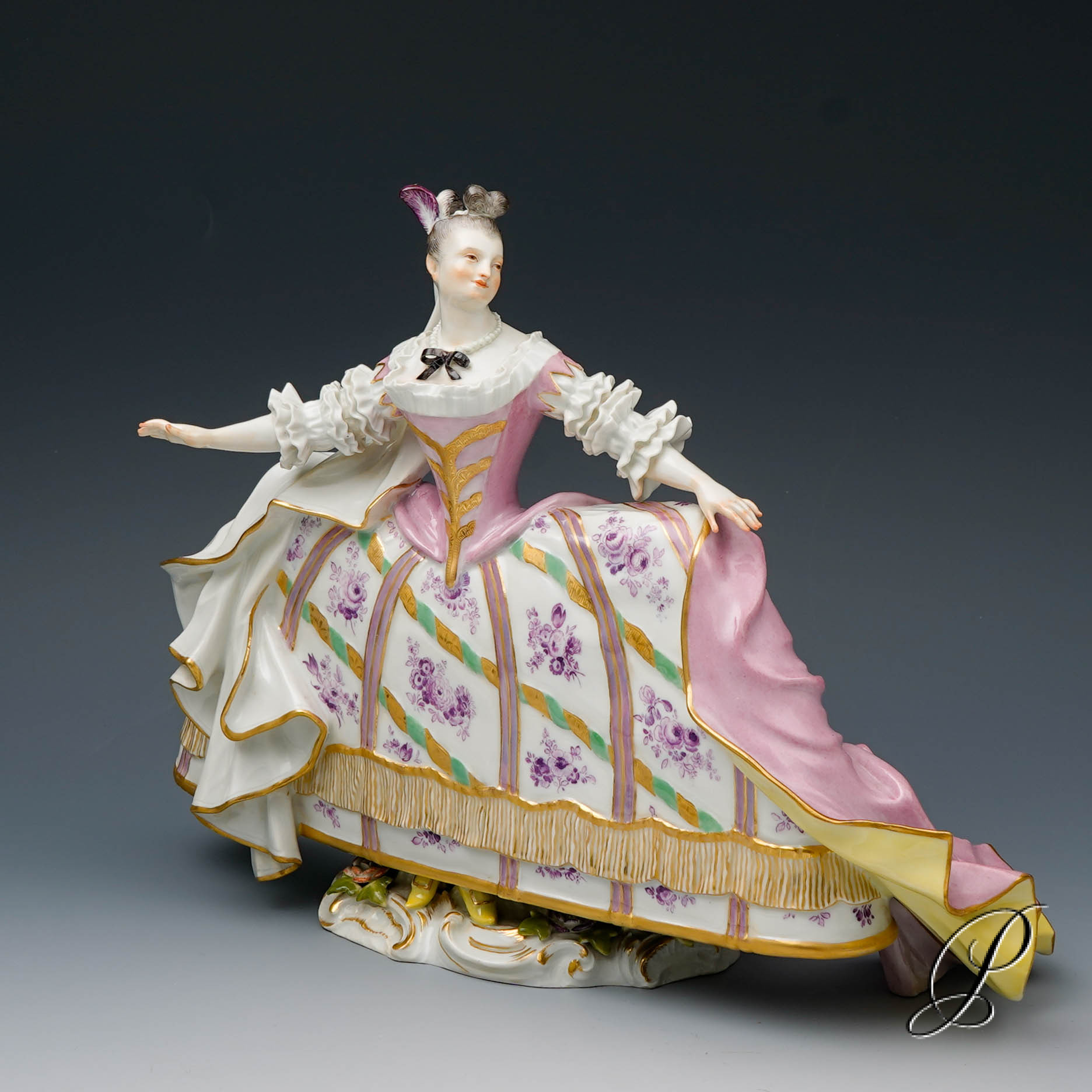 Traumhaft gemalter Reifrock. Wunderschön ausgearbeitet beeindruckt das Gewand mit realistischen Faltenwürfen. Sehr aufwendig modelliert. Ein wunderschönes und seltenes Stück Meissner Porzellan.