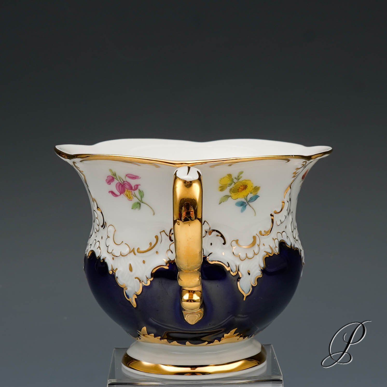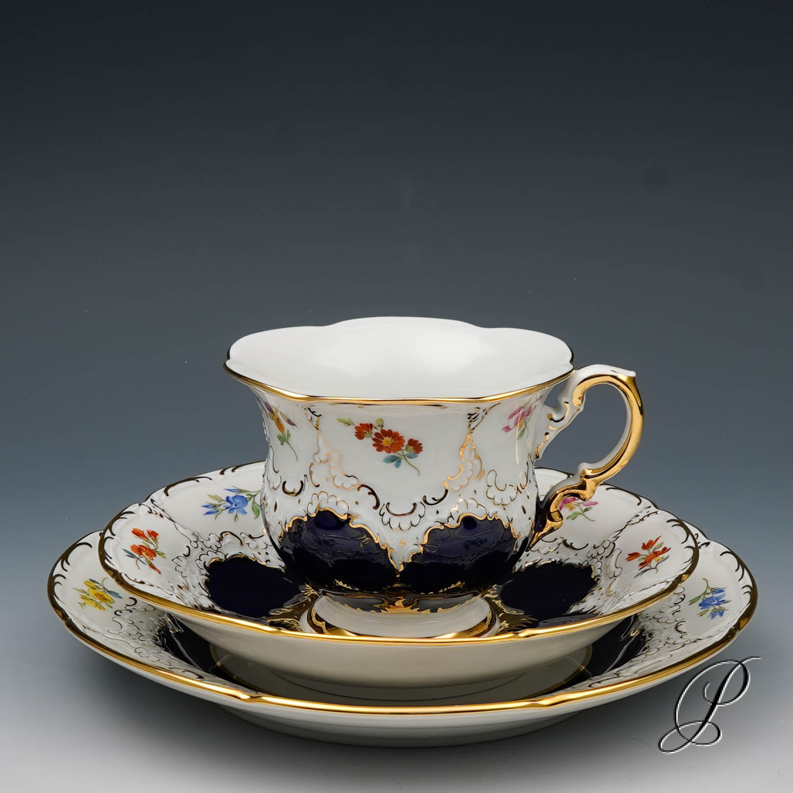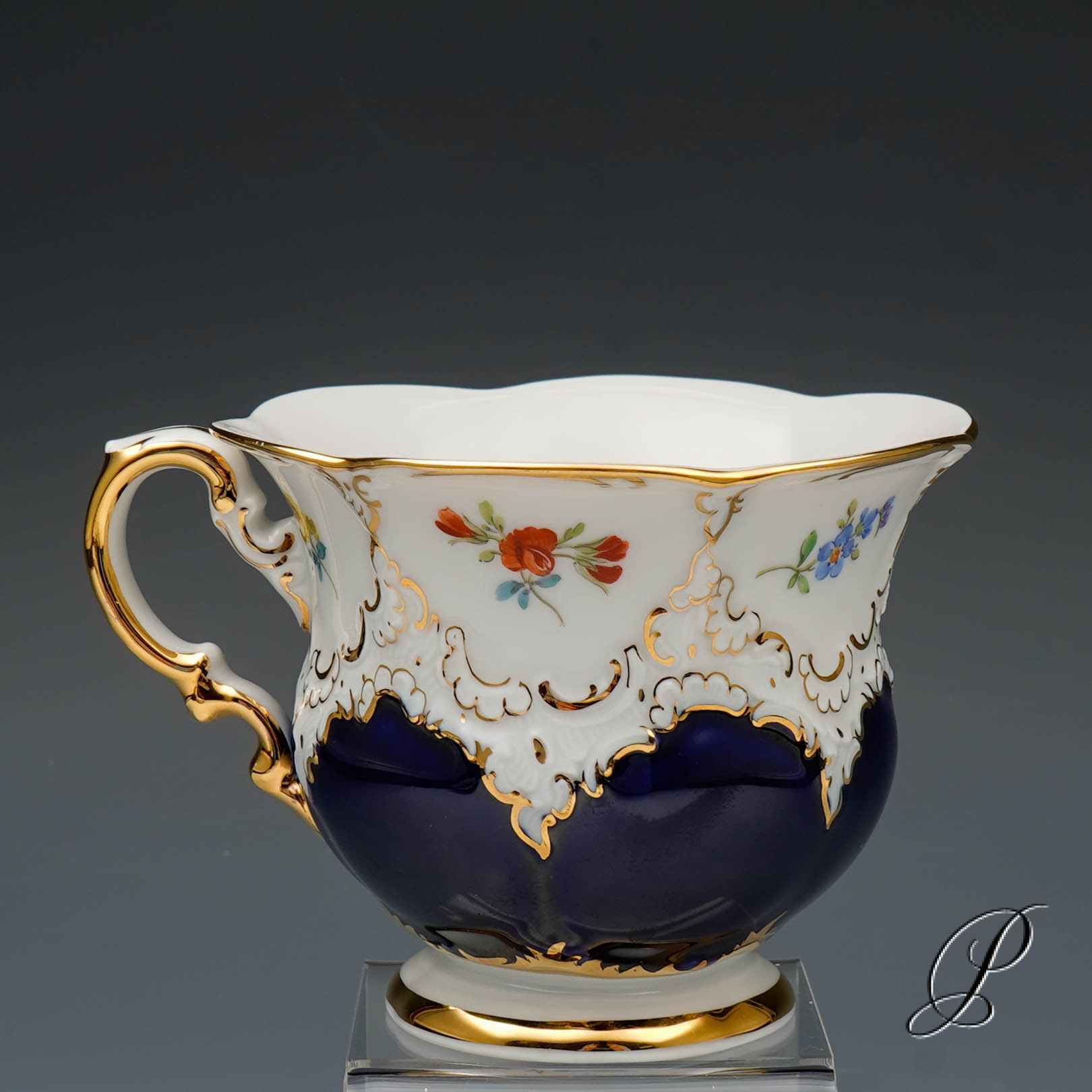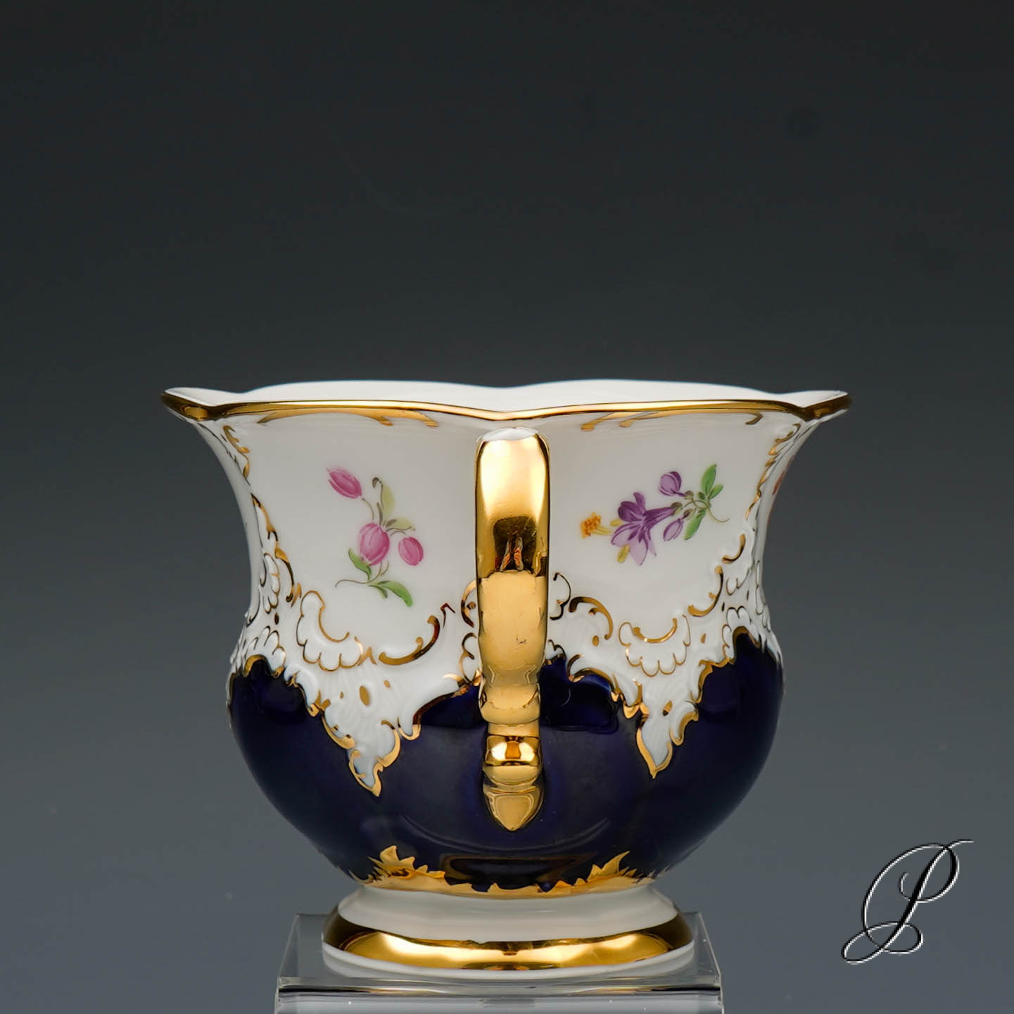 Dekor: gestreute Blümchen bunt, königsblau glasiert und Gold angespitzt. Dekornummer: 011098.