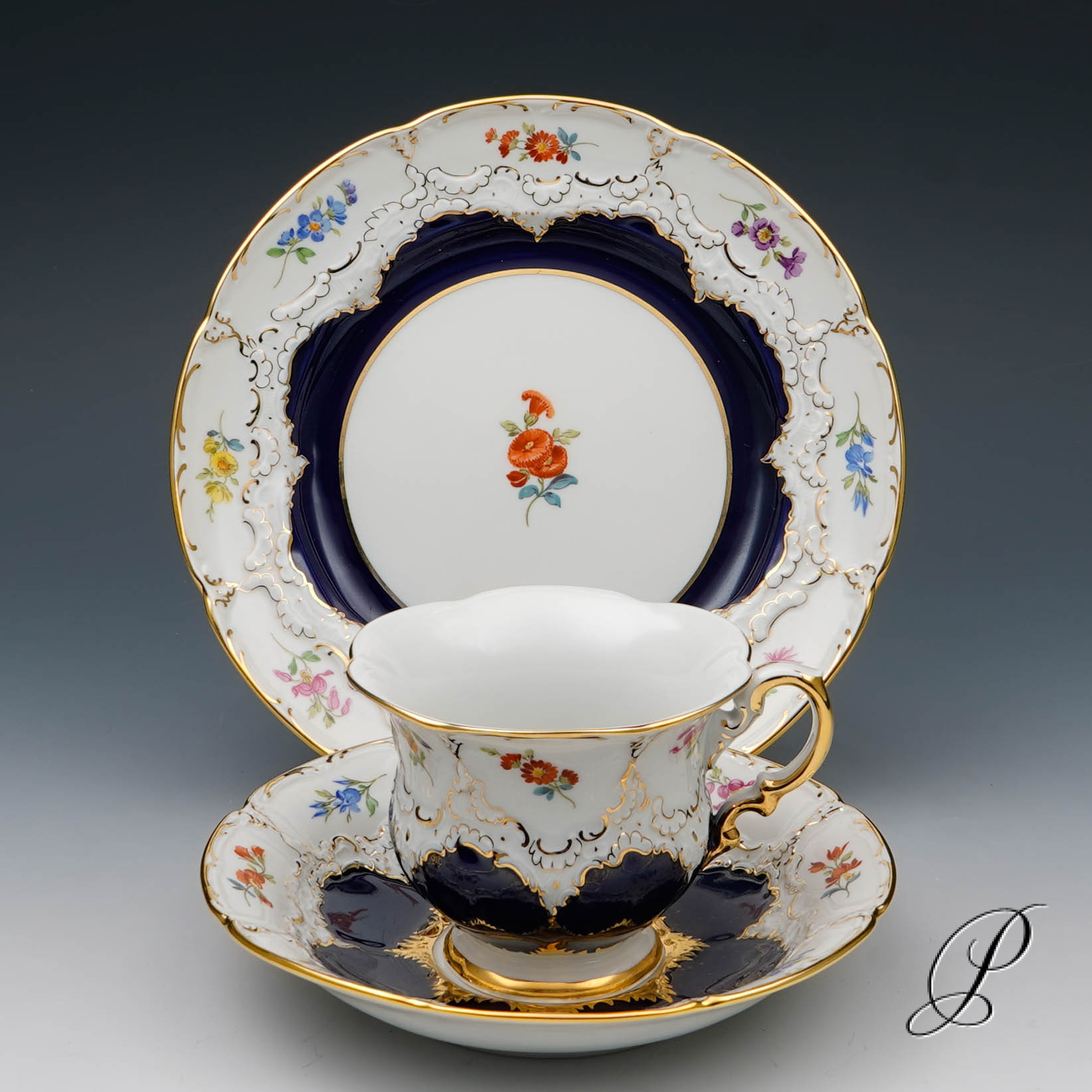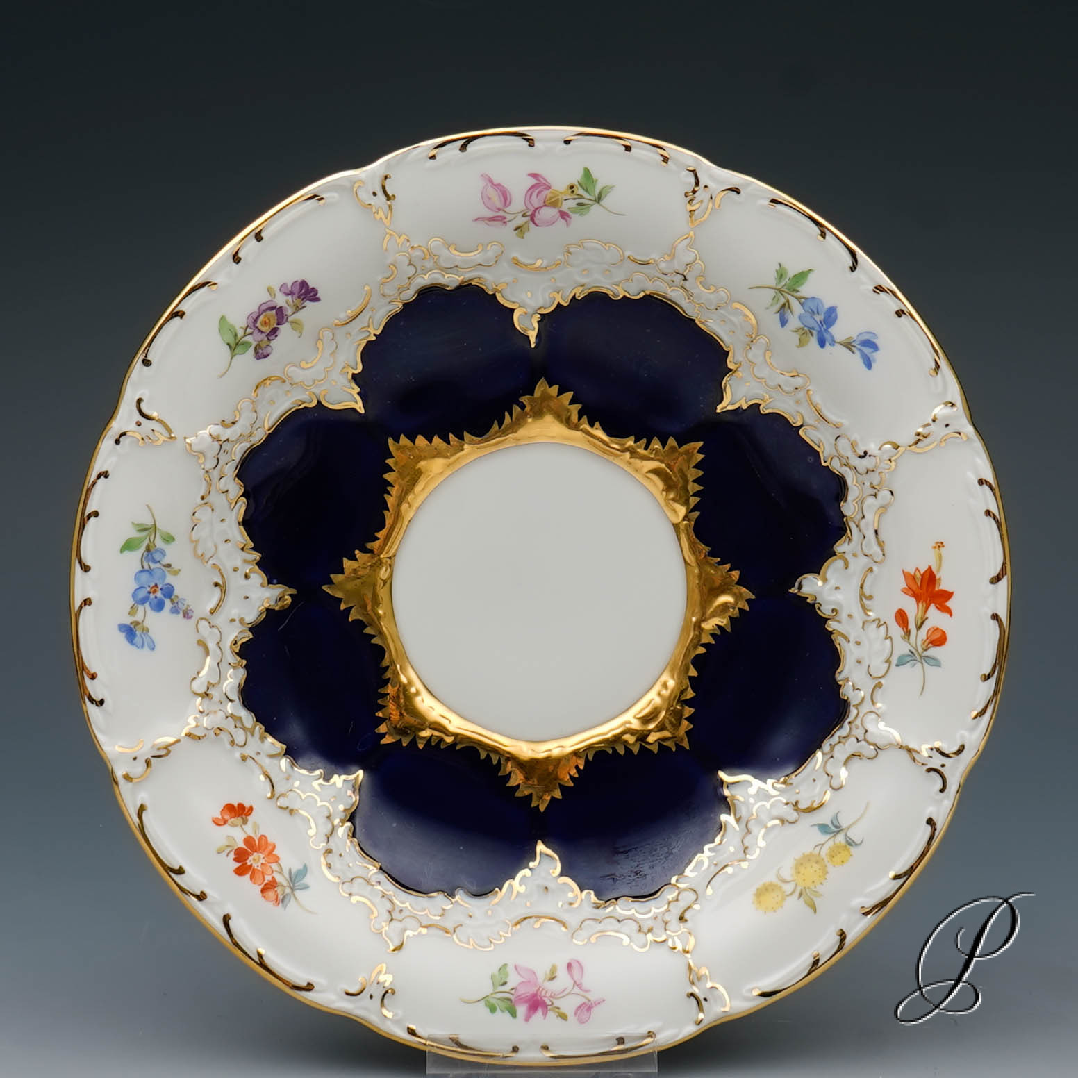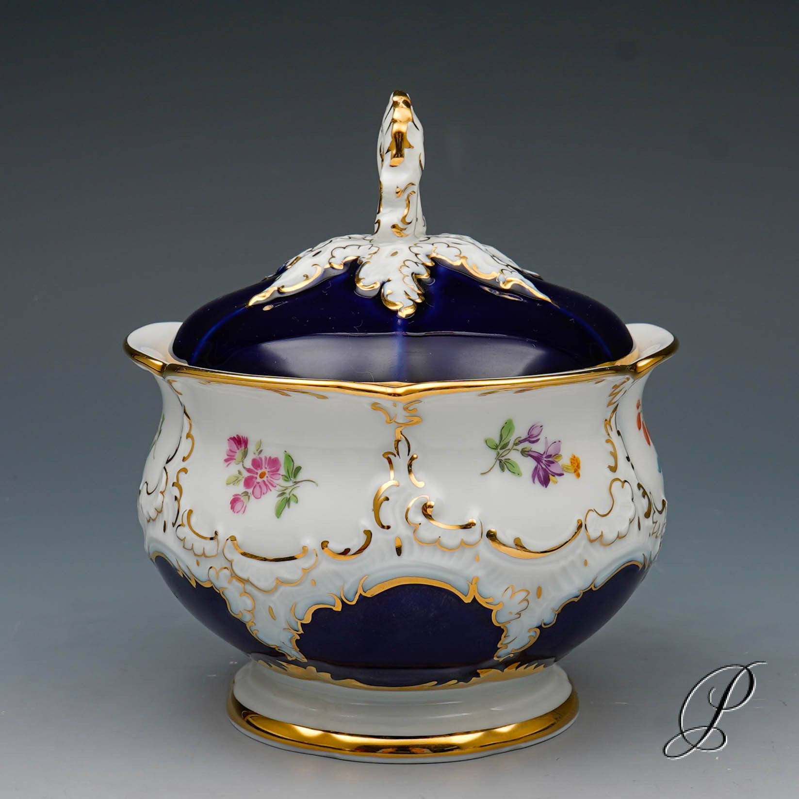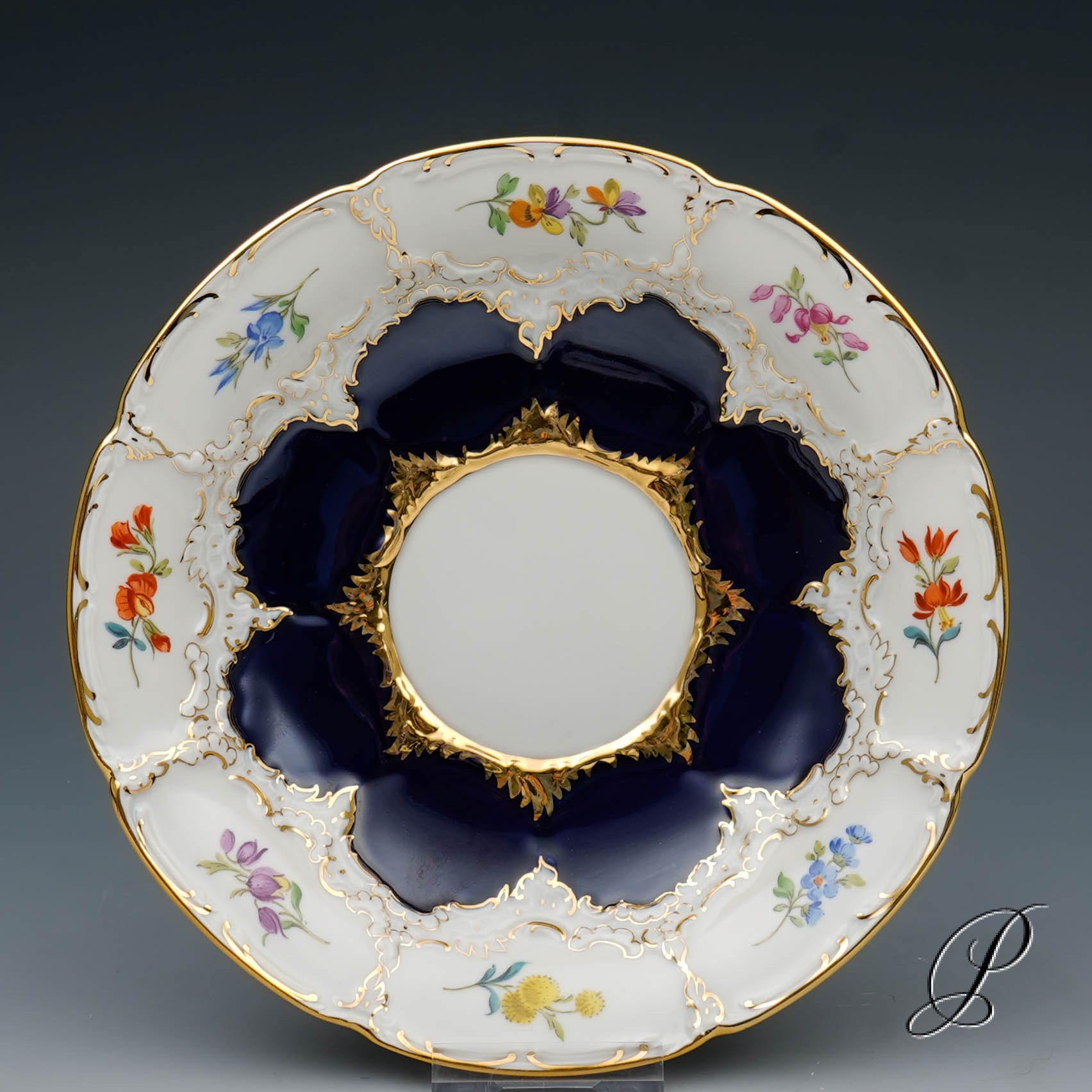 Dekor: gestreute Blümchen bunt, königsblau glasiert und Gold angespitzt. Dekornummer: 011098.