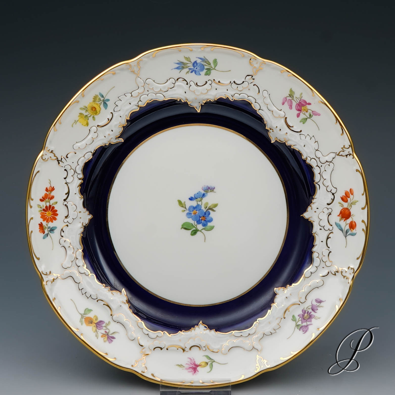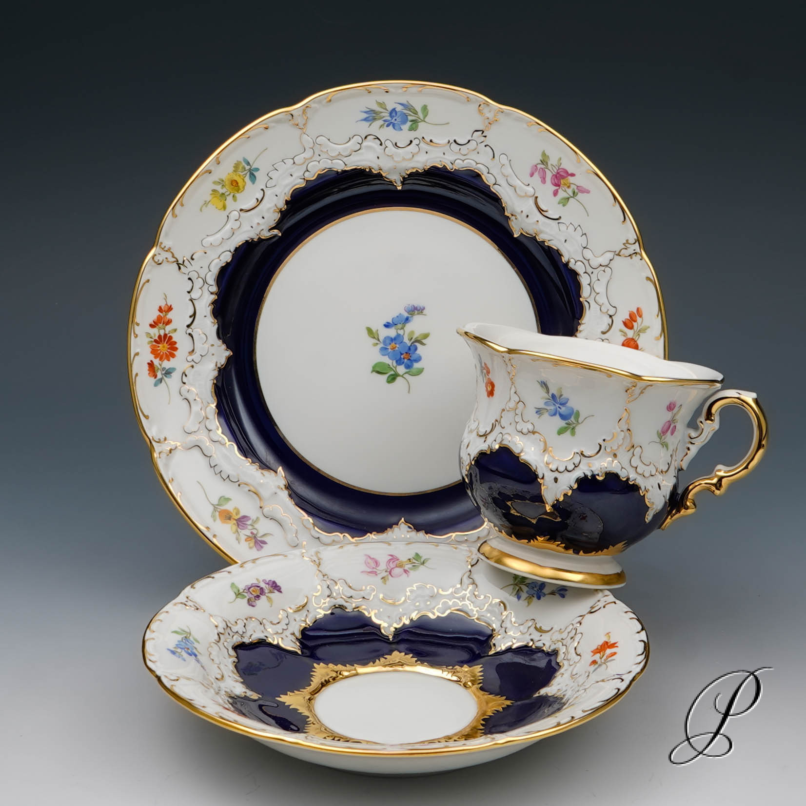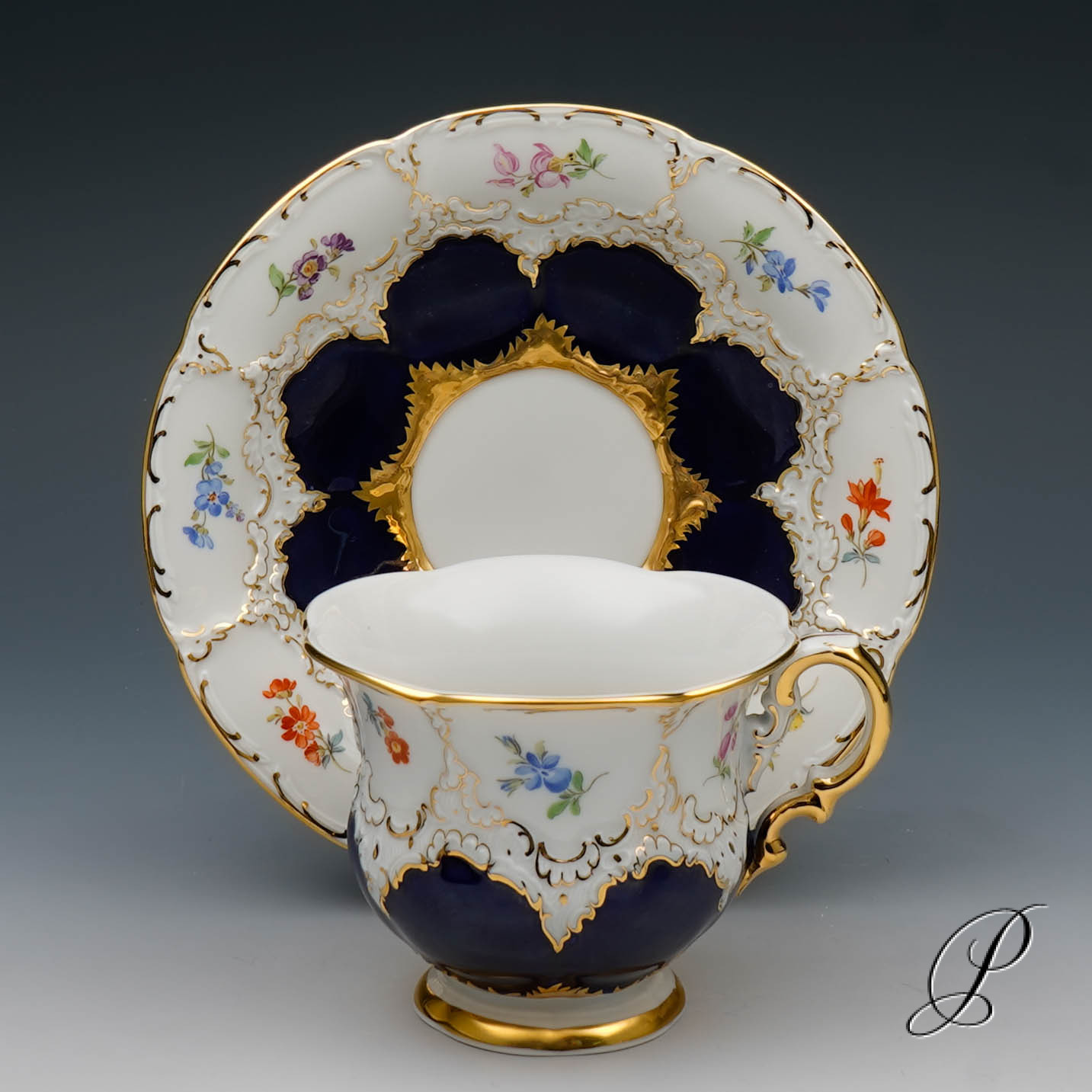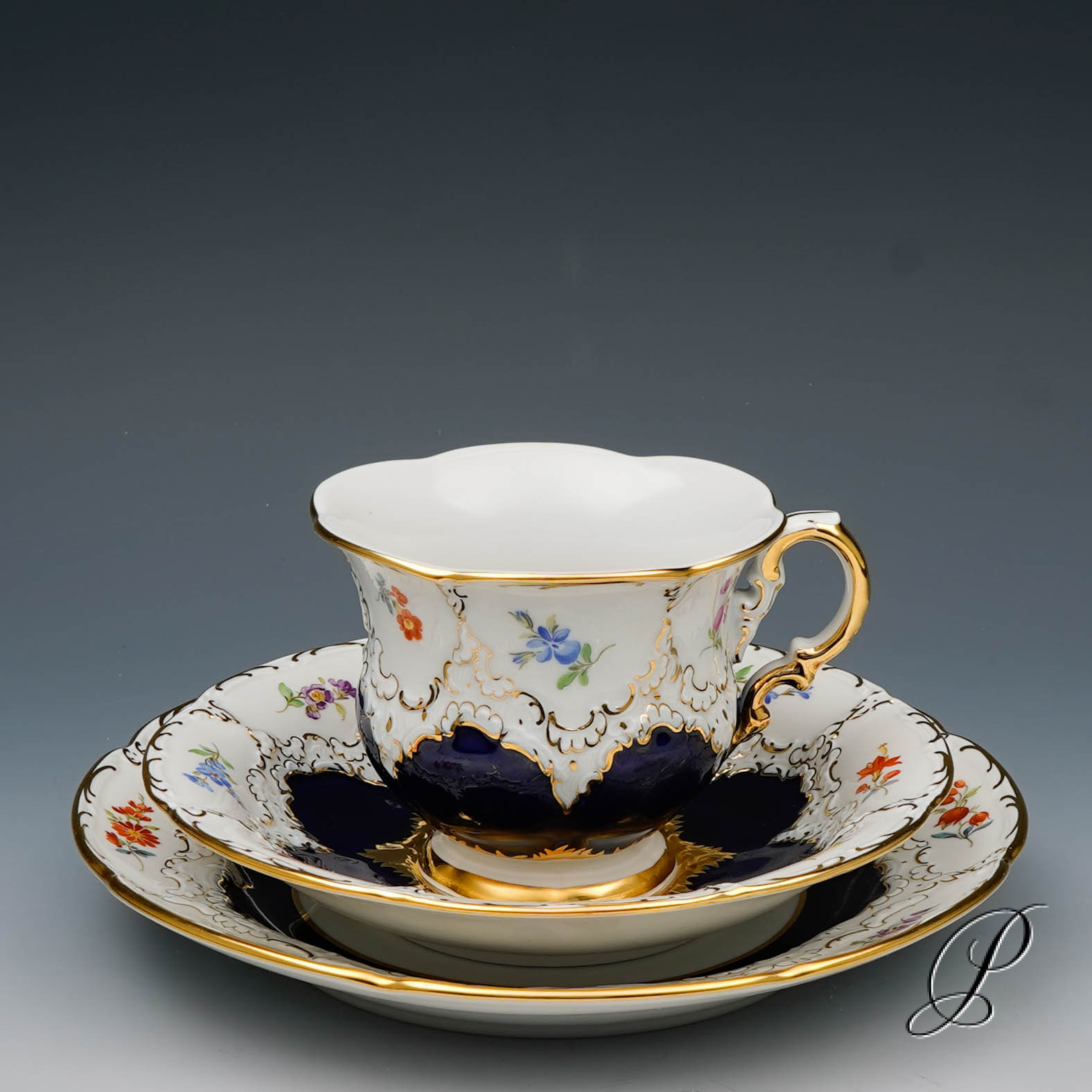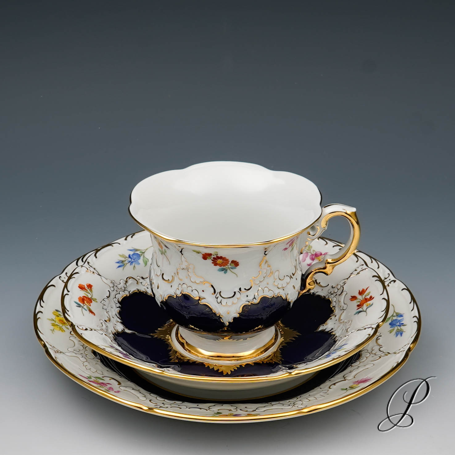 Dekor: gestreute Blümchen bunt, königsblau glasiert und Gold angespitzt. Dekornummer: 011098.