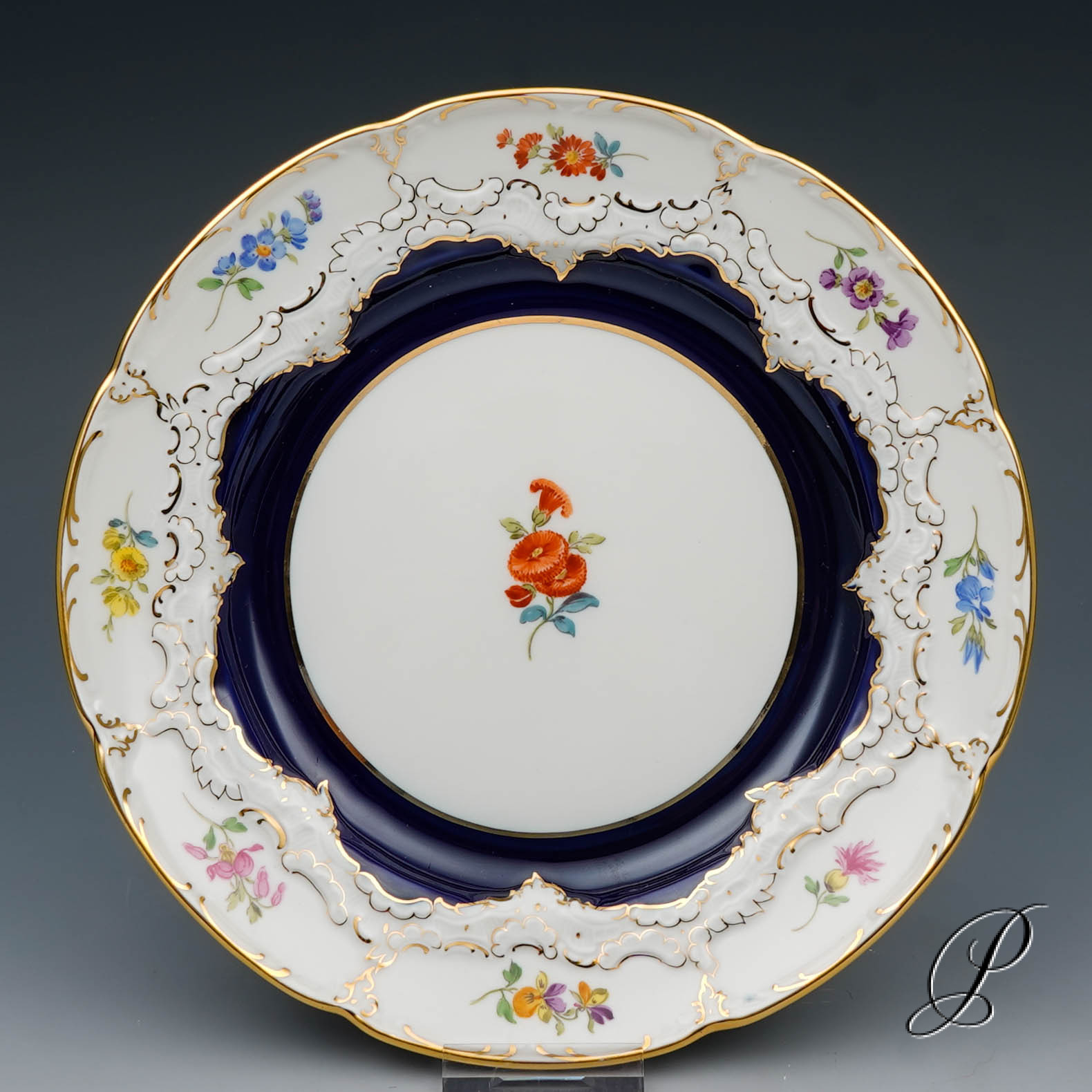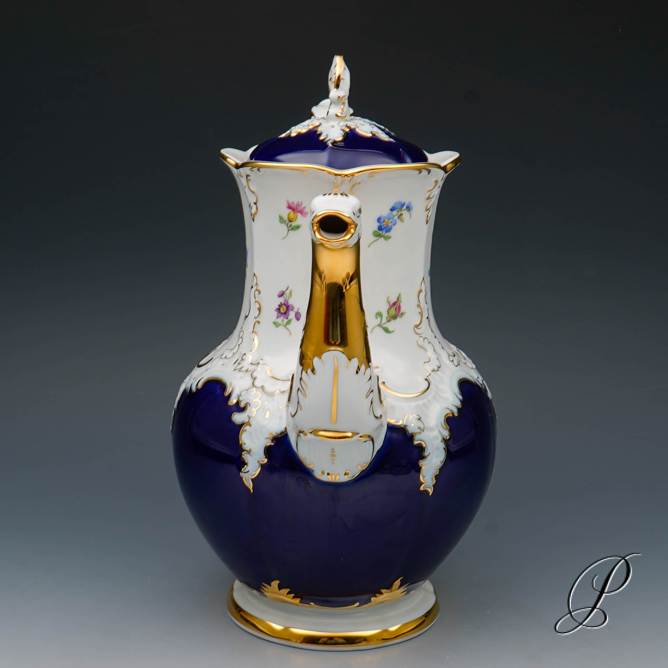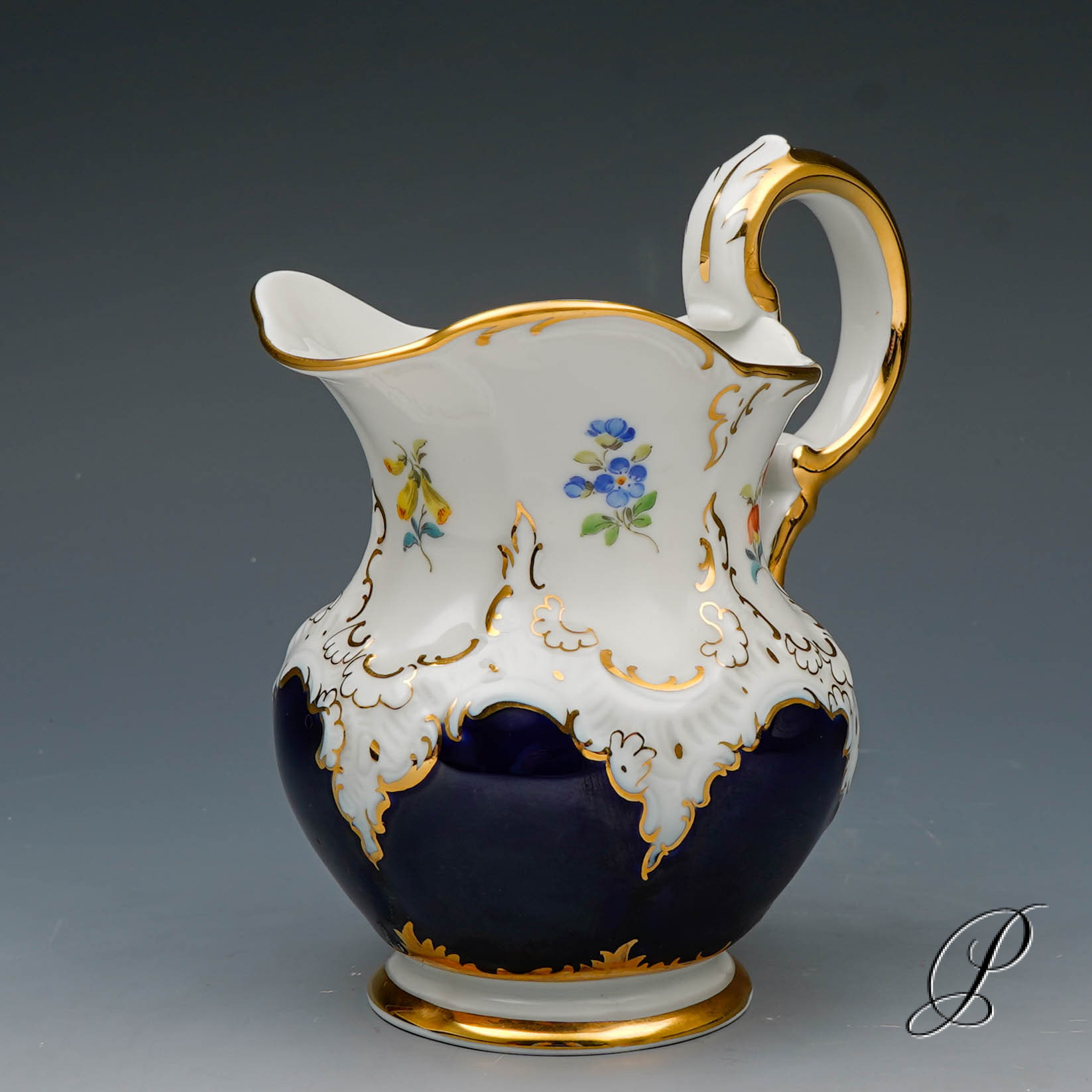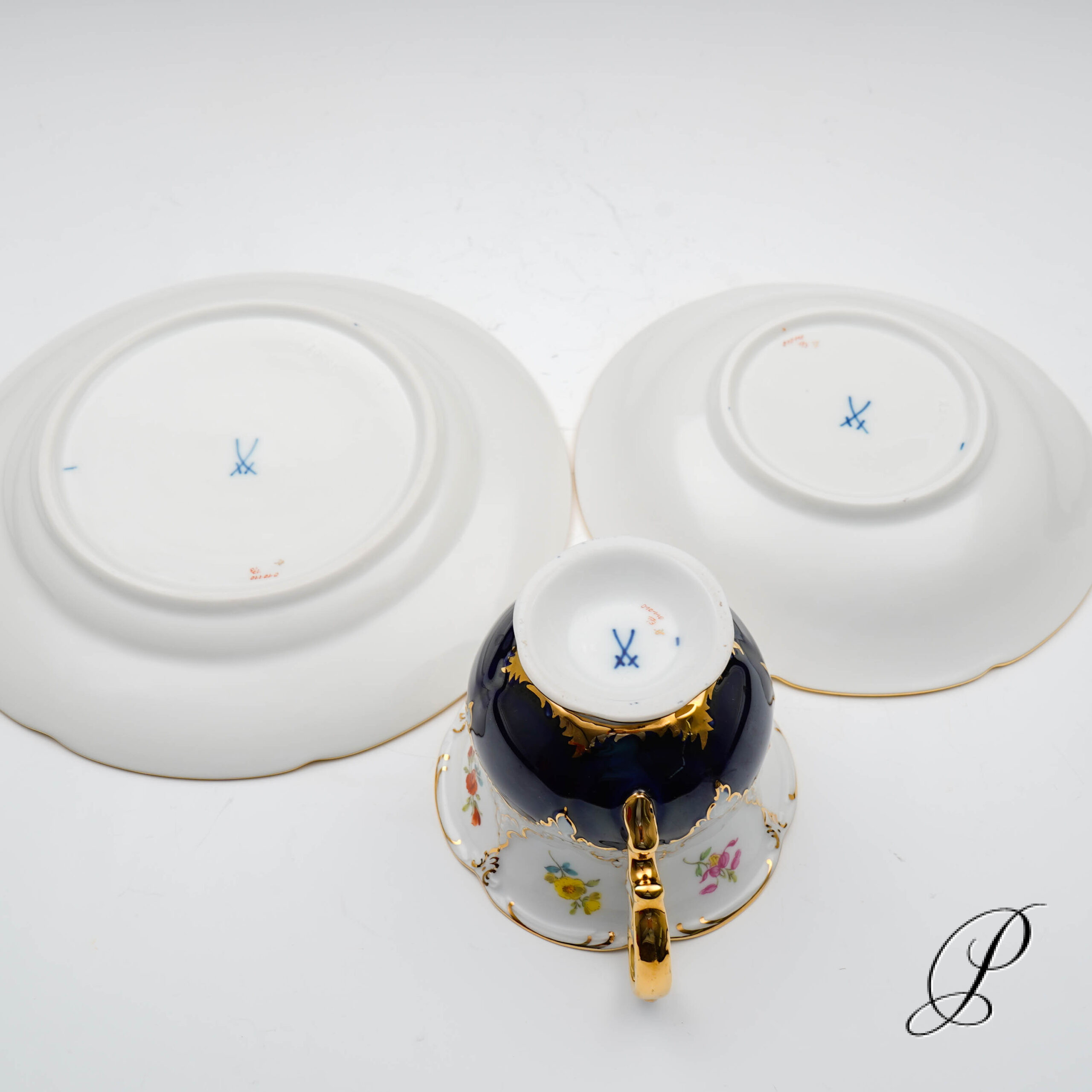 Dekor: gestreute Blümchen bunt, königsblau glasiert und Gold angespitzt. Dekornummer: 011098.