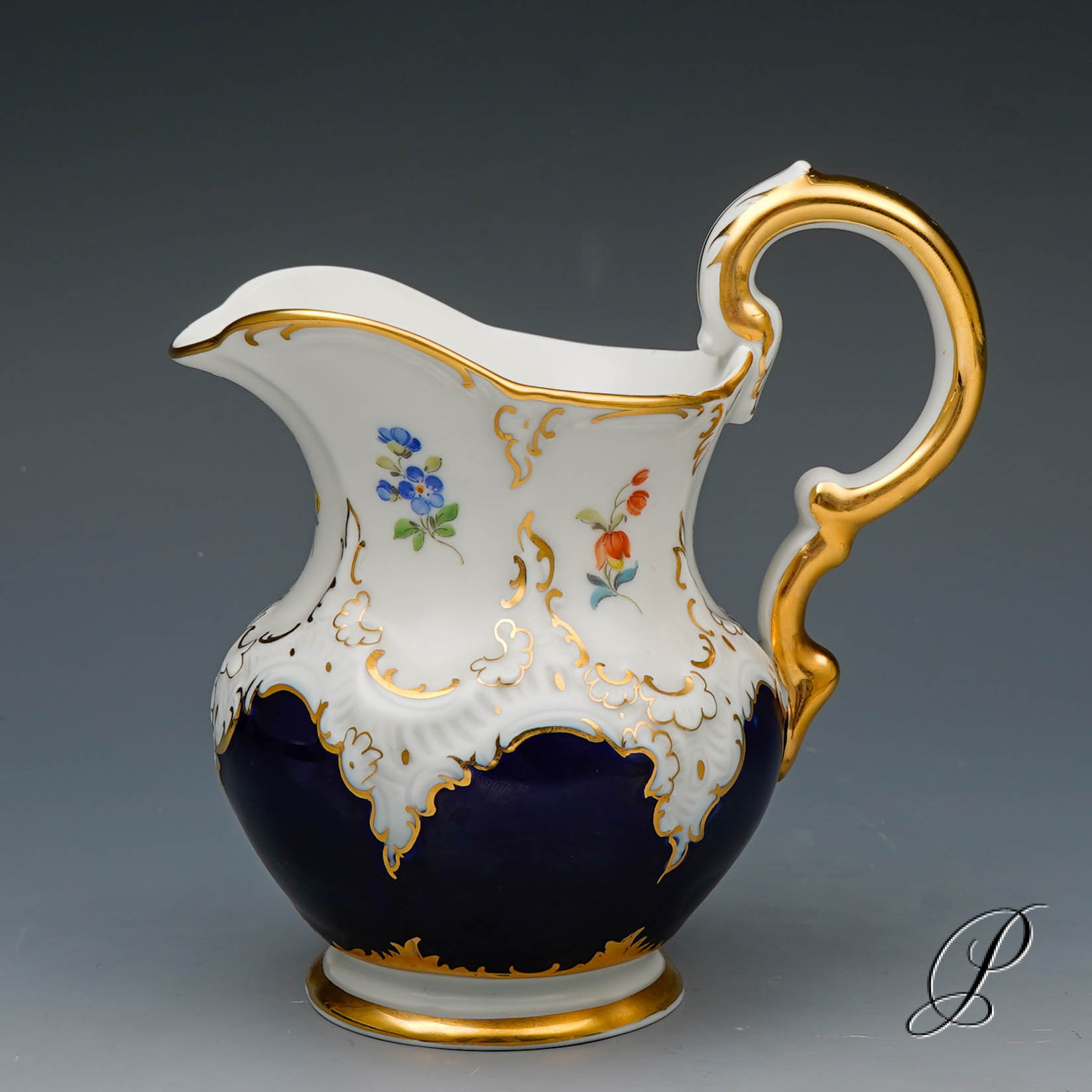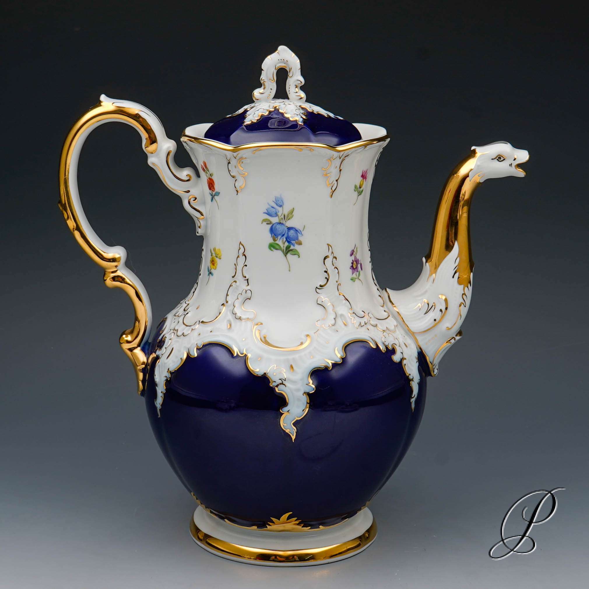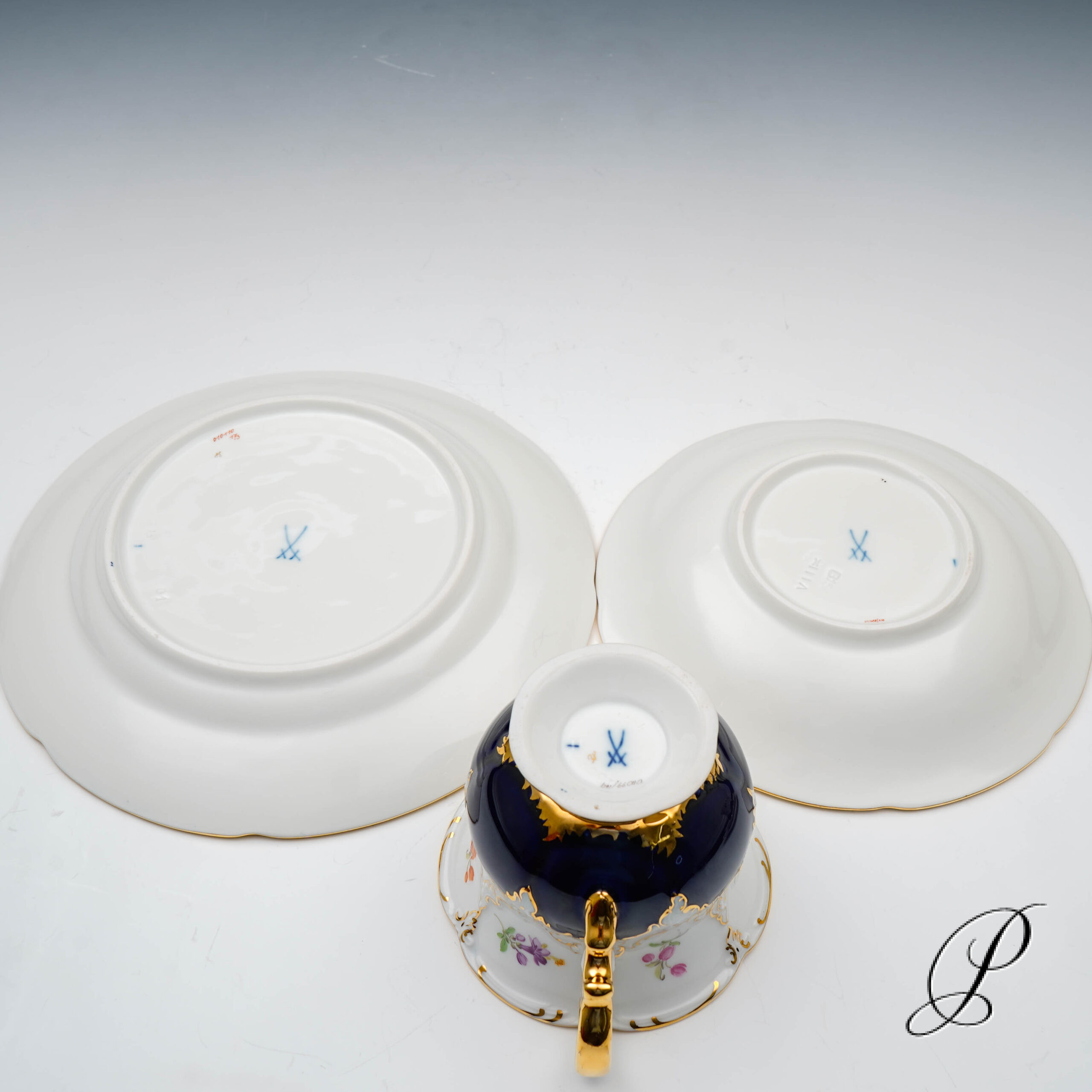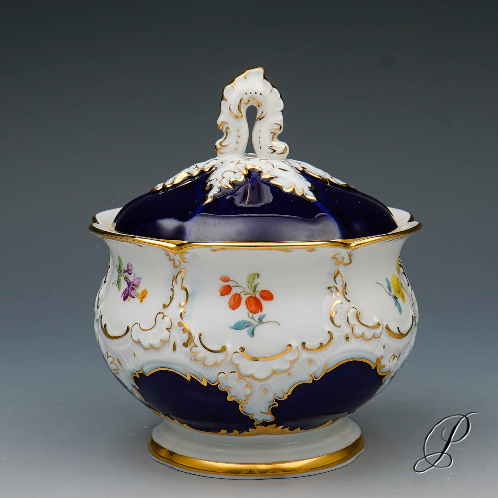 Dekor: gestreute Blümchen bunt, königsblau glasiert und Gold angespitzt. Dekornummer: 011098.