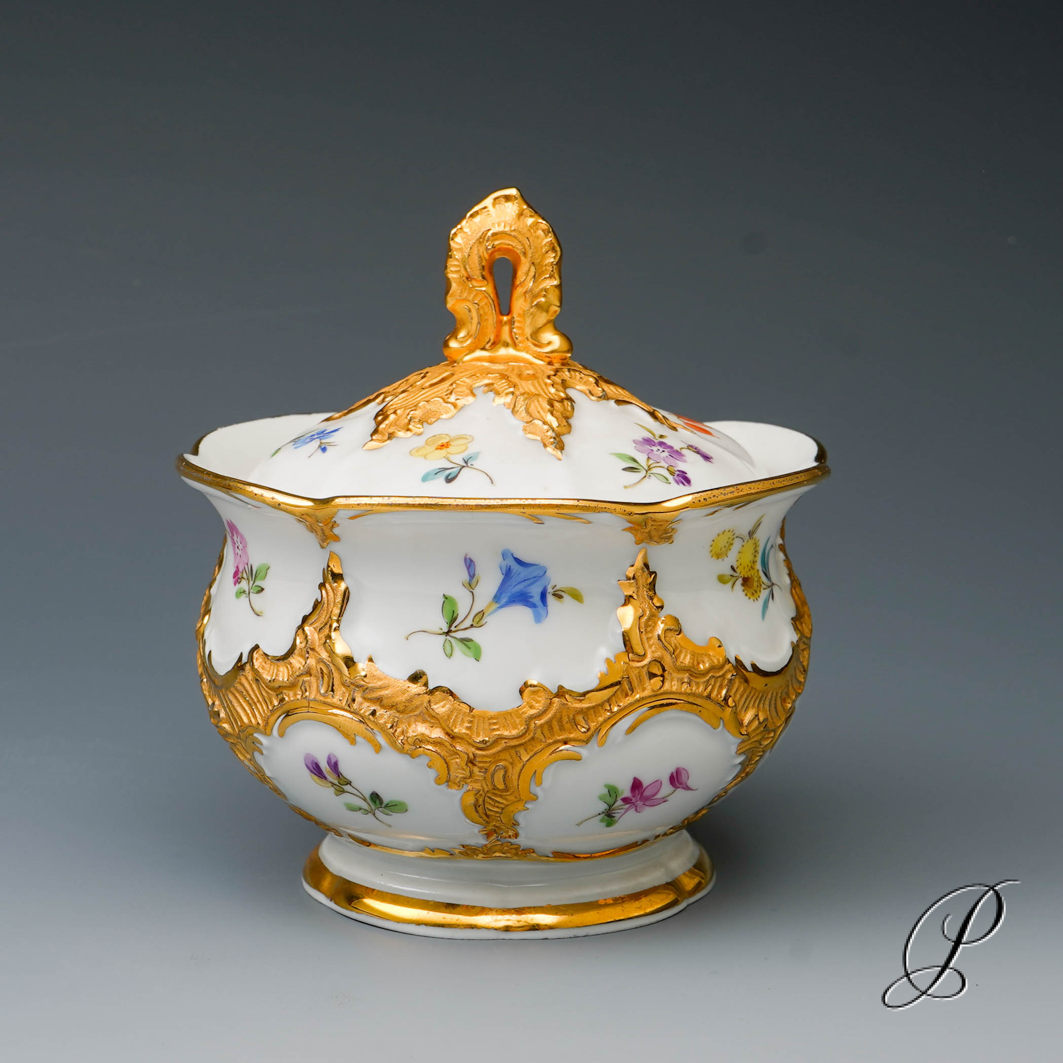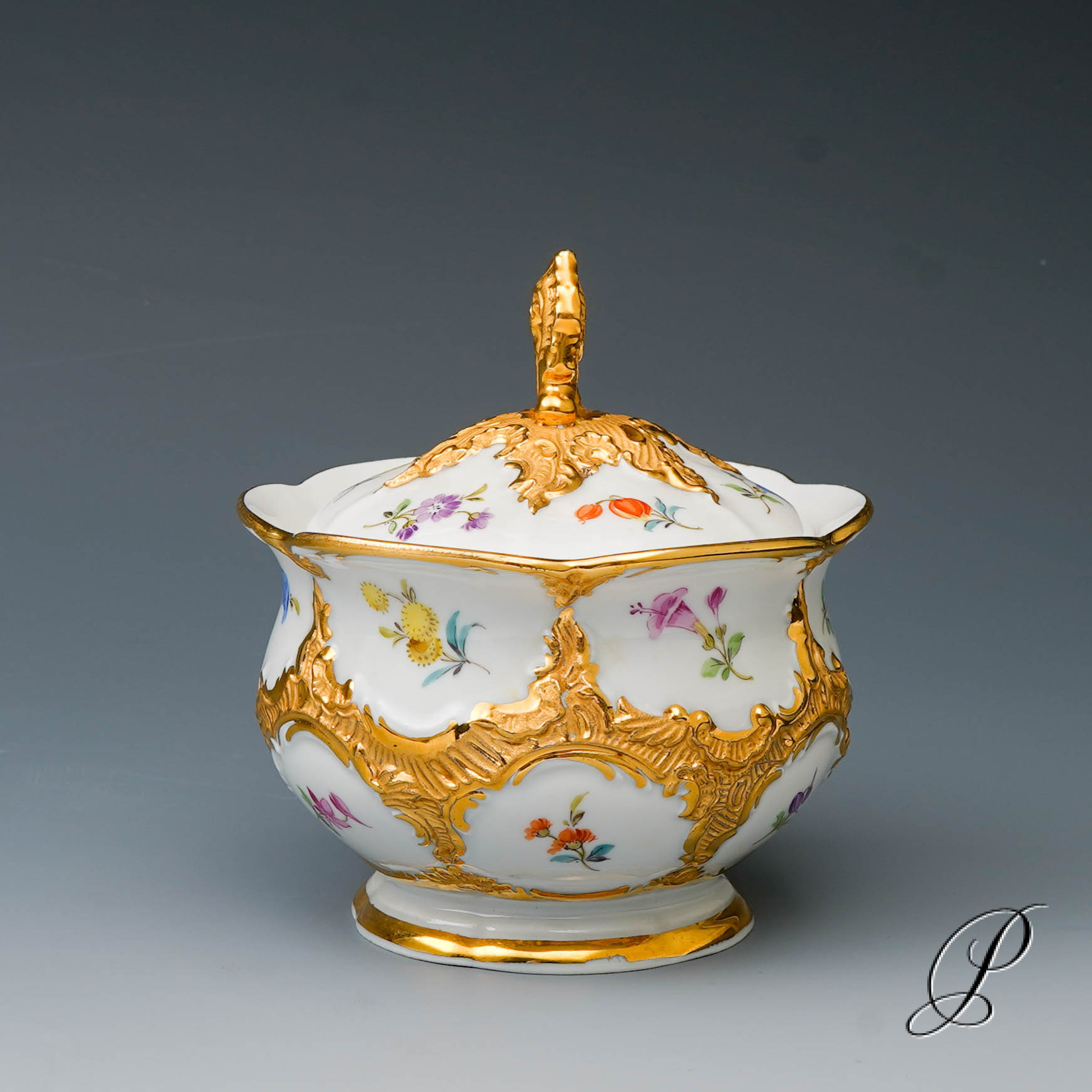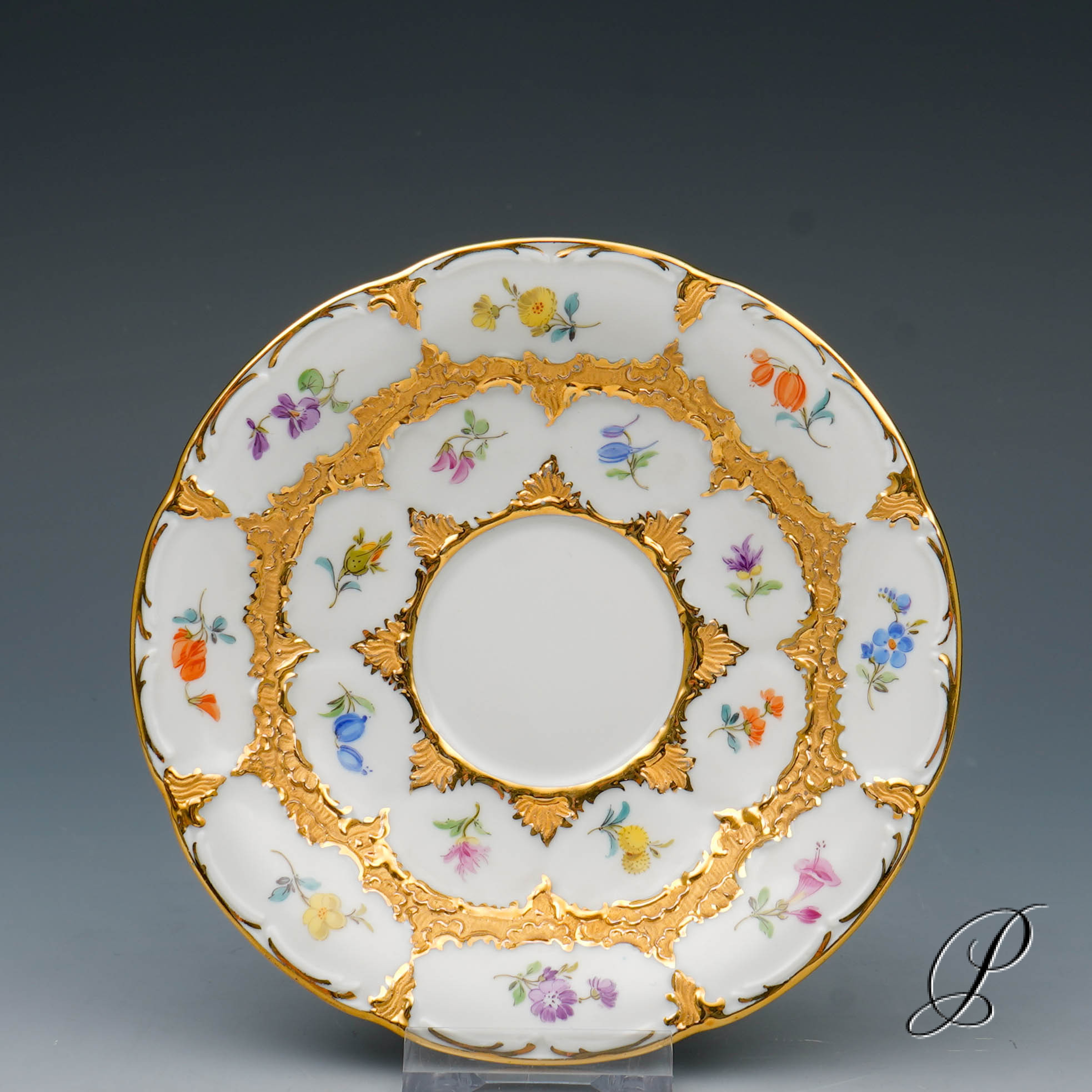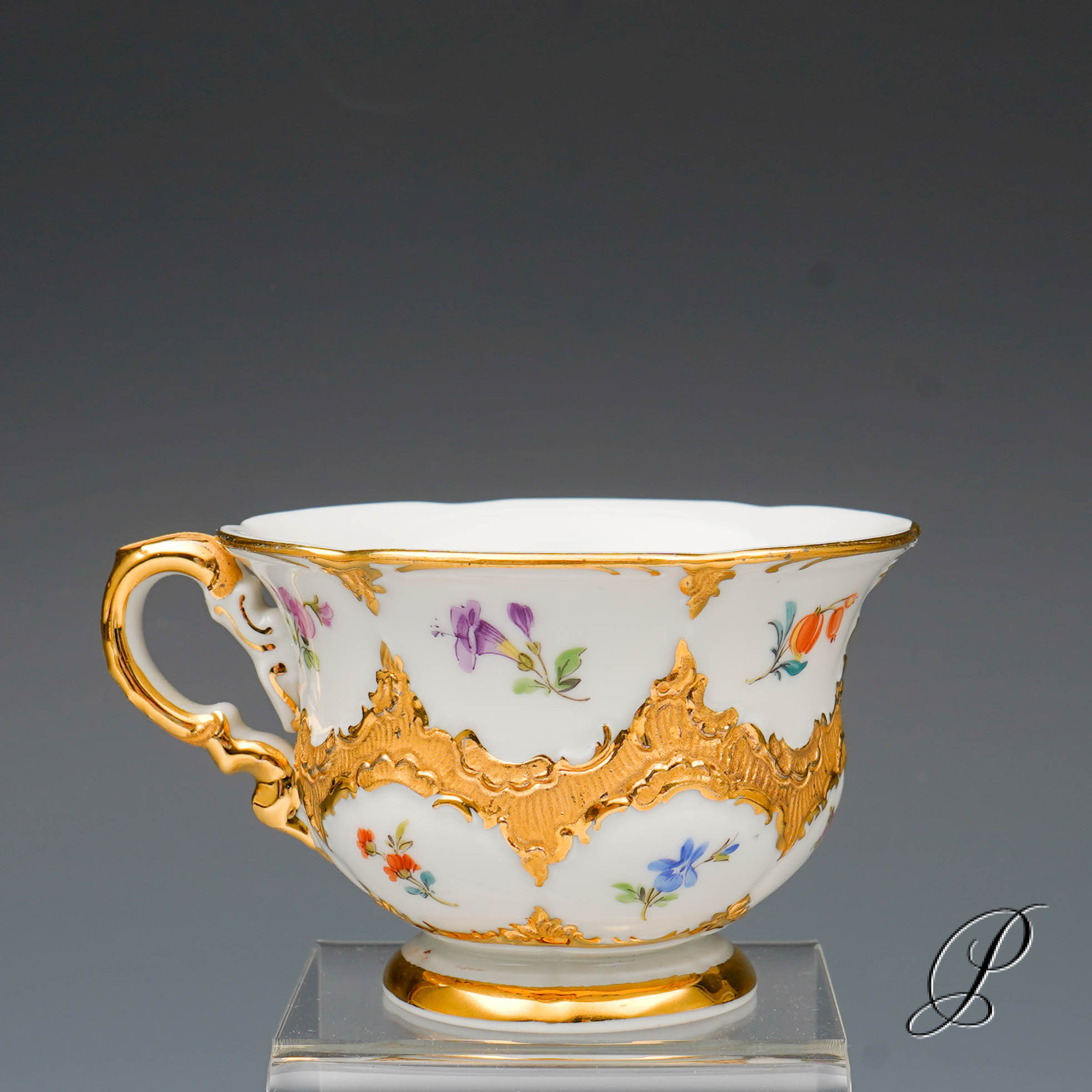 Dekor: B-Form, gestreute Blümchen bunt und Goldbronze.