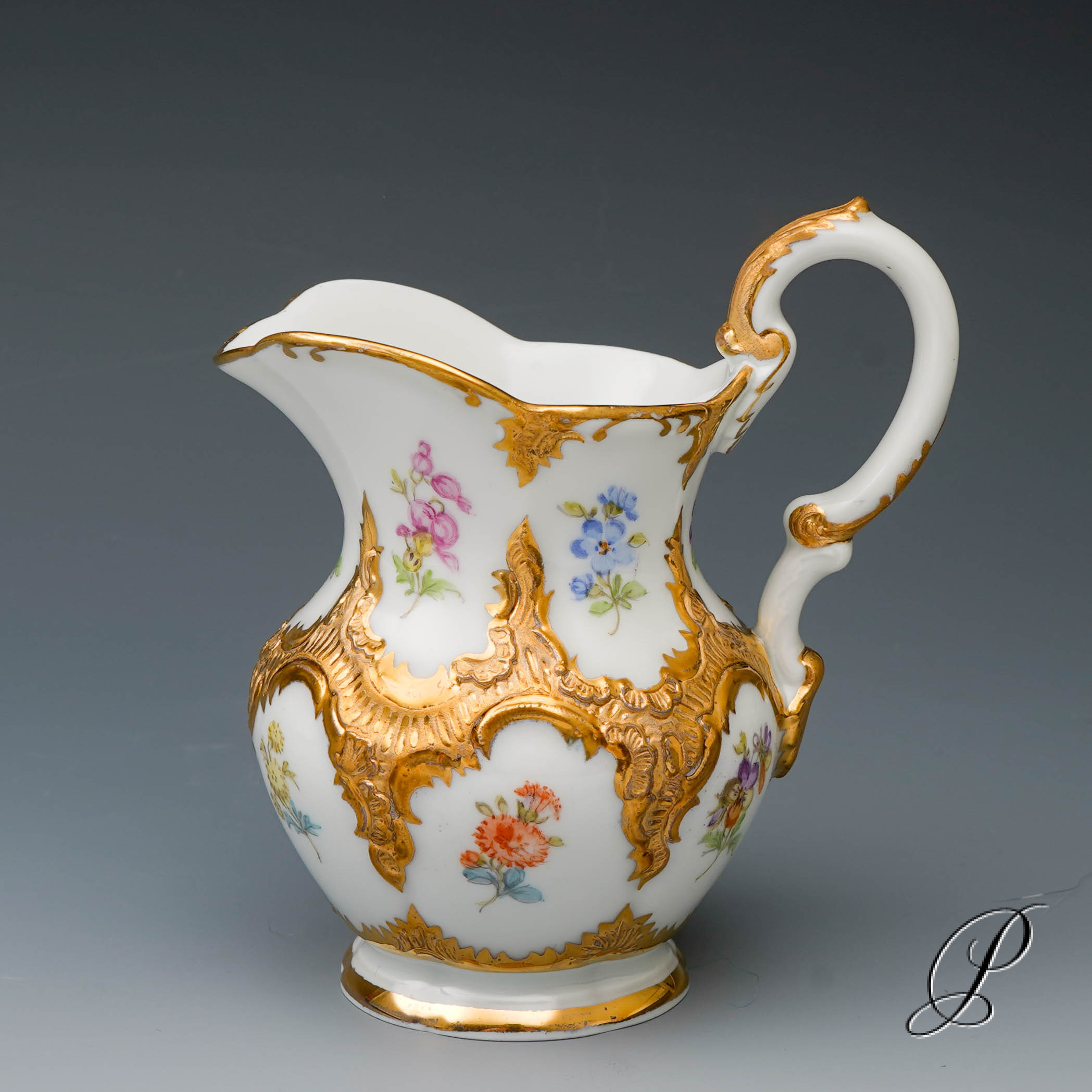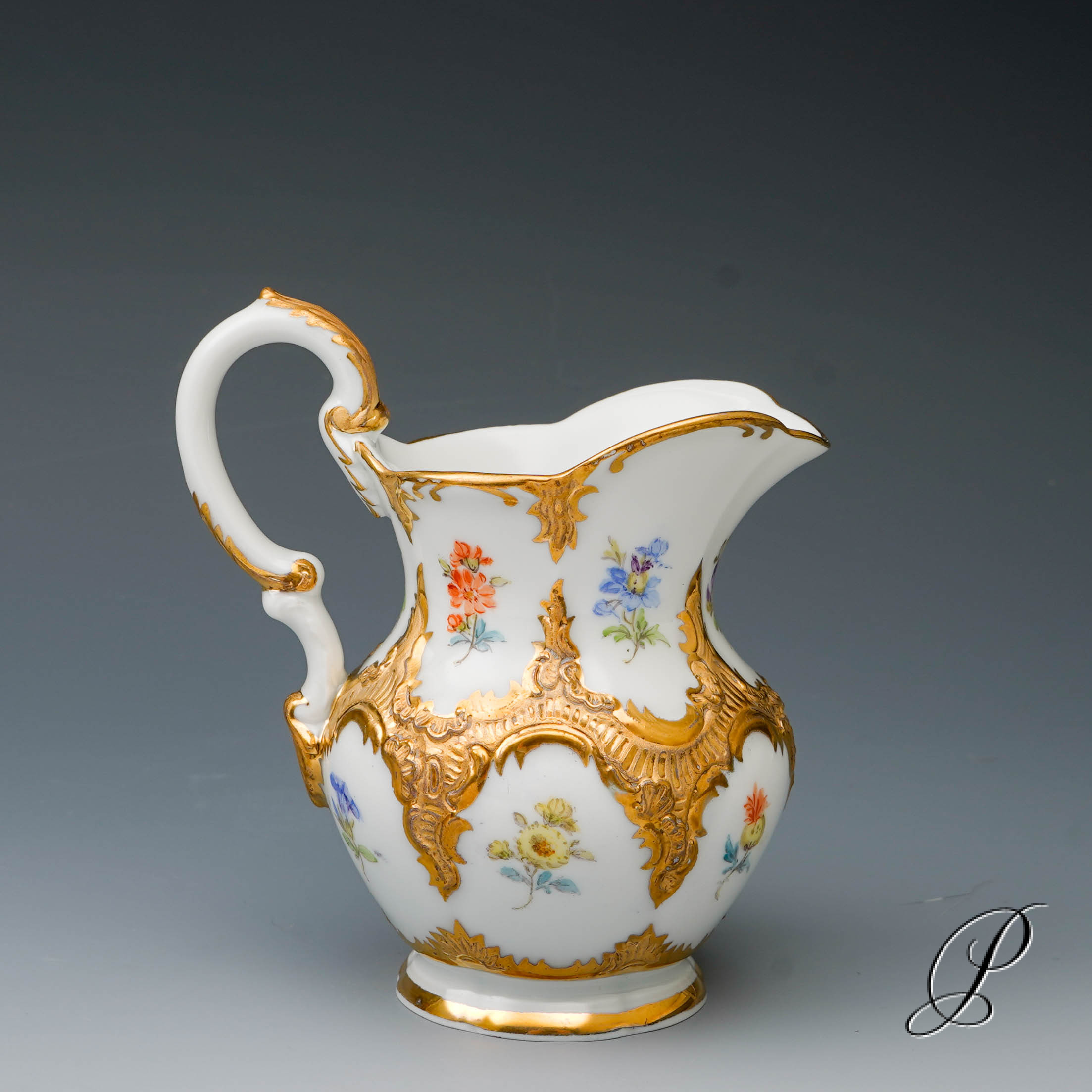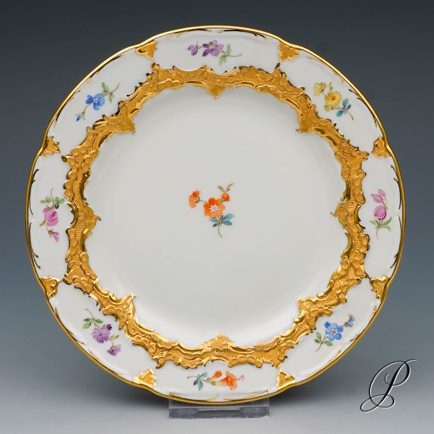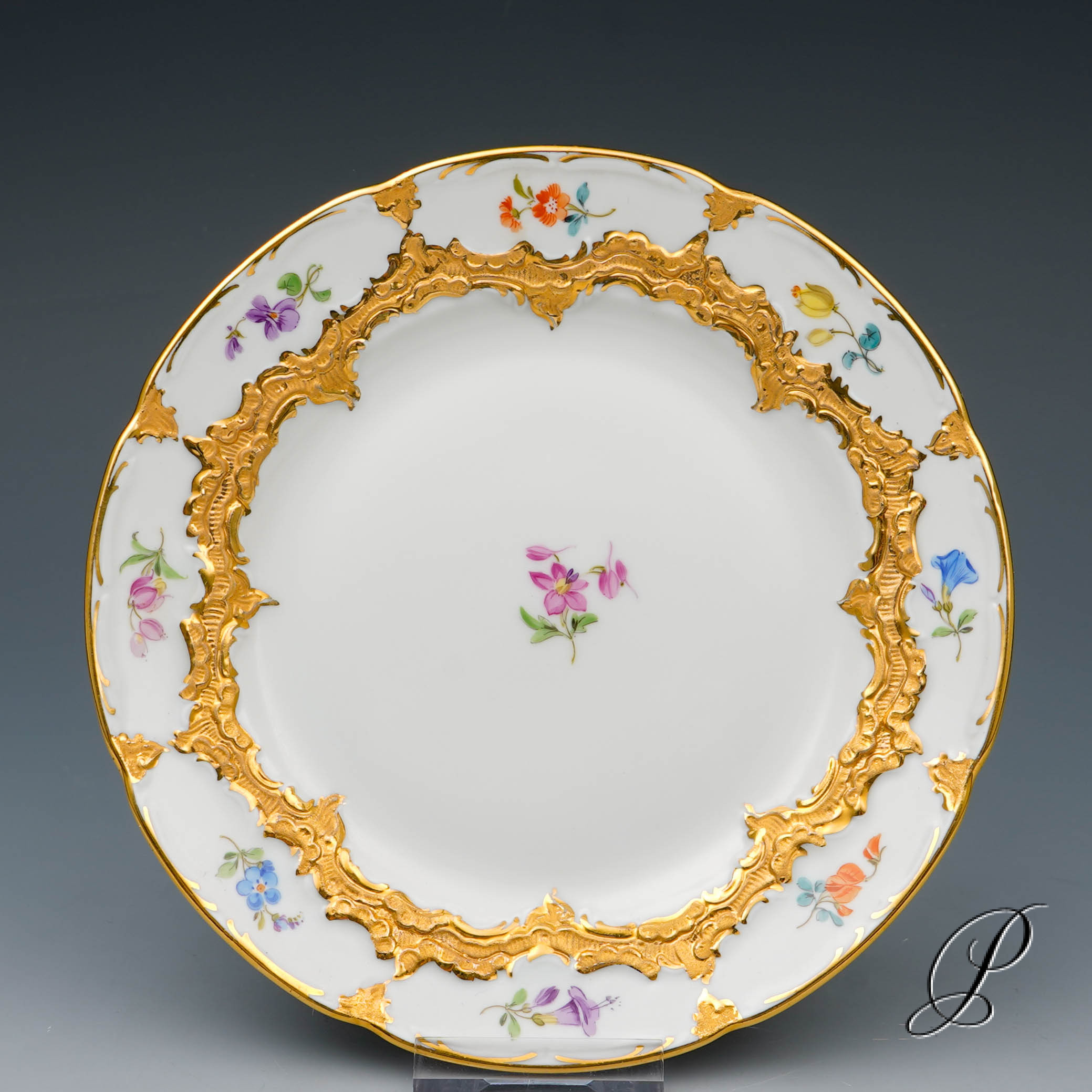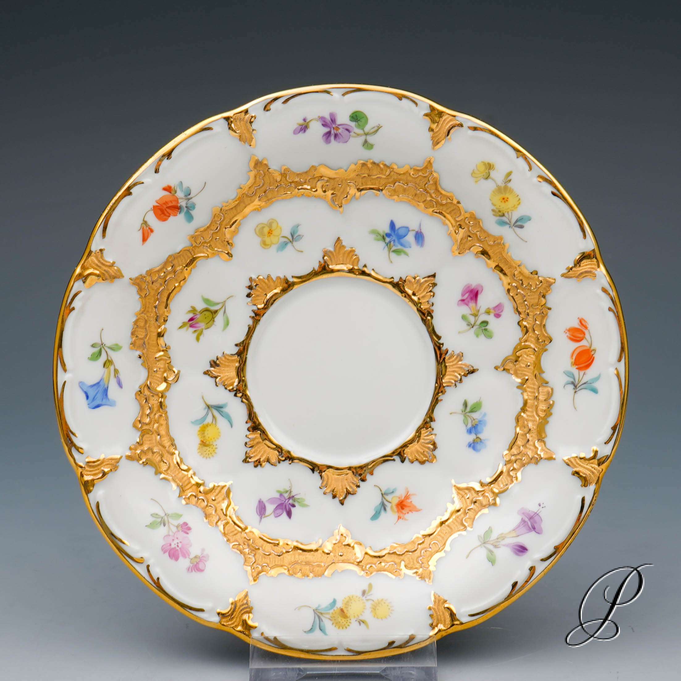 Dekor: B-Form, gestreute Blümchen bunt und Goldbronze.