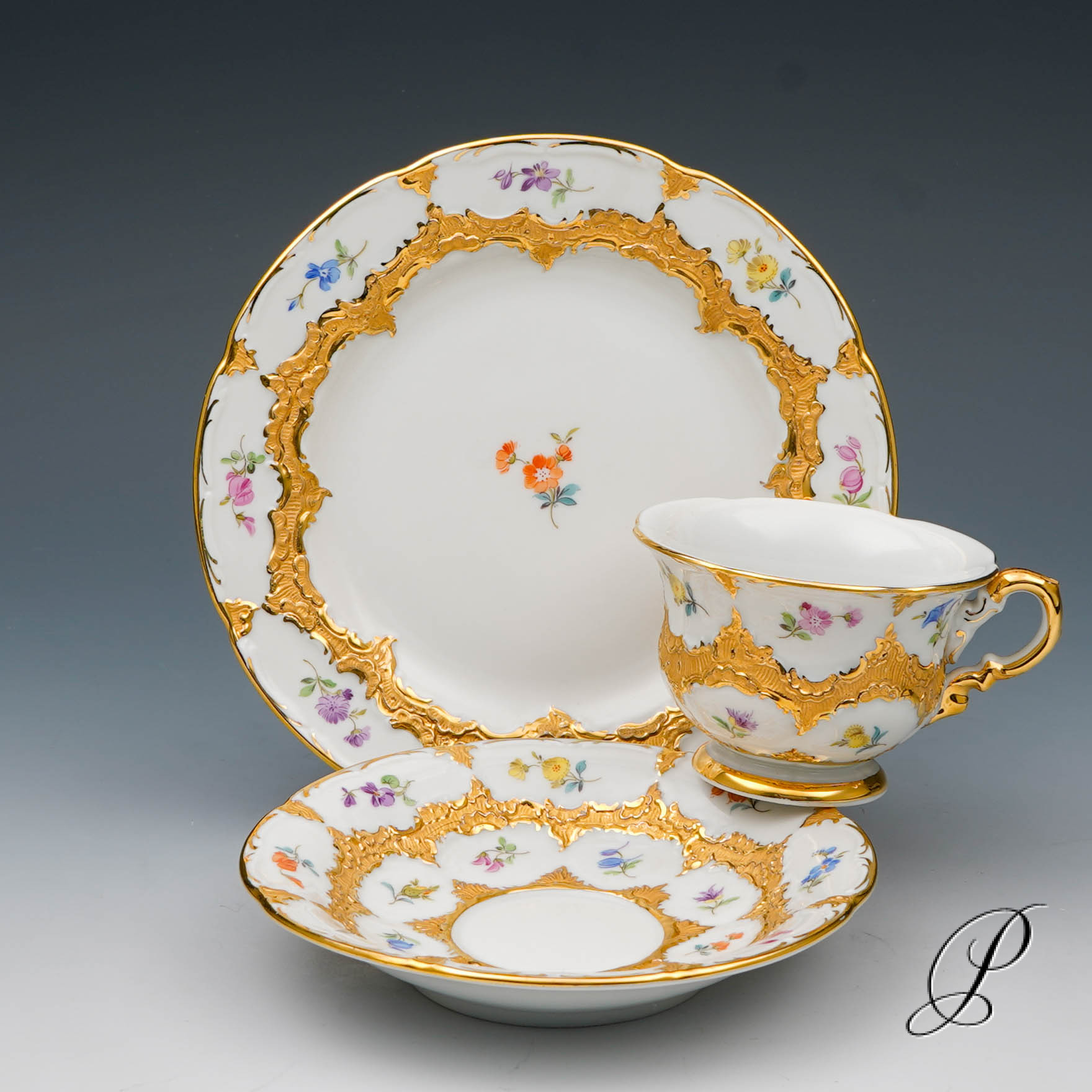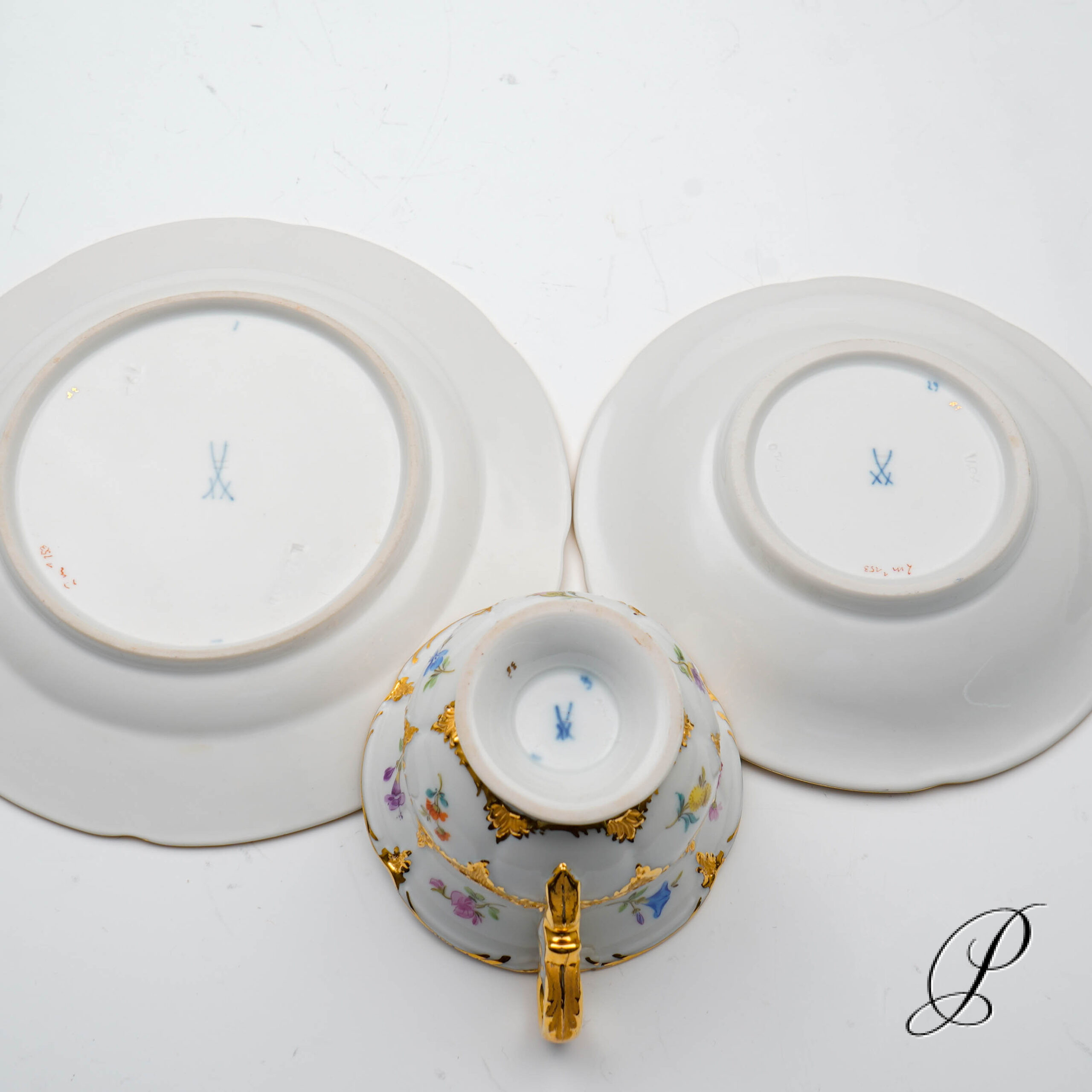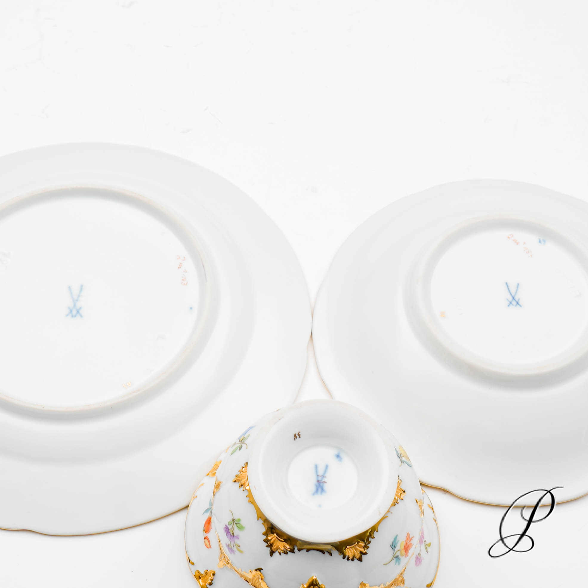 Alle Teile mit der unterglasurblauen Schwertmarke von Meissen mit 2 Schleifstrichen.