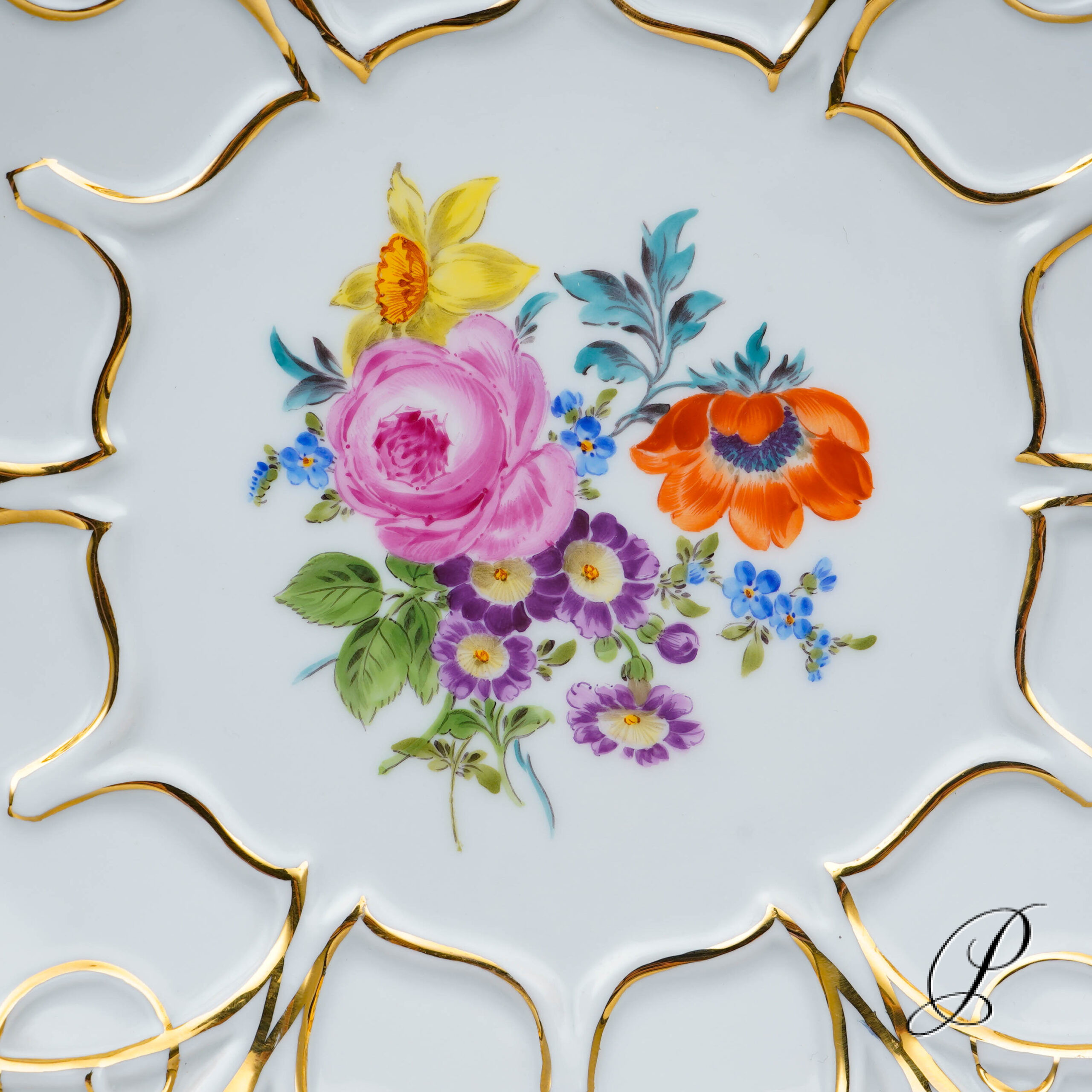 Dieser Prunkteller von Meissen ist ein wahrer Blickfang. Das Dekor zeigt ein wunderschönes Blumenbukett das von Hand gemalt wurde. Die leuchtenden Farben verleihen dem Teller eine besondere Lebendigkeit.