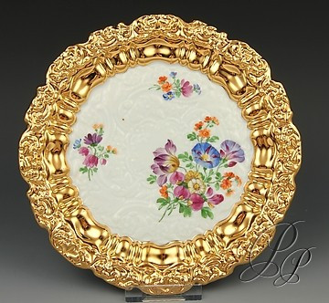 Üppige Vergoldung im Randbereich und ein wunderschön gemaltes Blumenbukett machen diesen Prunkteller zu einer Augenweide. Ein sehr altes Stück aus der Zeit um 1830.