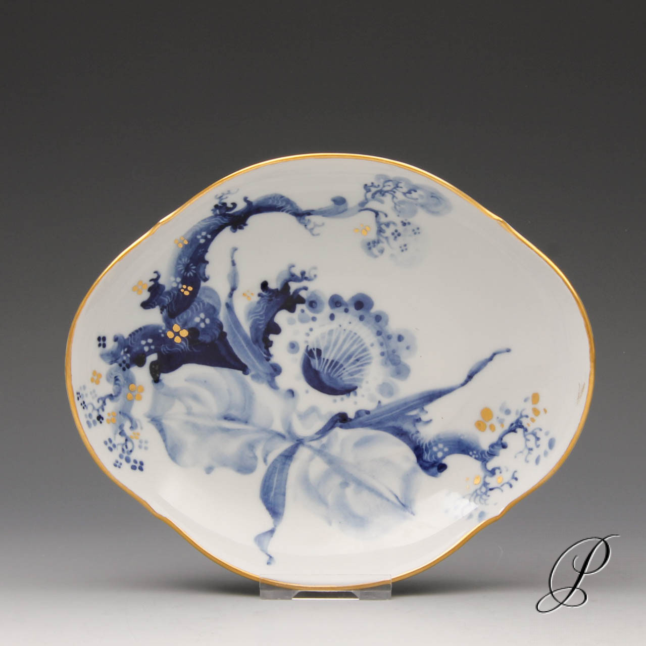 Diese Schale stammt aus dem persönlichen Nachlass von Prof. Heinz Werner. Das Dekor blaue Orchidee mit Goldpunkten zeigt eine kreative Arbeit von Prof. Heinz Werner.