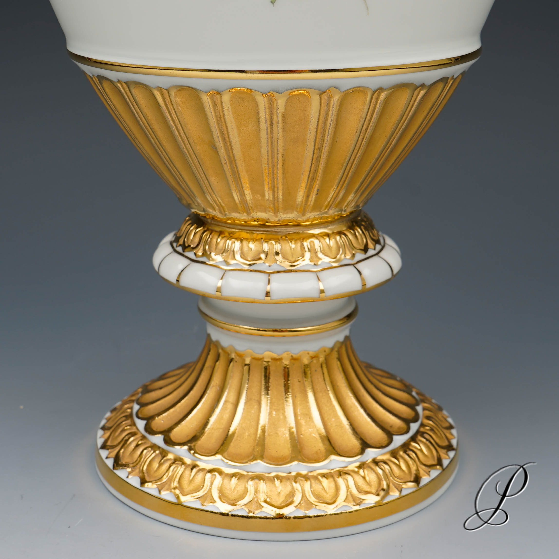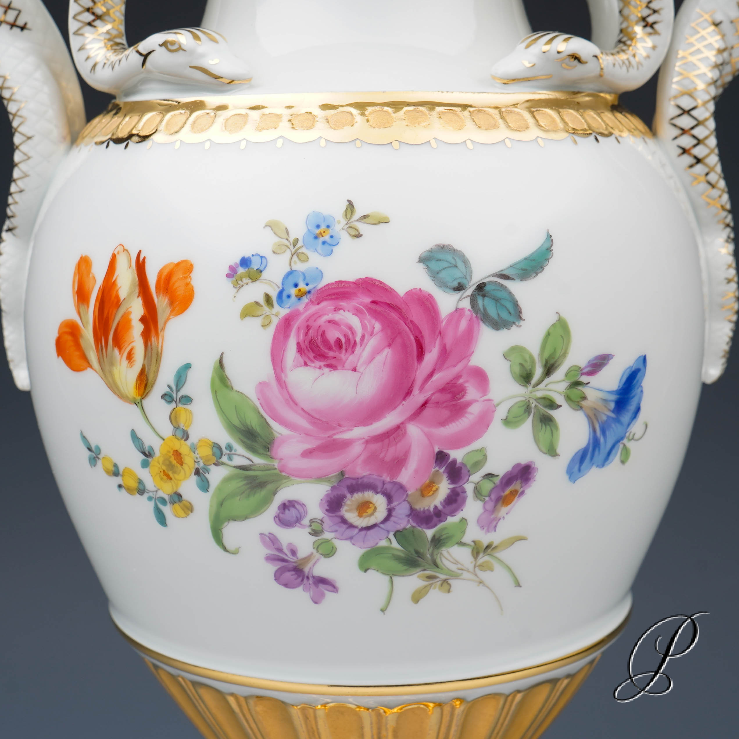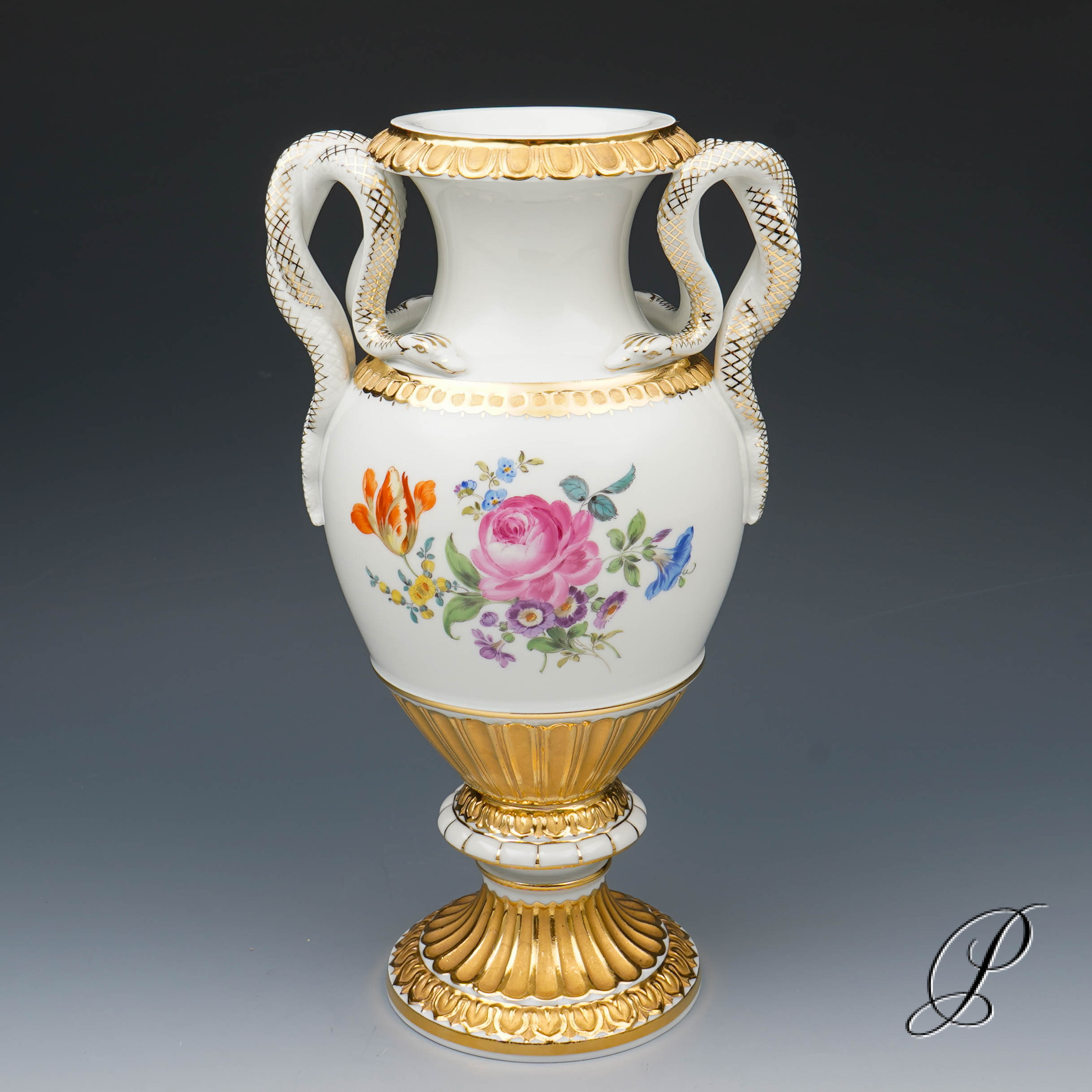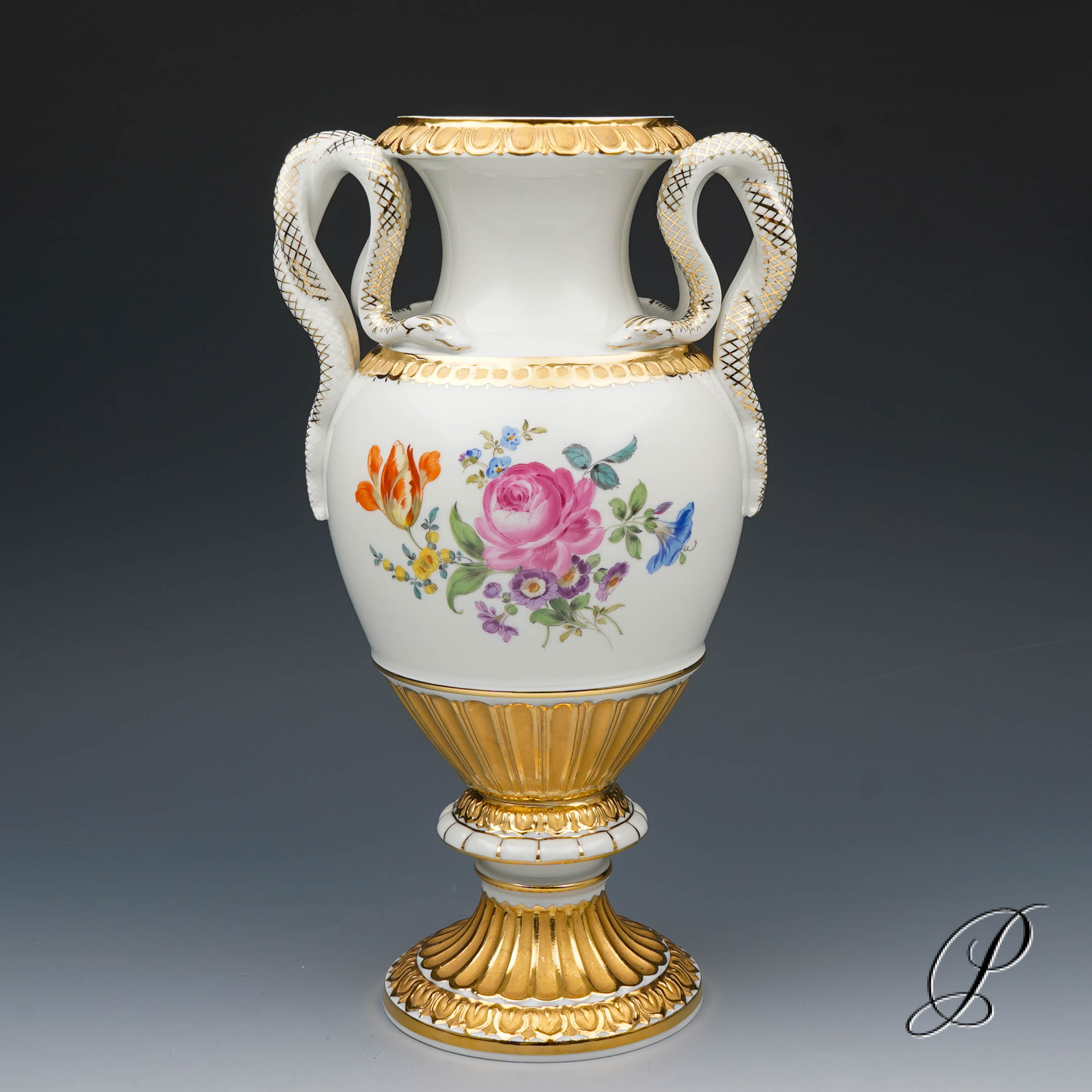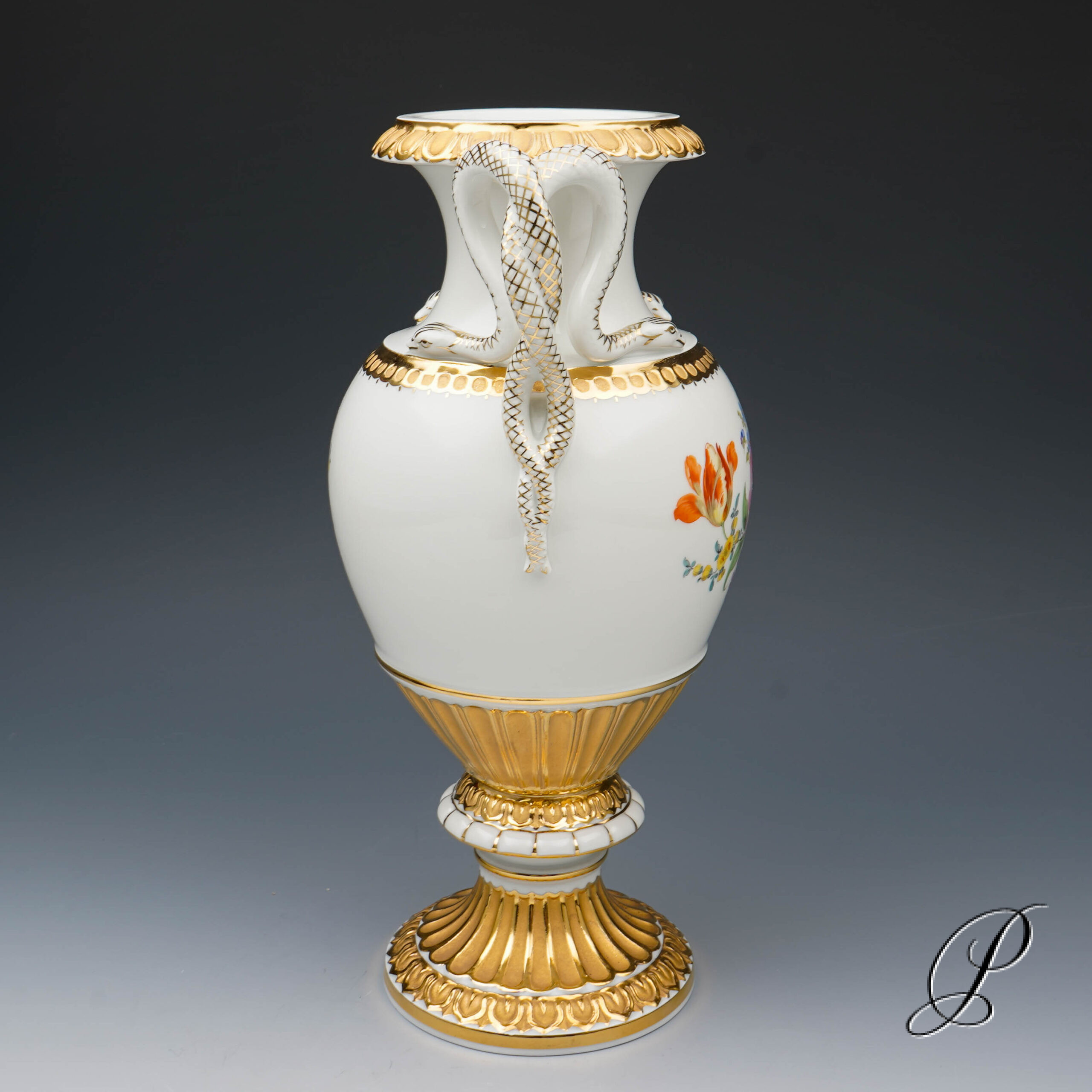 Die seitlichen Schlangenhenkel sind ein auffälliges und einzigartiges Merkmal dieser Vase. Sie unterstreichen die Einzigartigkeit und den kunstvollen Charakter dieses Stücks. Traumhafte Prunkvergoldung.