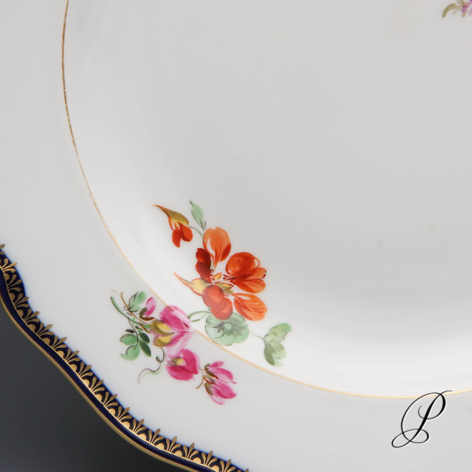 Dekor: A-Kante – Bukett schräg, bunt, Königsblauer Reifen glasiert, Gold A-Kante, Goldrand.