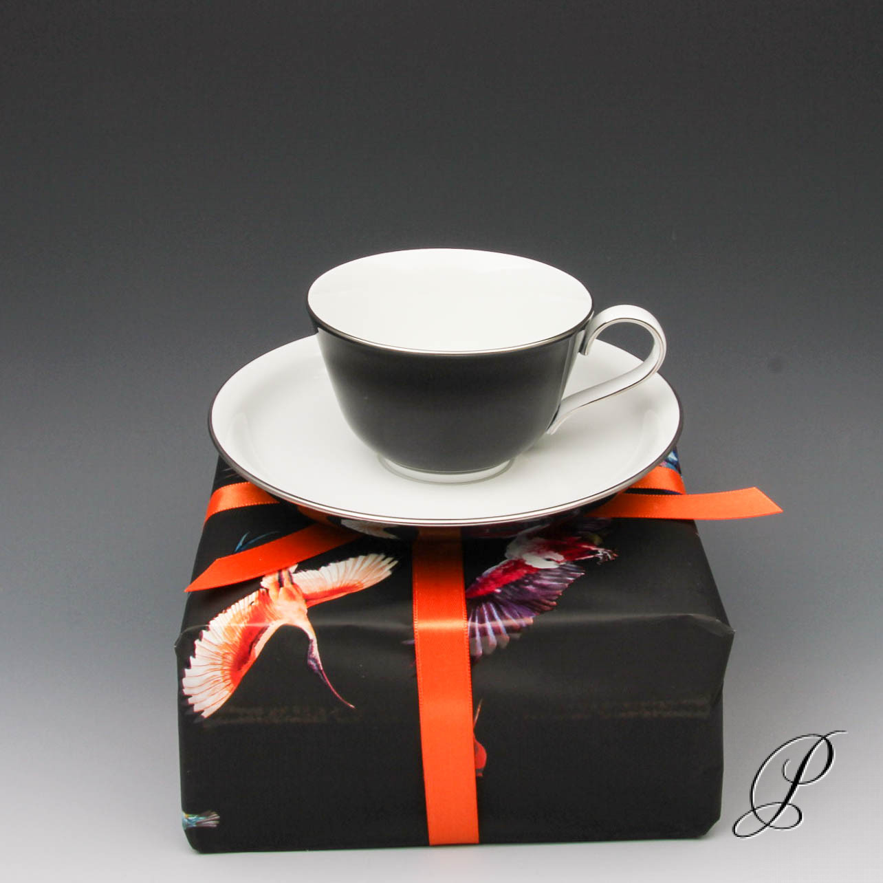 Sehr edel, modern und zeitlos. Schwarzer Fond auf weißem Scherben mit Platinrand.