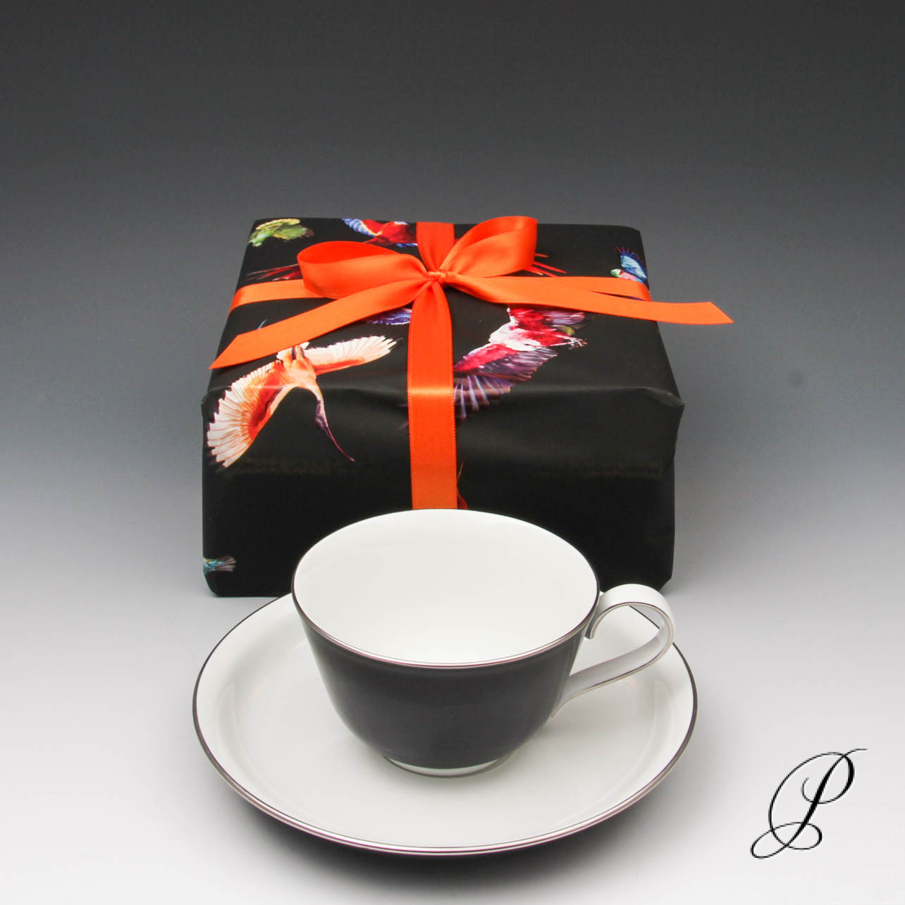 Sehr edel, modern und zeitlos. Schwarzer Fond auf weißem Scherben mit Platinrand.