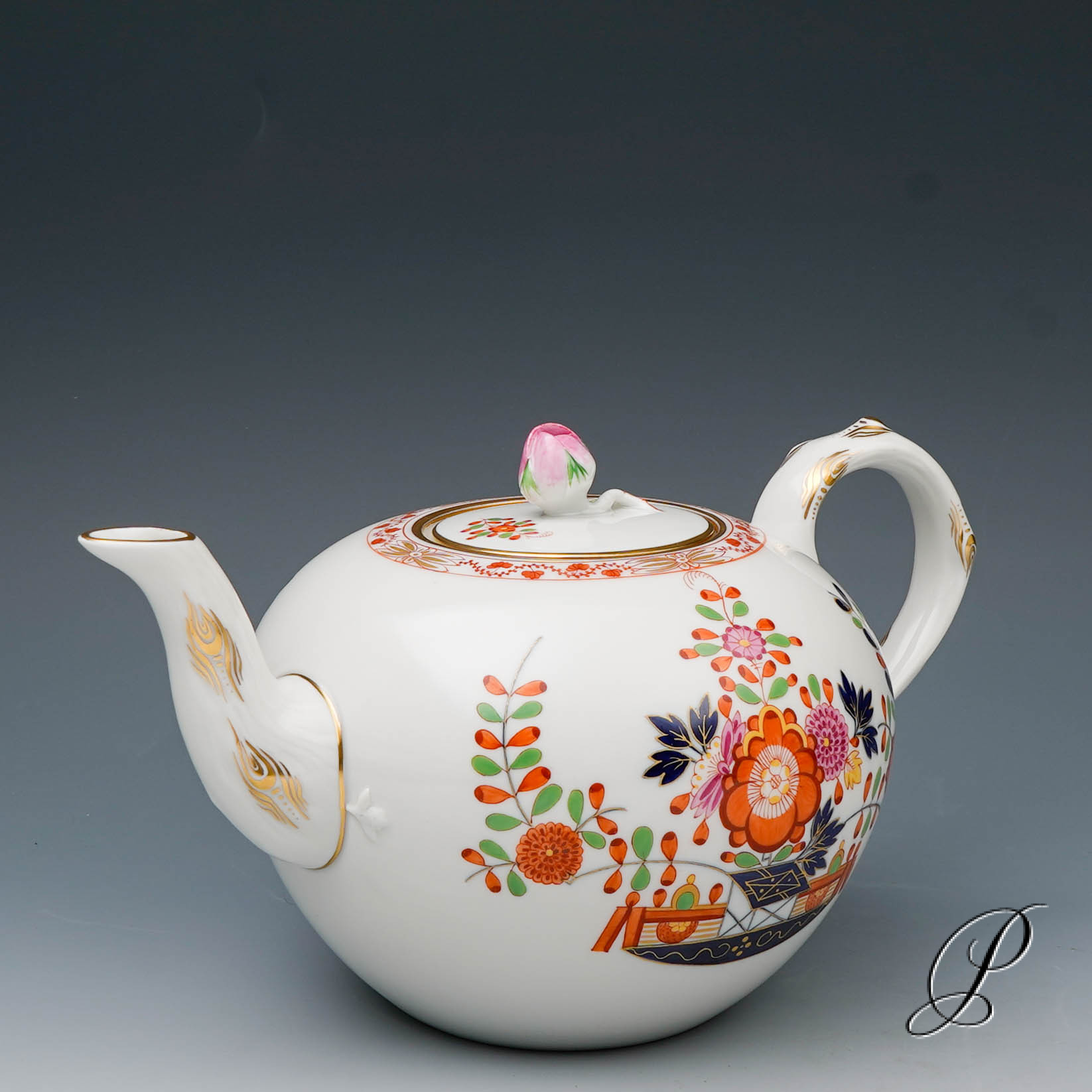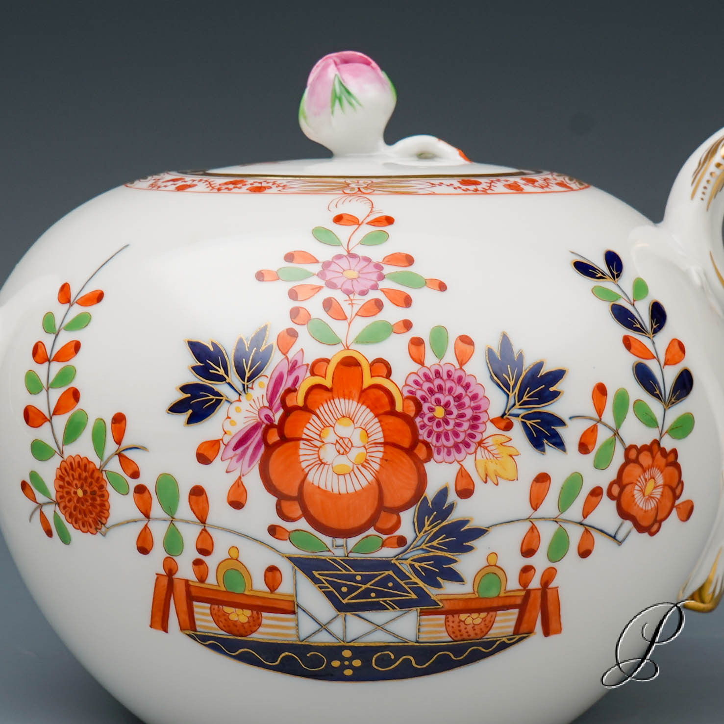 Dekor: Tischchenmuster, bunt, goldschattiert mit Goldrand.