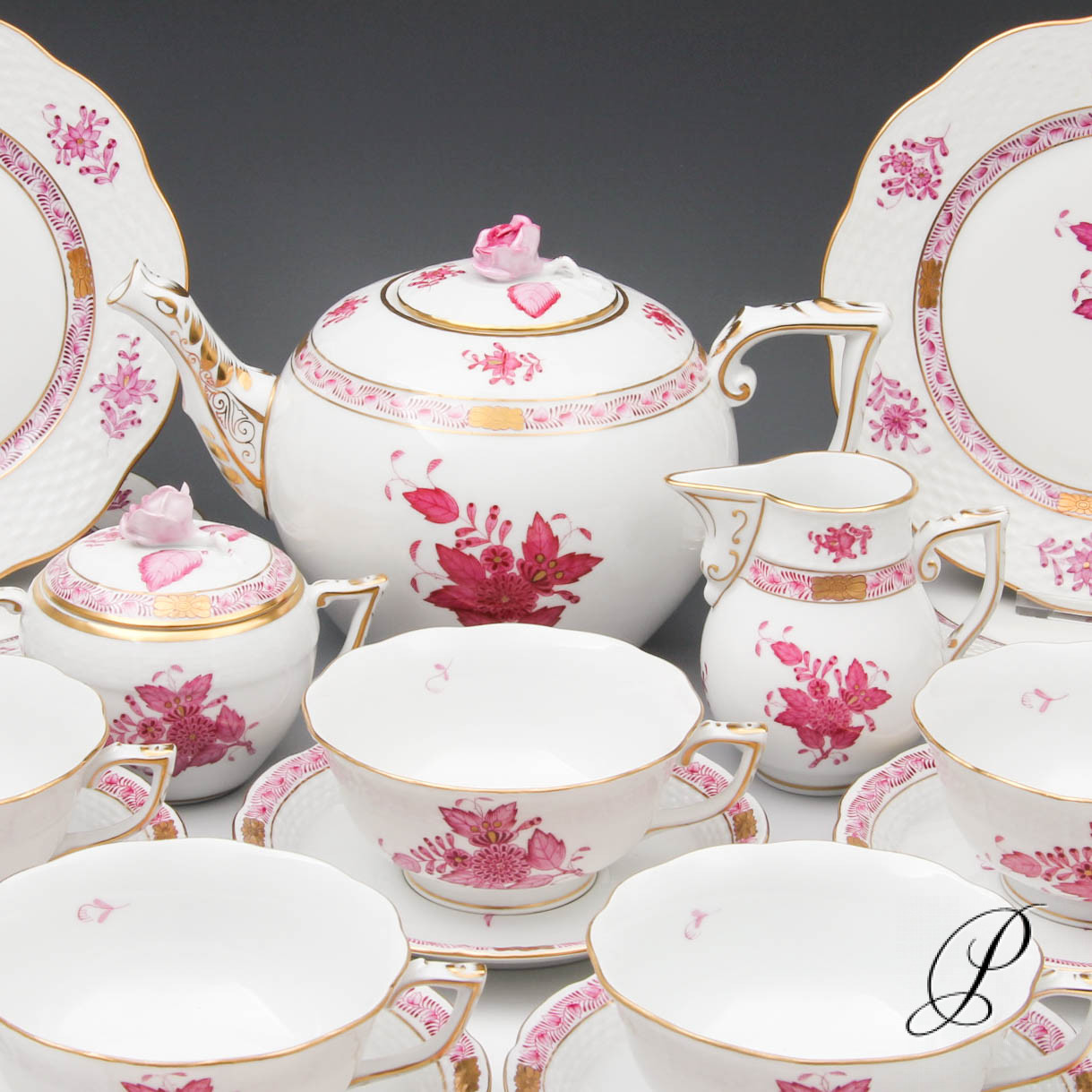 Das Dekor Apponyi gibt es in verschiedenen Farbvarianten. Der Name verbindet sich mit dem Grafen Albert Apponyi, der dieses Motiv in der Herend Manufaktur bestellte. Das Dekor wurde in Anlehnung an das fernöstliche Motiv „Indischer Blumenkorb“ entworfen. Eine stilisierte Pfingstrose in Konturmalerei welche von 6 Streumotiven und einer Girlande aus stilisierten Blättern umgeben ist.