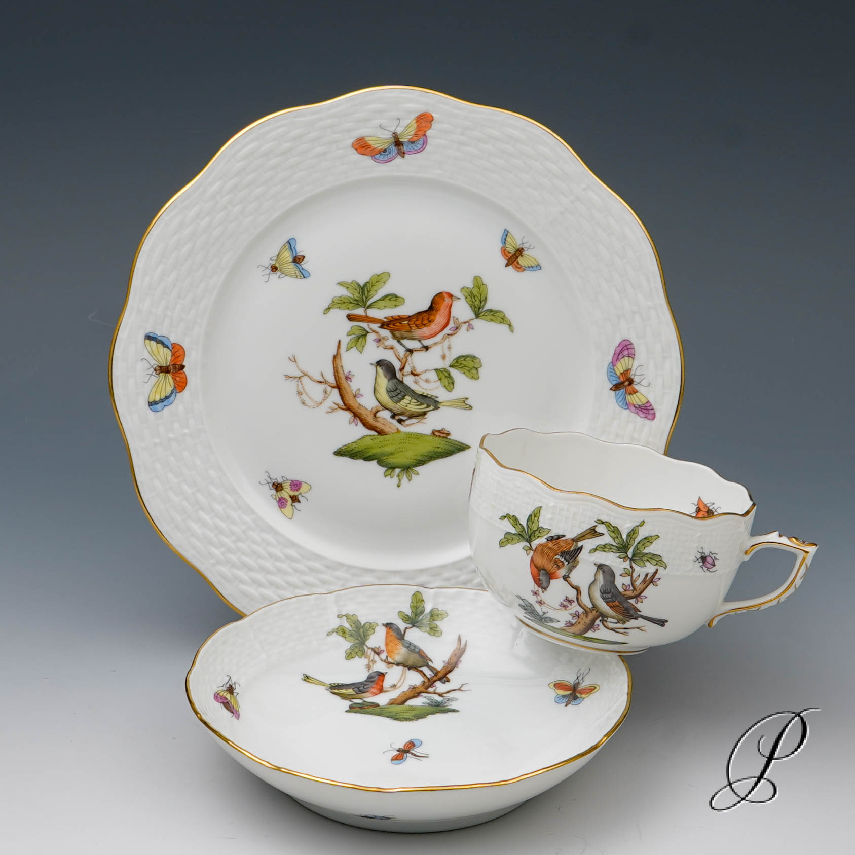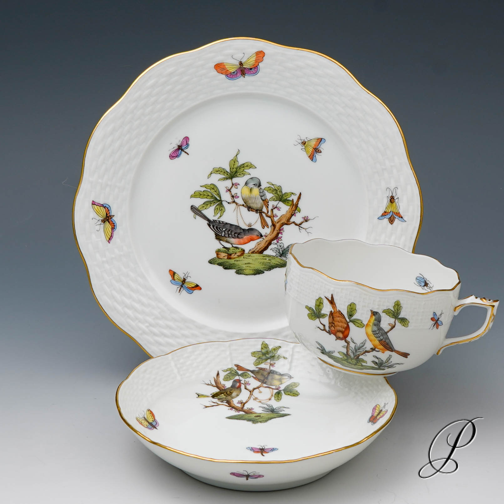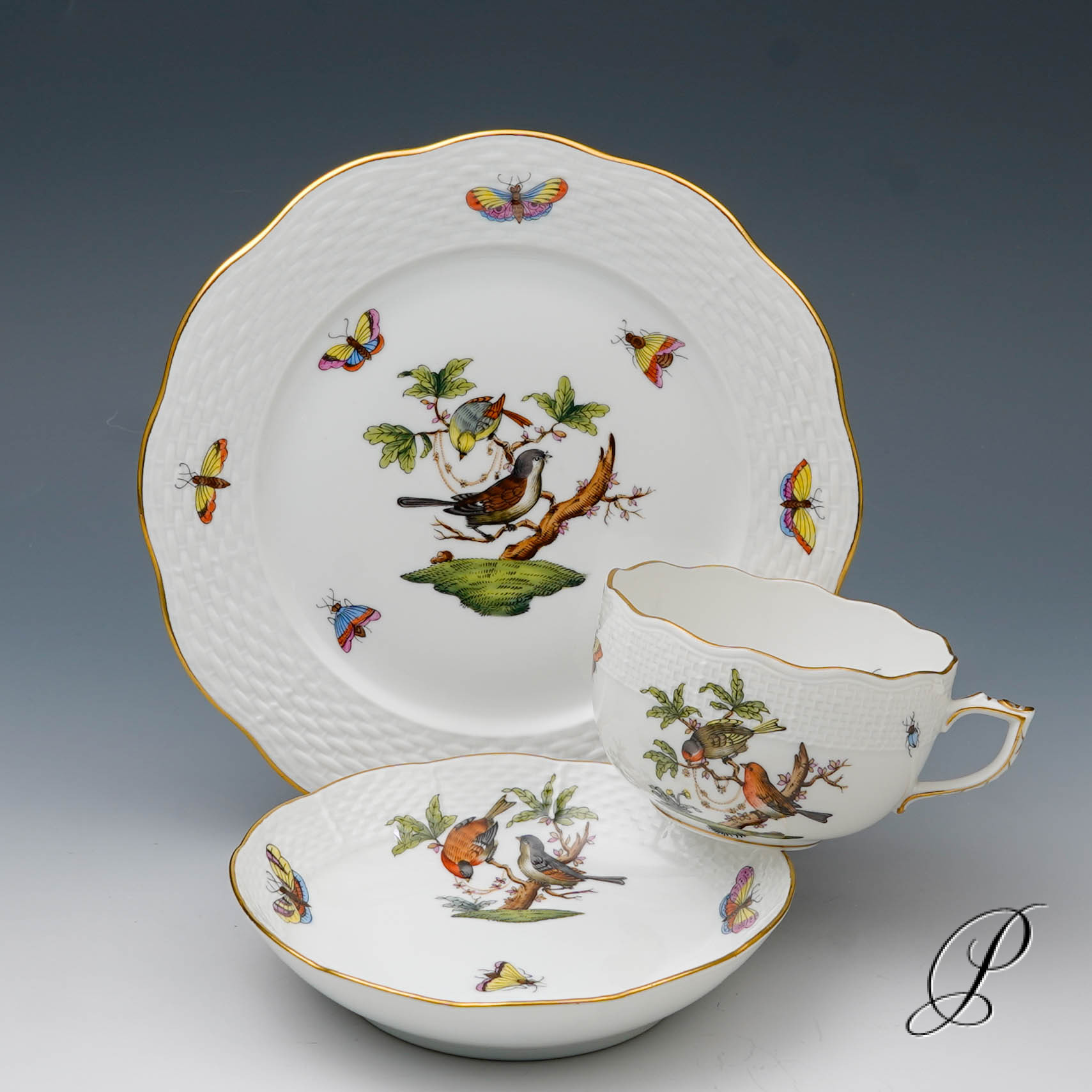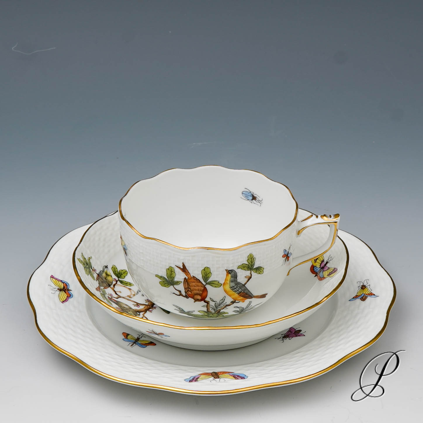 Das Dekor Rothschild strahlt Glück und Harmonie aus. Es beschwört die Stimmung des Frühlingserwachens der Natur herauf. Das Dekor ist mit naturalistisch und farbenprächtig gefiederten Vogelpaaren und Schmetterlingen verziert.