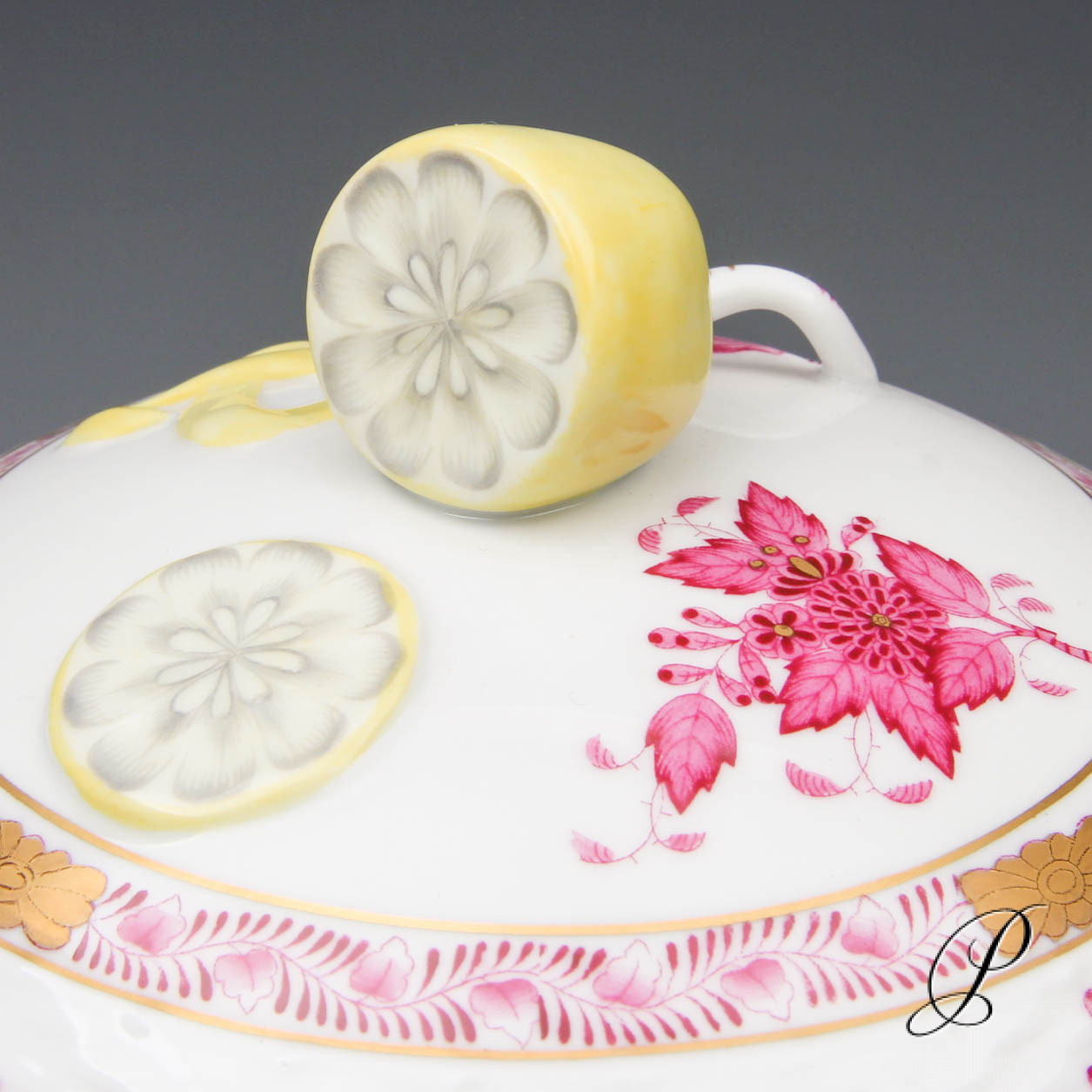 Das Dekor Apponyi gibt es in verschiedenen Farbvarianten. Der Name verbindet sich mit dem Grafen Albert Apponyi, der dieses Motiv in der Herend Manufaktur bestellte. Das Dekor wurde in Anlehnung an das fernöstliche Motiv „Indischer Blumenkorb“ entworfen. Eine stilisierte Pfingstrose in Konturmalerei welche von 6 Streumotiven und einer Girlande aus stilisierten Blättern umgeben ist.
