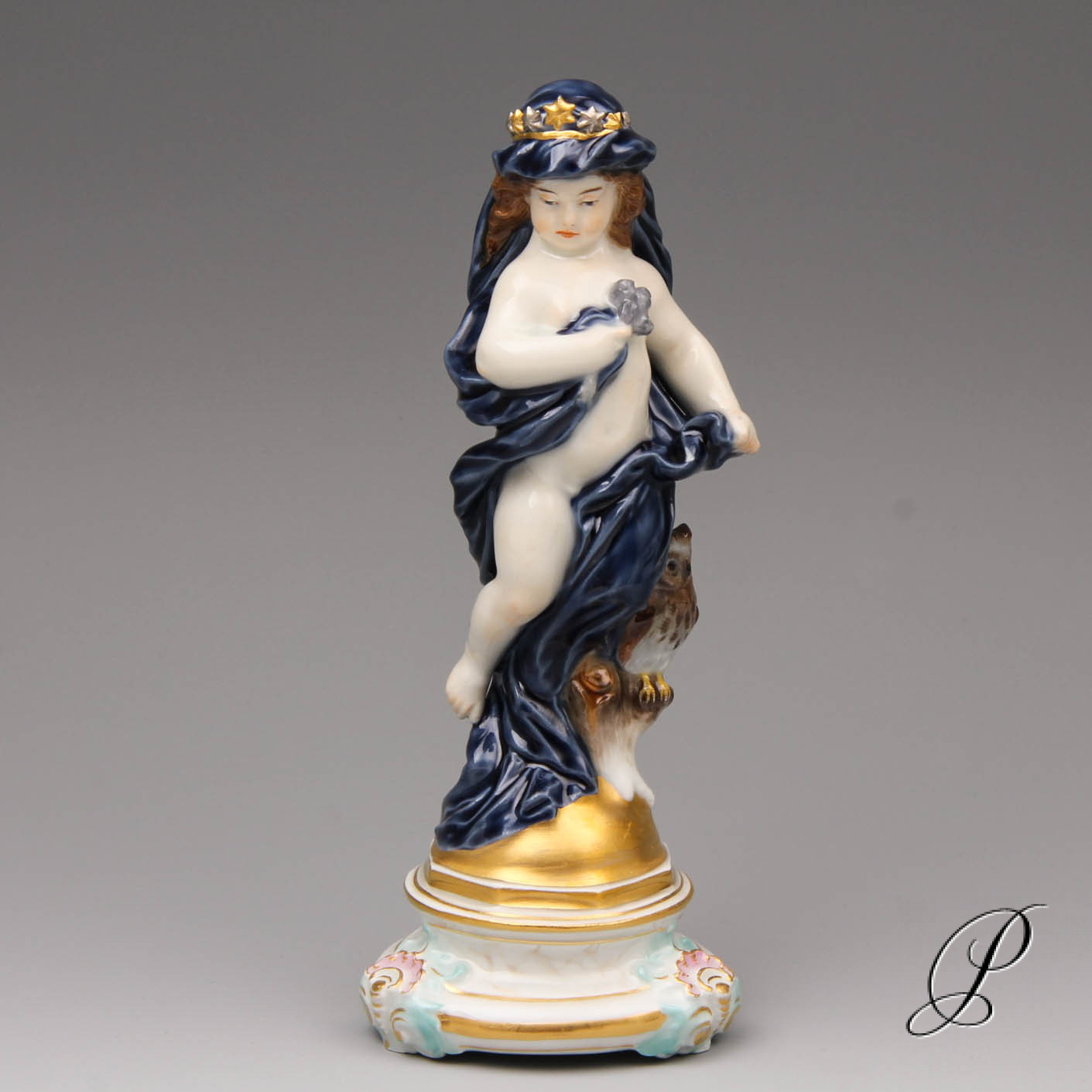 Eine schwebende Amorette. Seitlich mit Eule und auf dem Kopf mit Sternen.