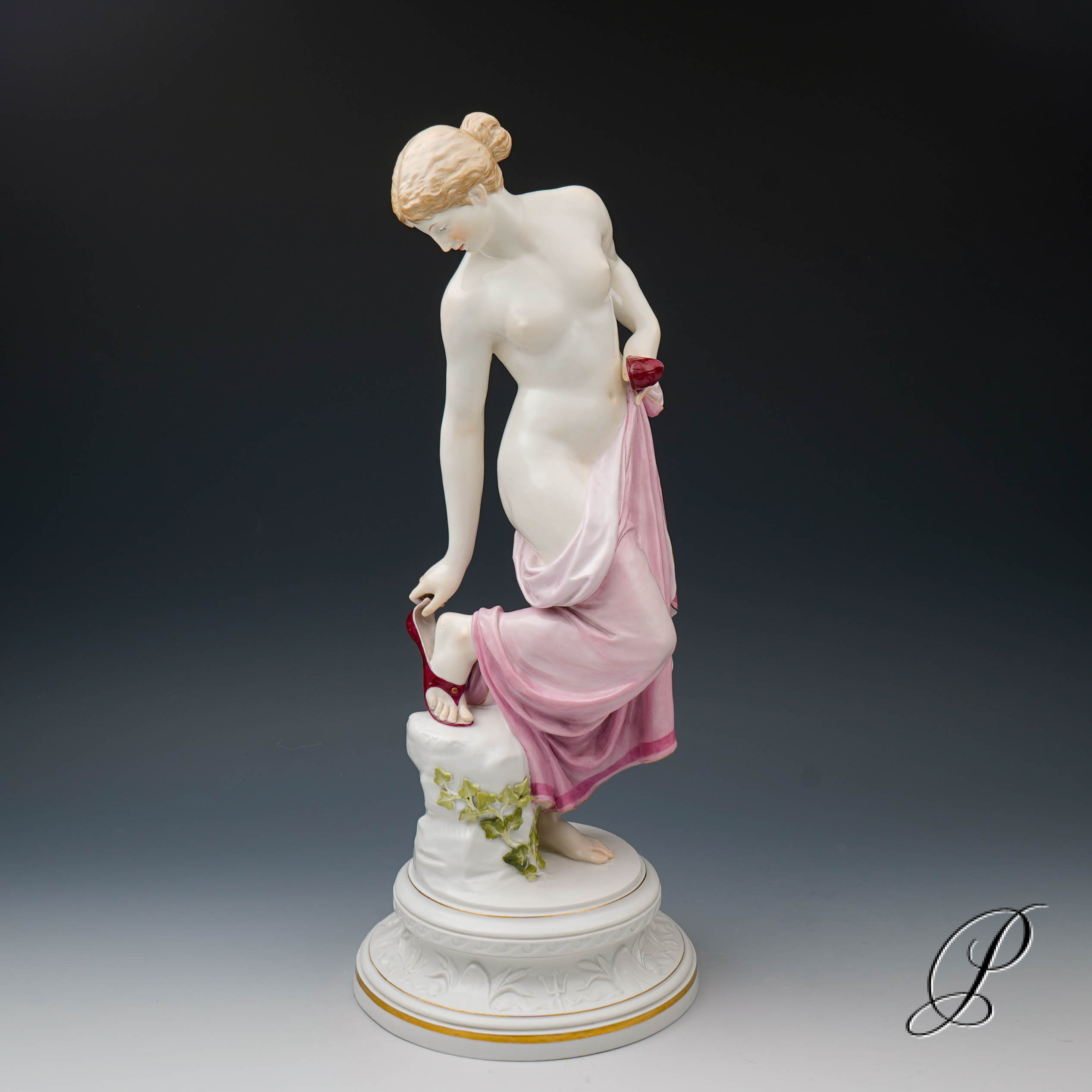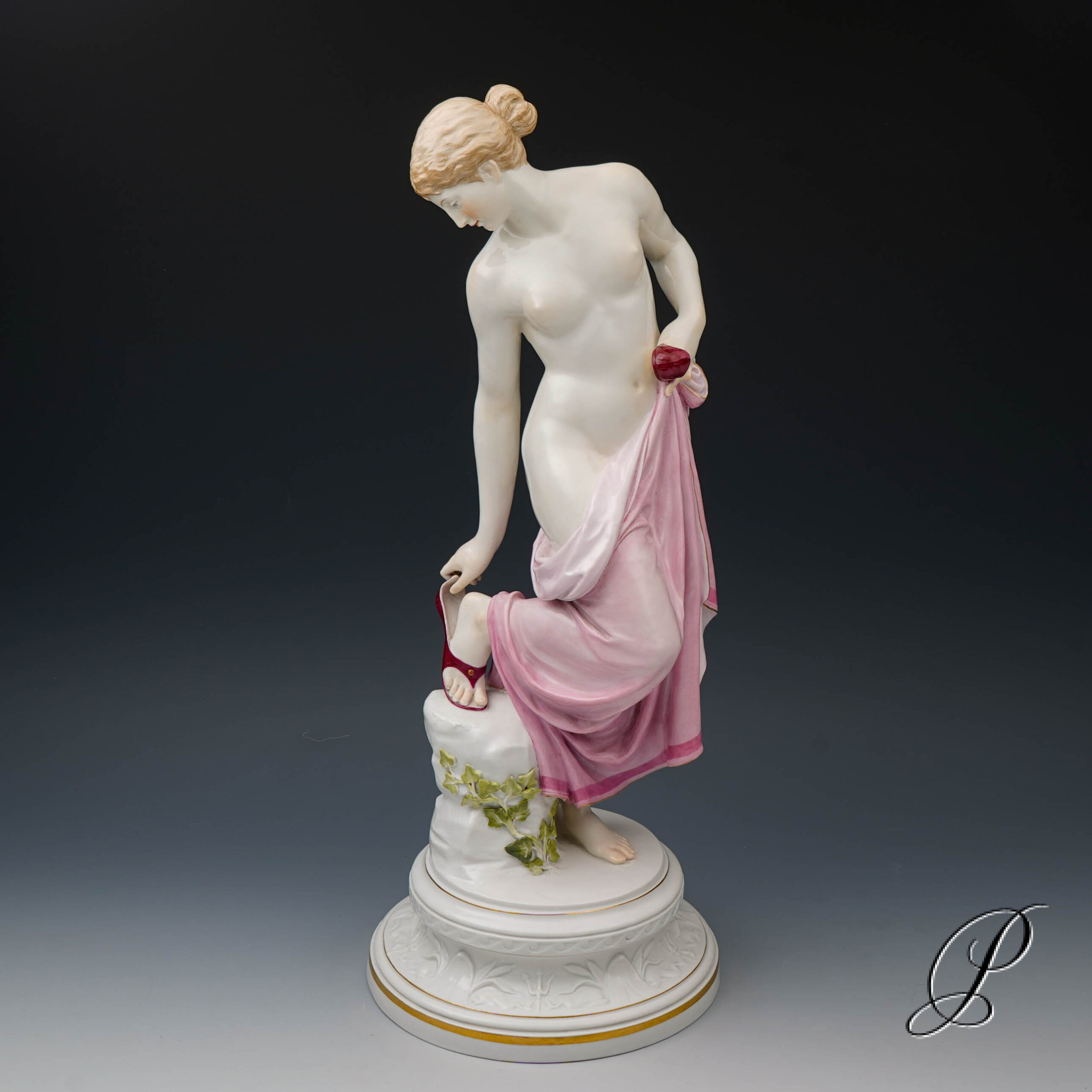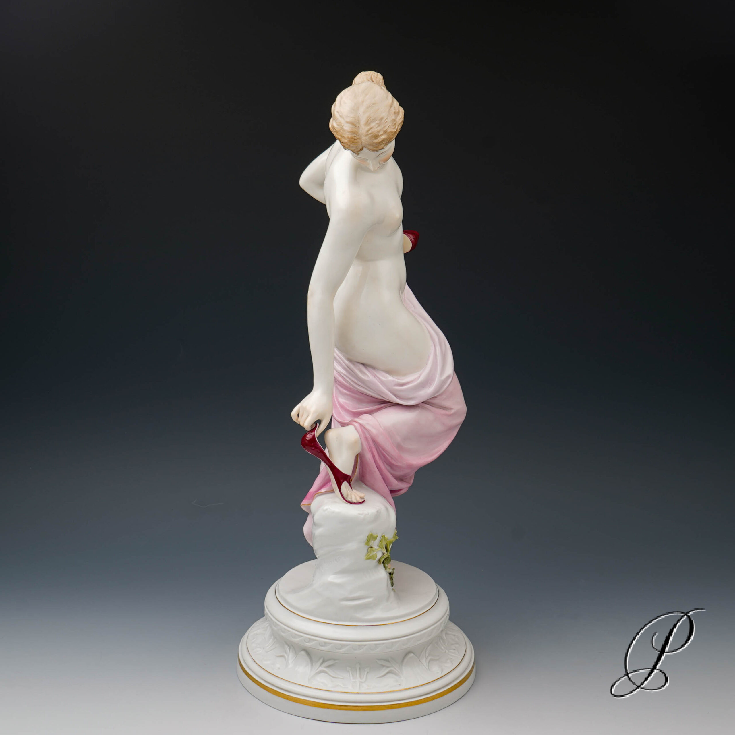 Der Oberkörber unbekleidet. Nur die Beine sind durch eine Draperie bedeckt. Mit einem Fuß stützt sich die Dame an einem Felsen ab und schlüpft in eine Sandale. Eine unschuldig dargestellte Weiblichkeit, die kurz vor dem Moment des Ankleidens dargestellt ist und sich vor Blicken schützend verhüllt.