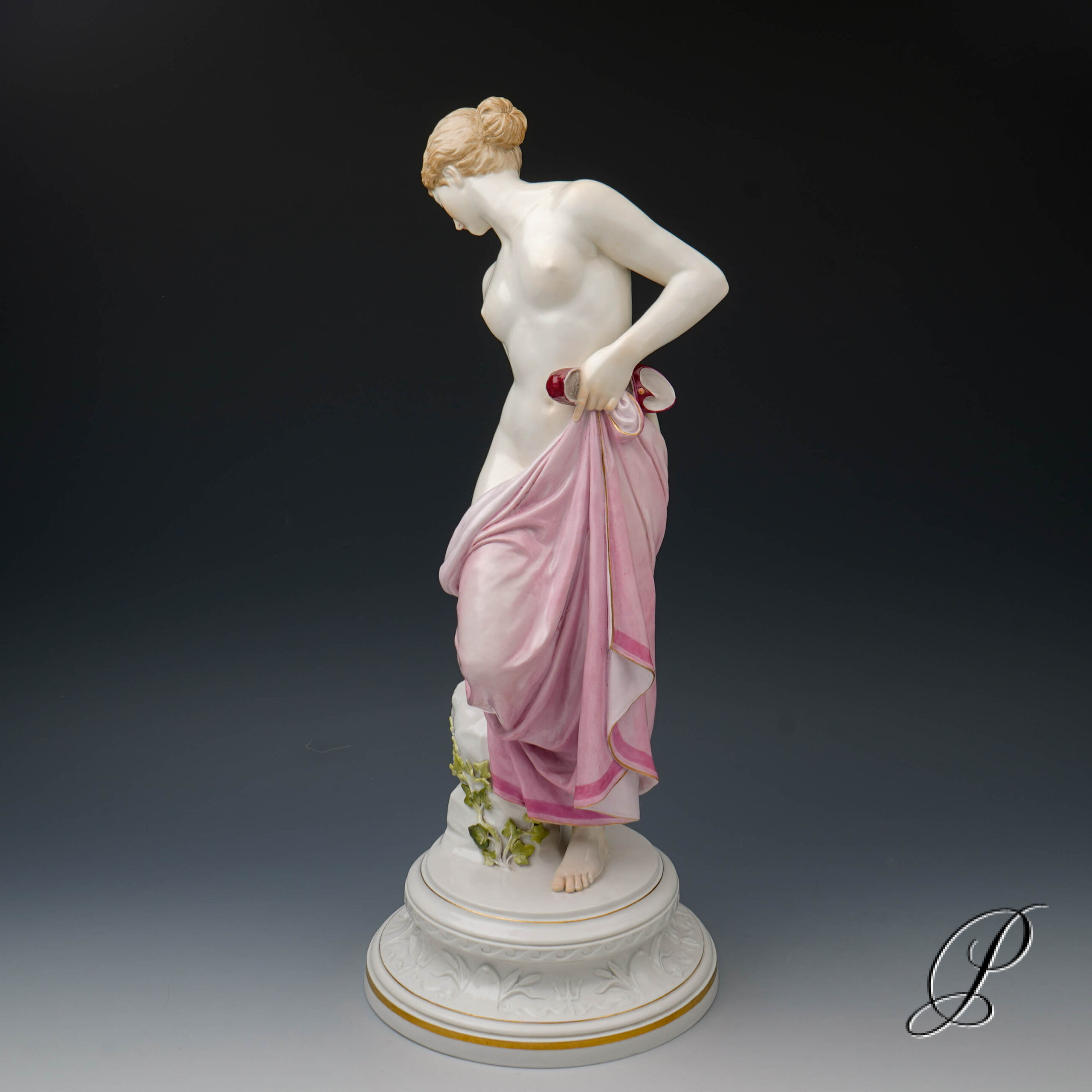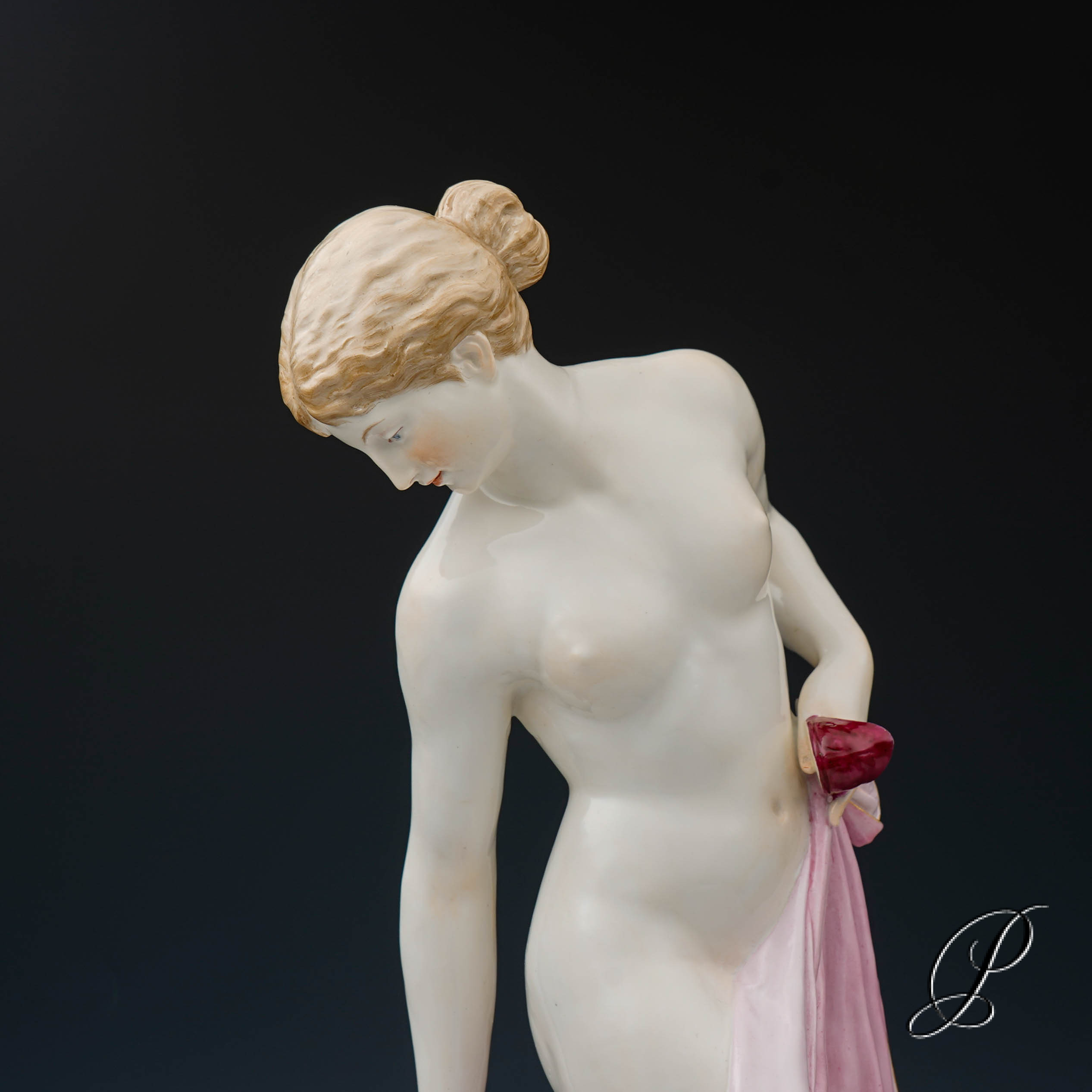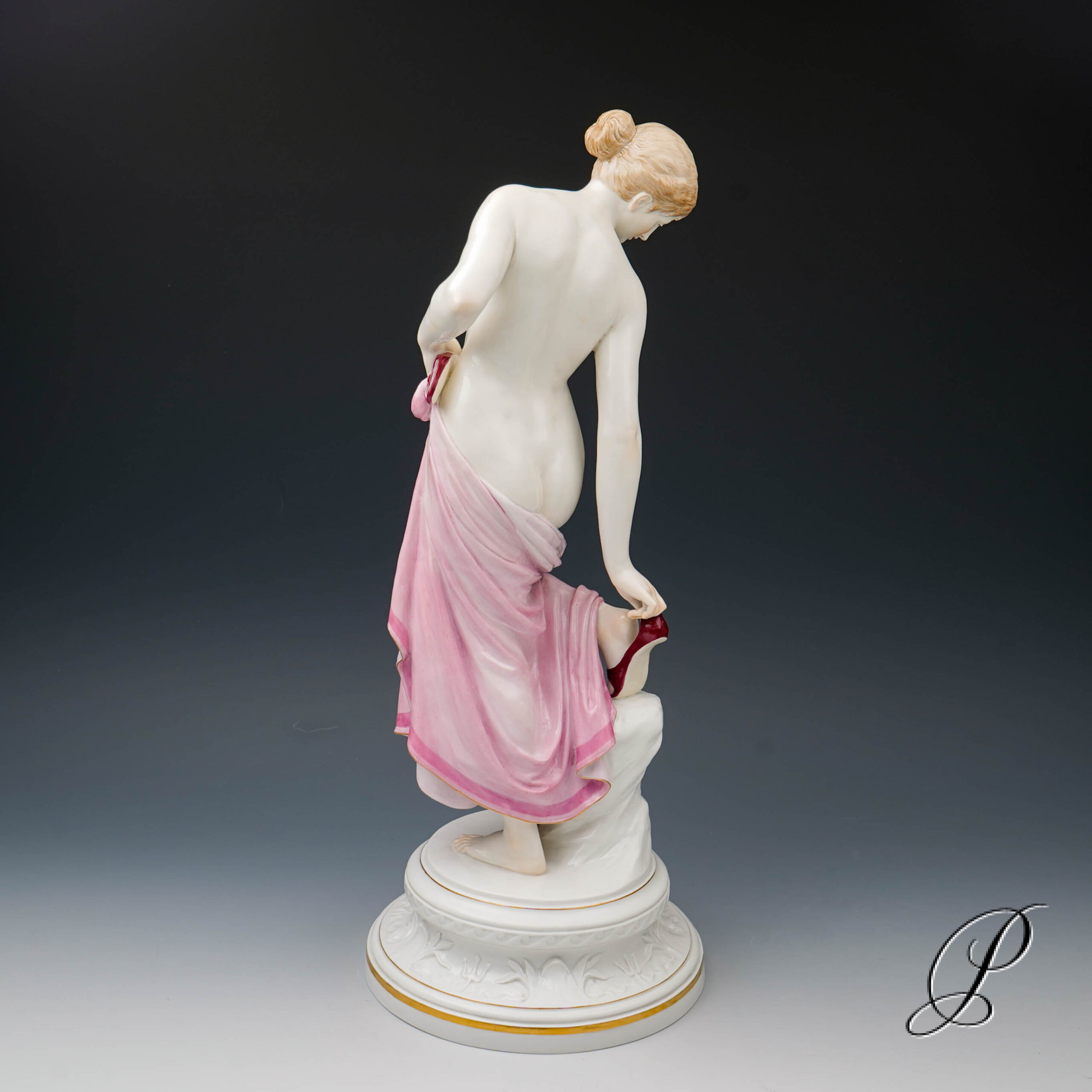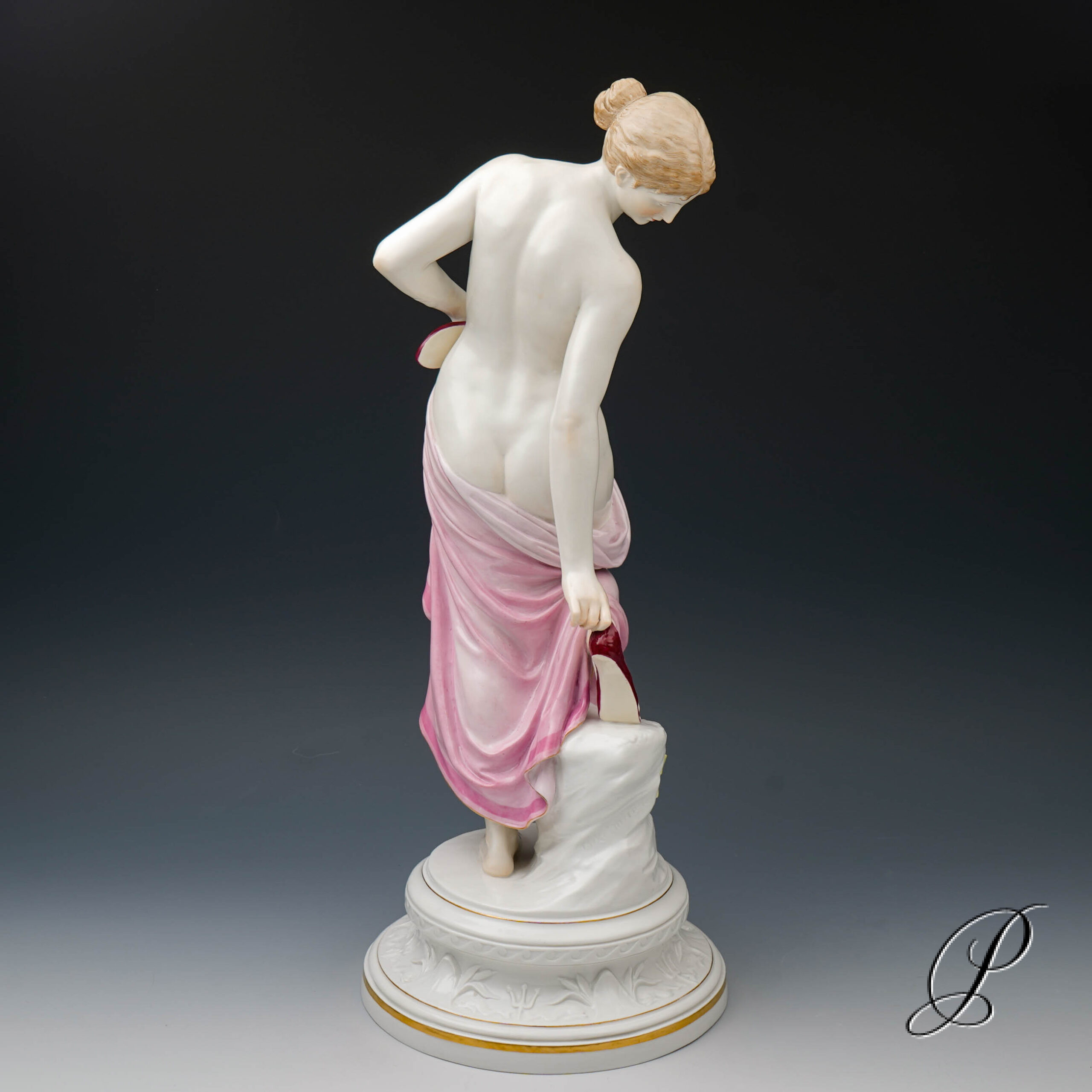 Der Oberkörber unbekleidet. Nur die Beine sind durch eine Draperie bedeckt. Mit einem Fuß stützt sich die Dame an einem Felsen ab und schlüpft in eine Sandale. Eine unschuldig dargestellte Weiblichkeit, die kurz vor dem Moment des Ankleidens dargestellt ist und sich vor Blicken schützend verhüllt.