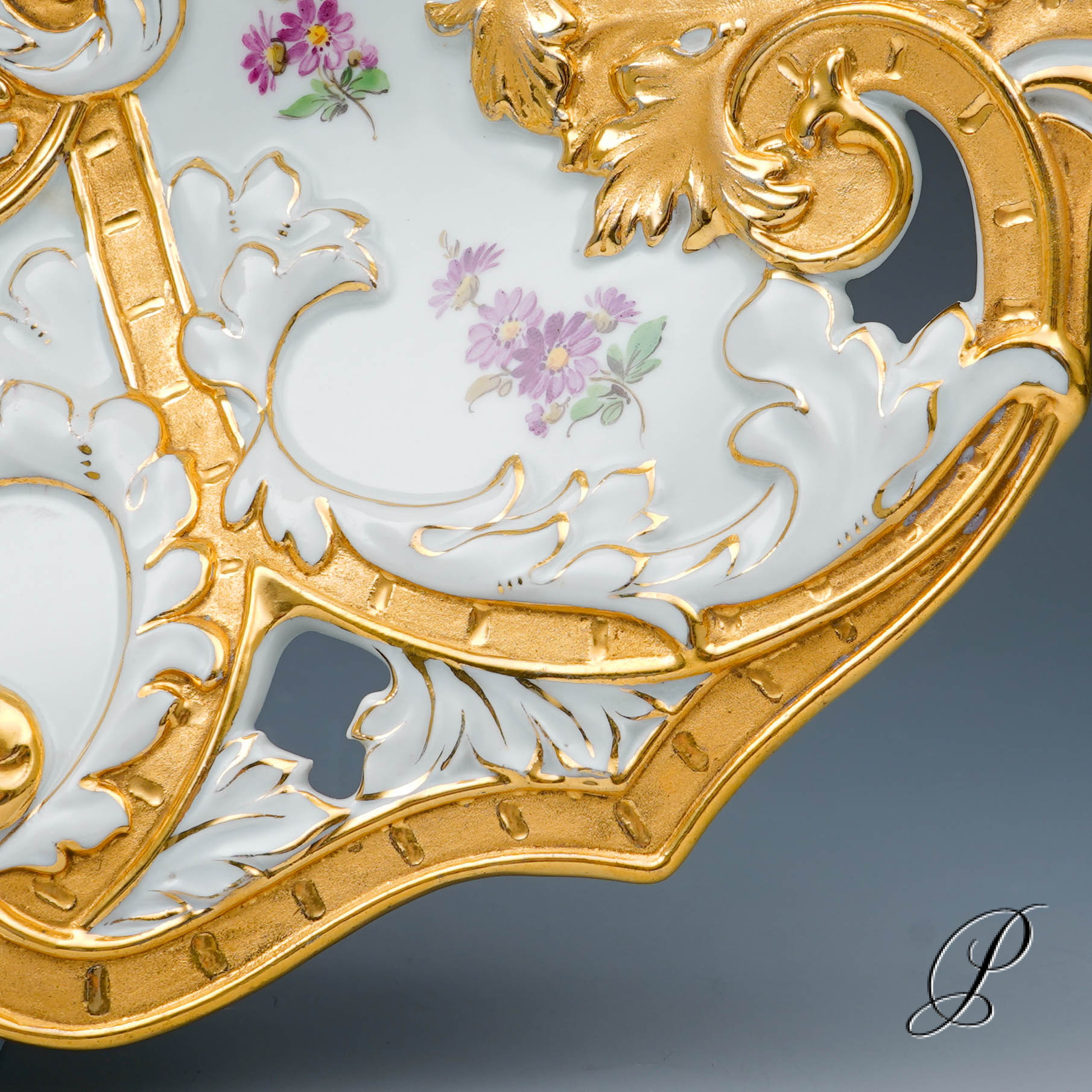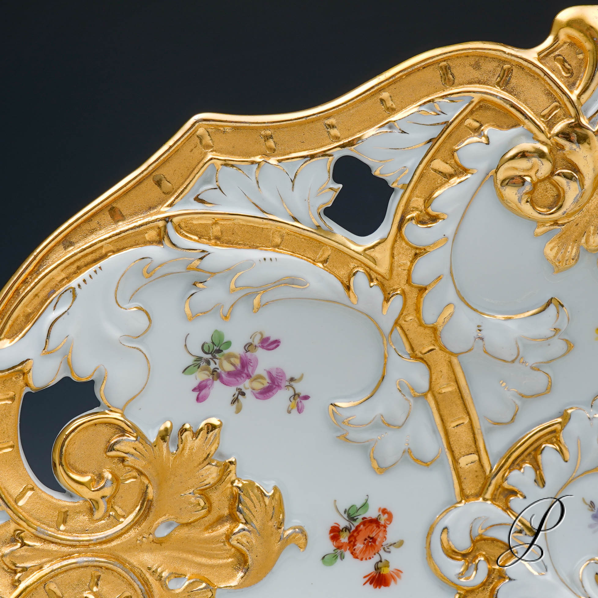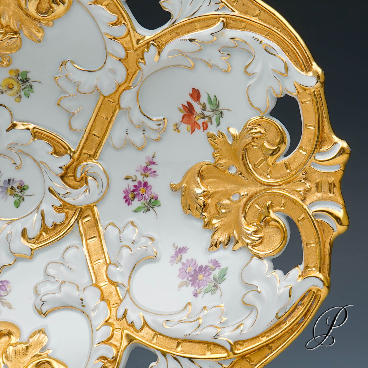 Sie hat aufwendig vergoldete Ornamente und gestreute Blümchen. Die Prunkvergoldung und der weiße Scherben mit den gestreuten Blümchen sehen in dieser Kombination wunderbar aus.