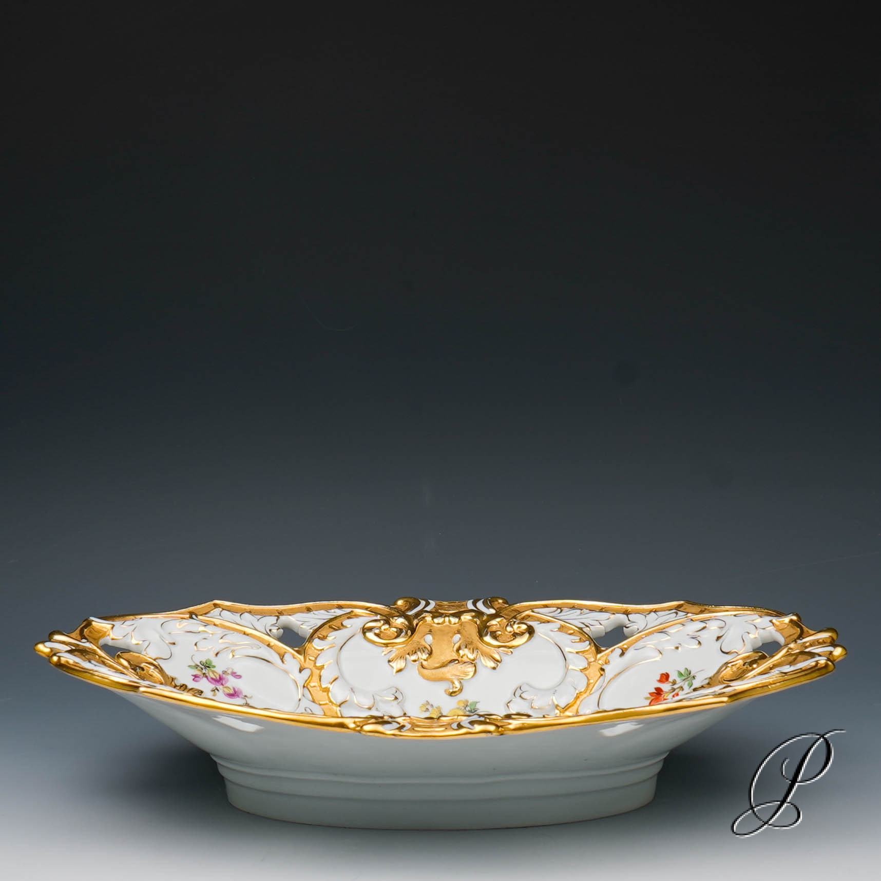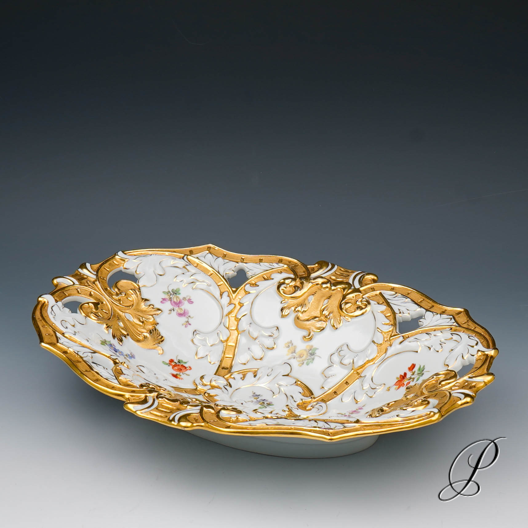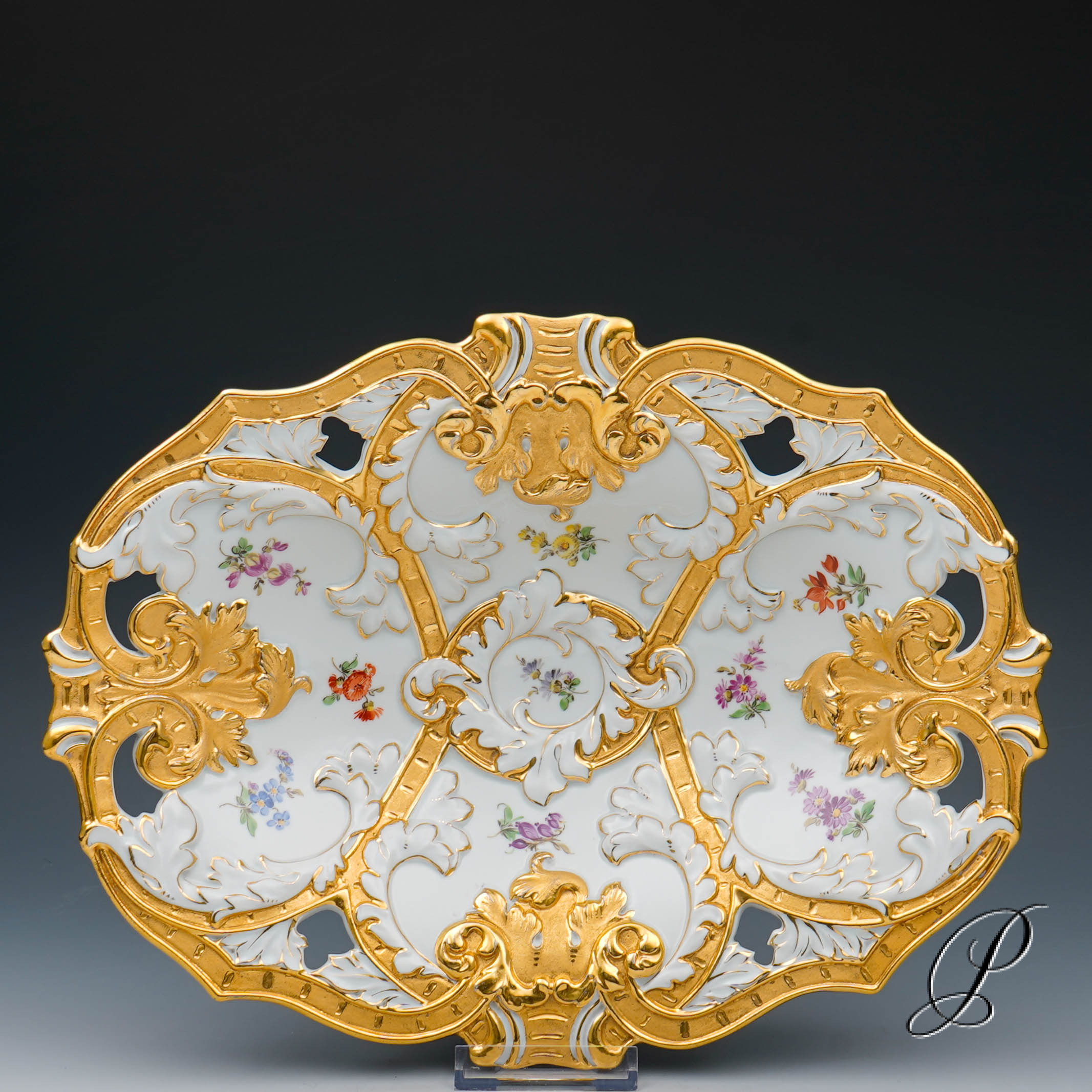 Sie hat aufwendig vergoldete Ornamente und gestreute Blümchen. Die Prunkvergoldung und der weiße Scherben mit den gestreuten Blümchen sehen in dieser Kombination wunderbar aus.