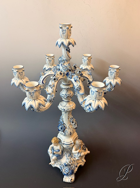 Der Schaft mit floralen Formen, Voluten und Rocaillen gearbeitet. Als Krönung der abnehmbare siebenflammige Aufsatz mit 6 geschweiften Armen und tordierten mittleren Leuchter. Blattrosetten als Tropfschalen und Blütenförmige Tüllen.