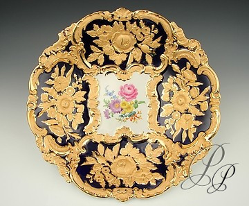 Er ist mit einem Blumenbukett bemalt und eingehüllt in kobaltblaue Fondmalerei. Die vier prunkvergoldeten Blumenornamente machen den Teller zu einem sehr, sehr edlen Stück Meissener Porzellan.