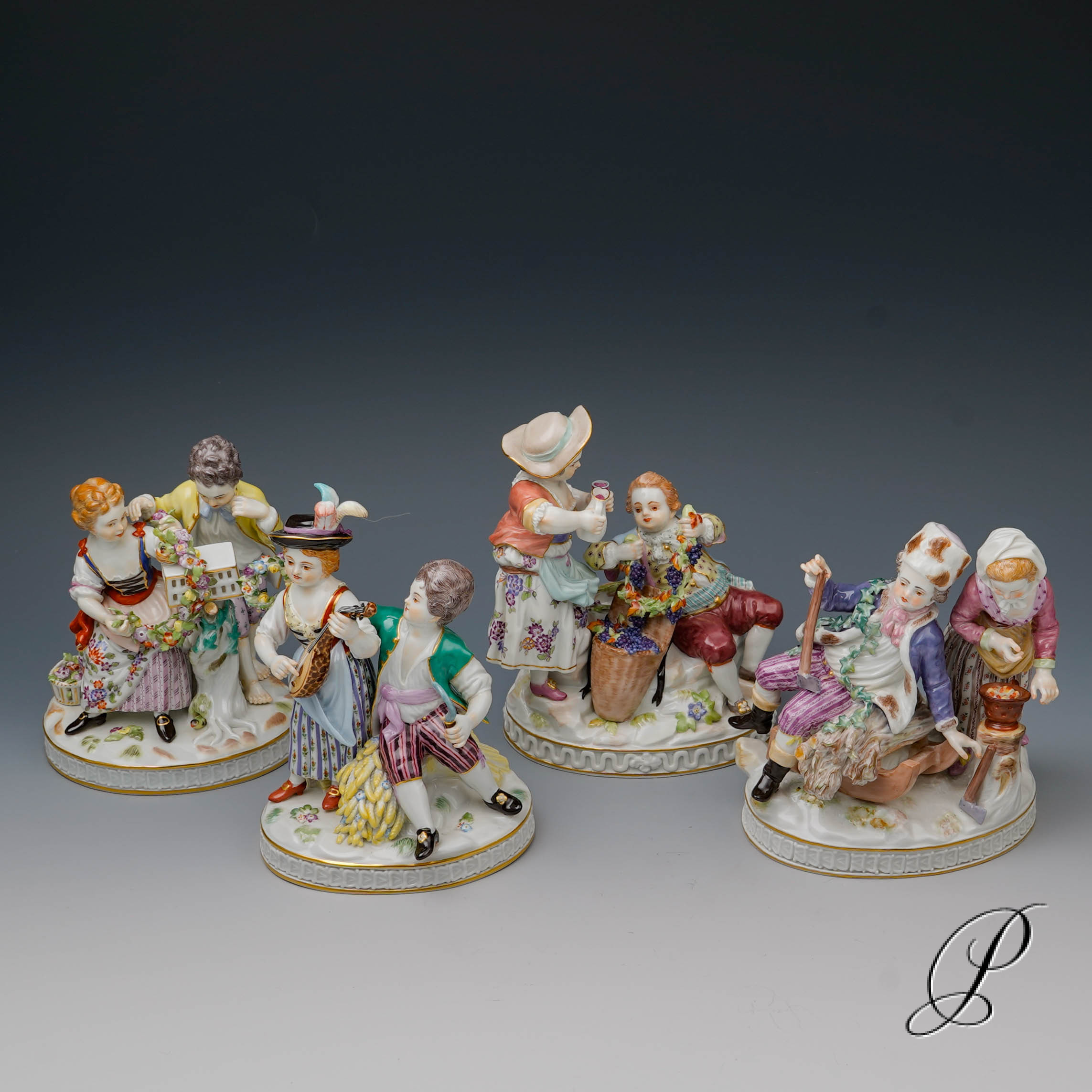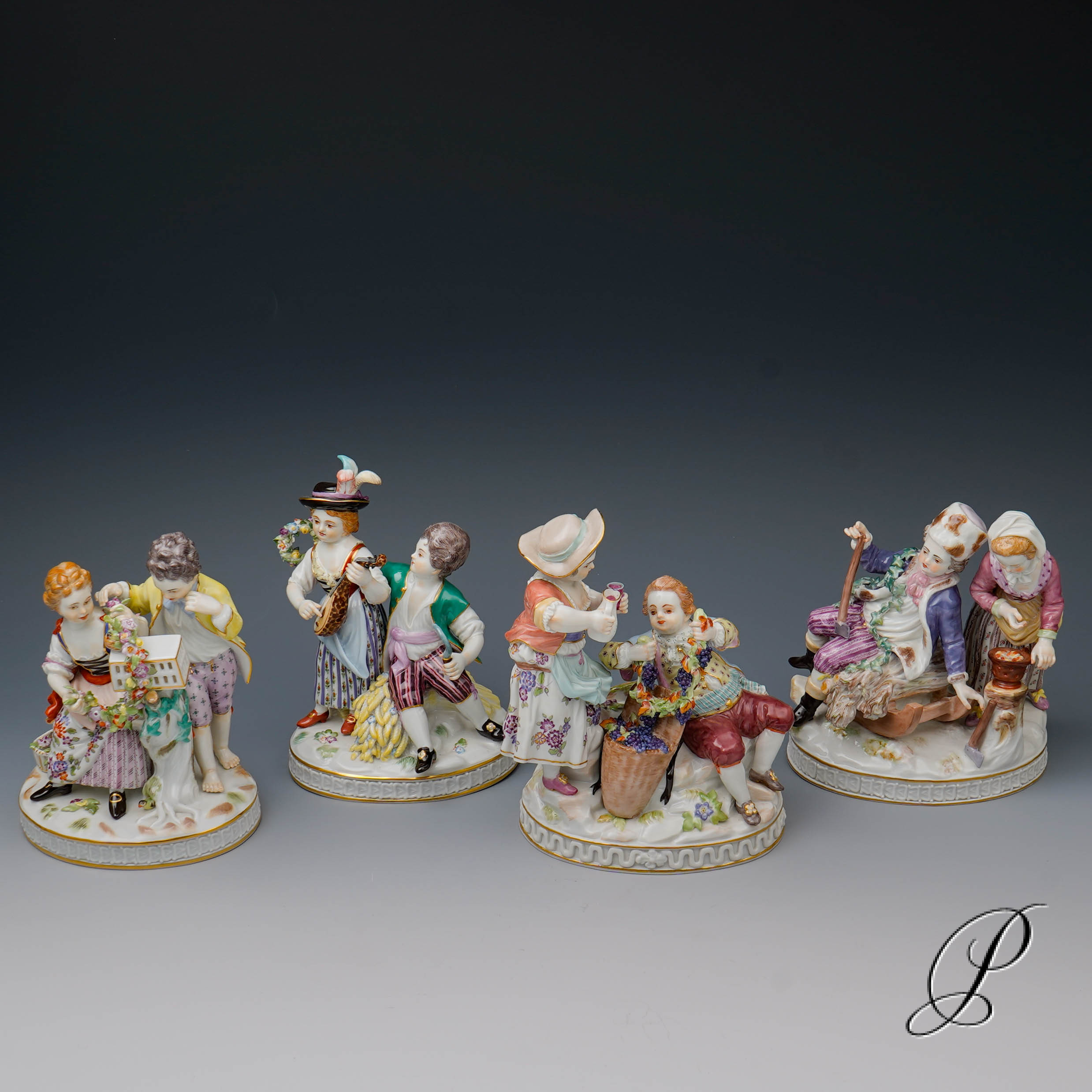 Formnummer: Frühling 61264. Sommer 21265. Herbst 61285. Winter 61267. Alle vier Figuren mit der unterglasurblauen Schwertmarke von Meissen in 1. Wahl.