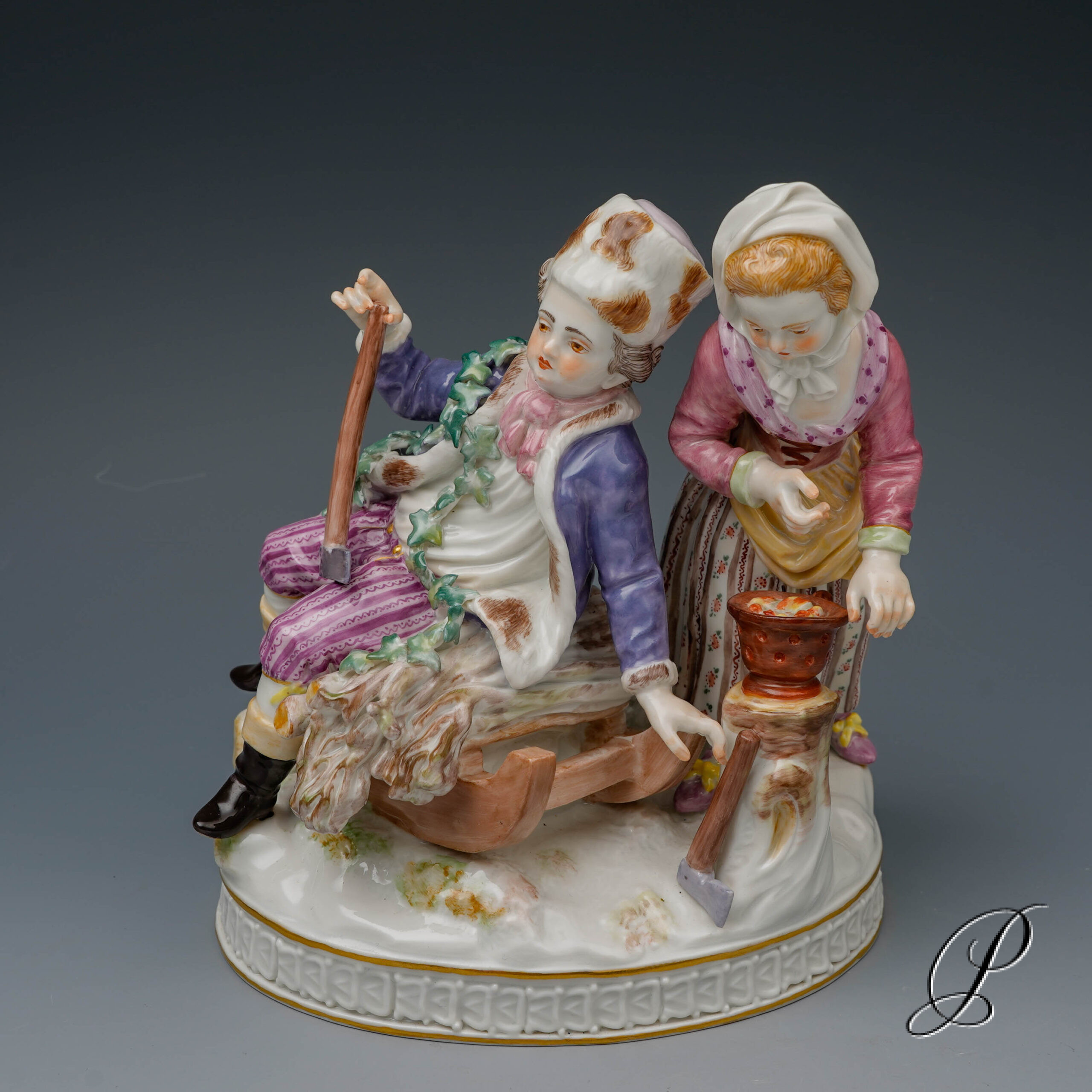 Winter – Über Schneebedeckten Sockel auf einem Schlitten sitzender Junge mit Axt, seitlich Holzstapel. Zu seiner linken eine über einen Feuertopf. gebeugtes Mädchen, sich die Hände wärmend. Die Figur bringt betörende Wärme in Ihr Zuhause.