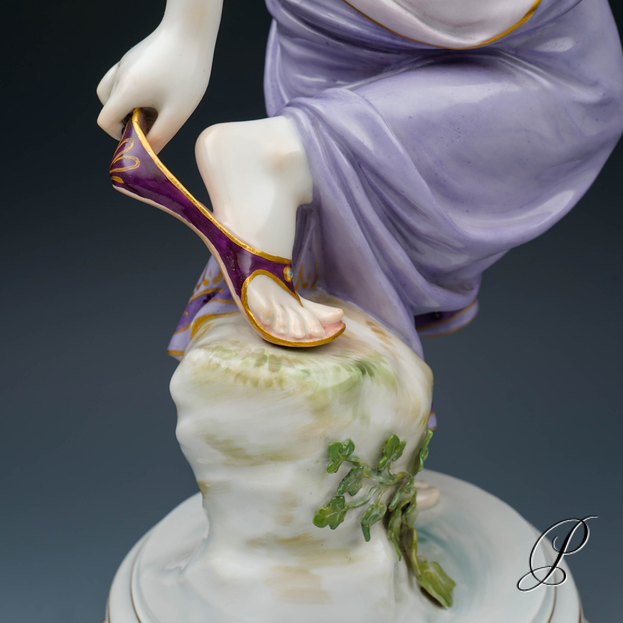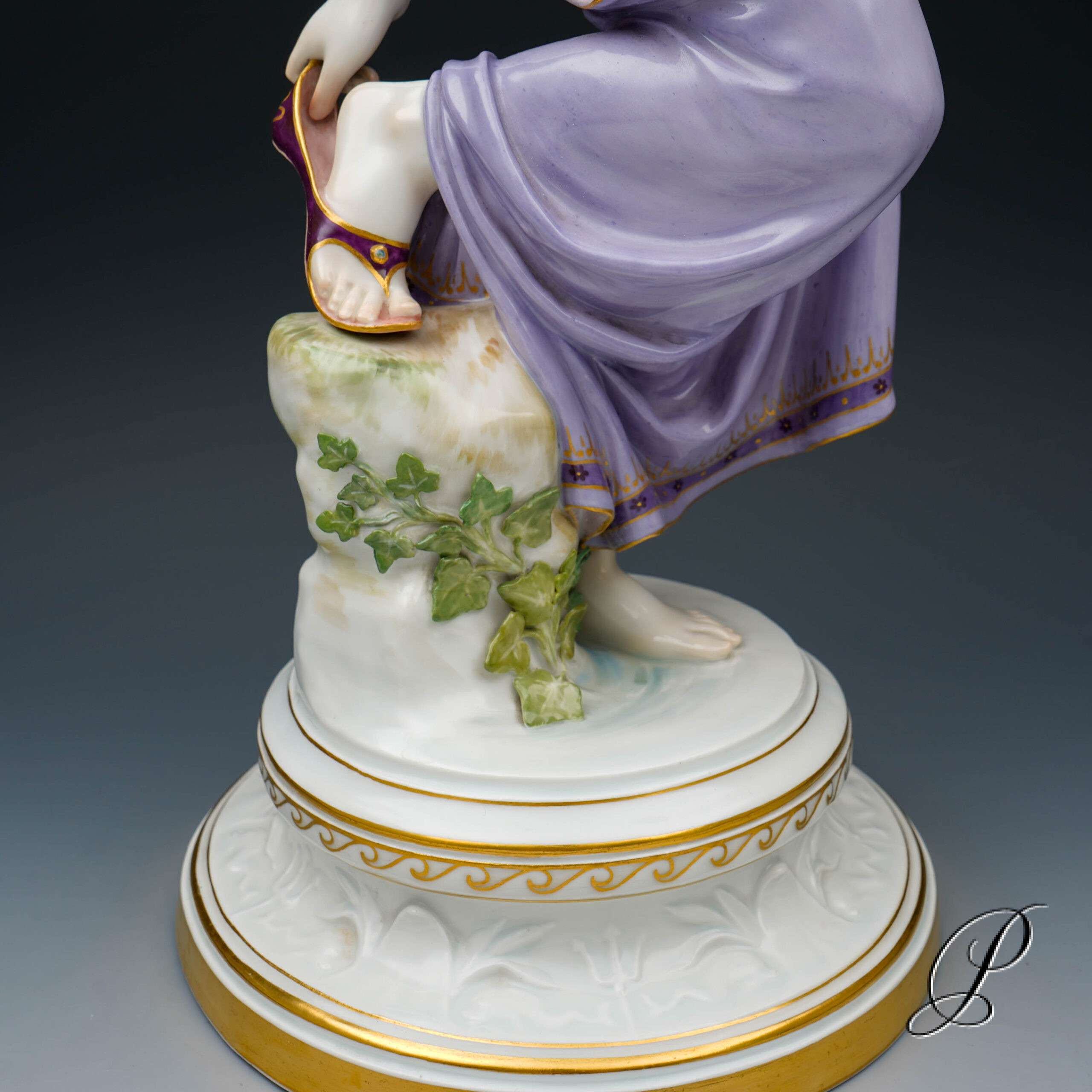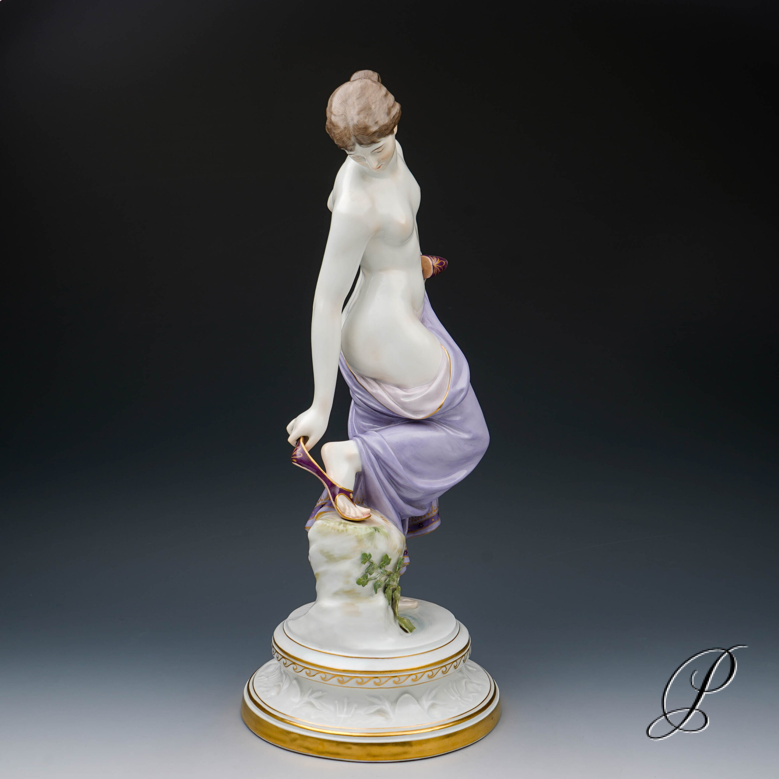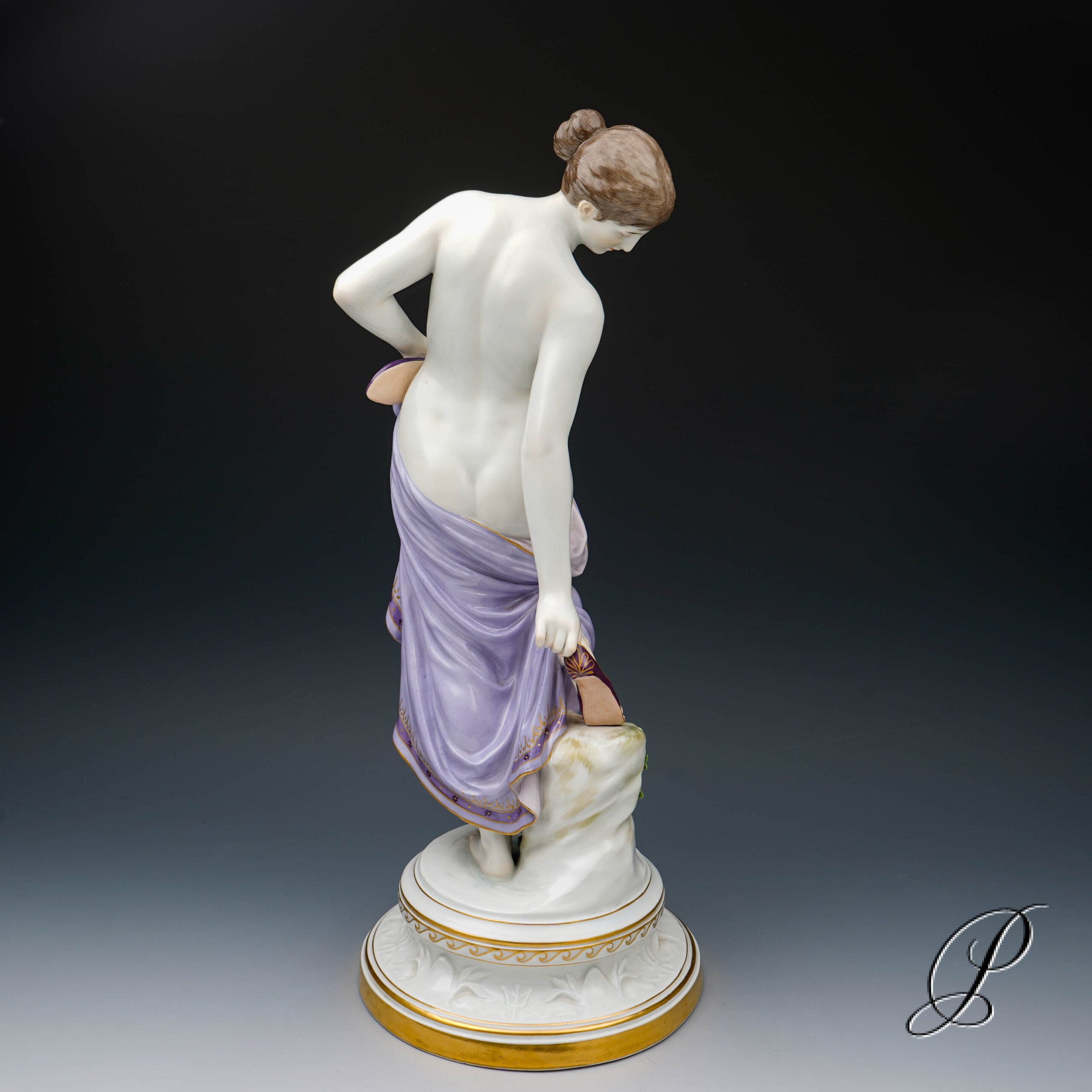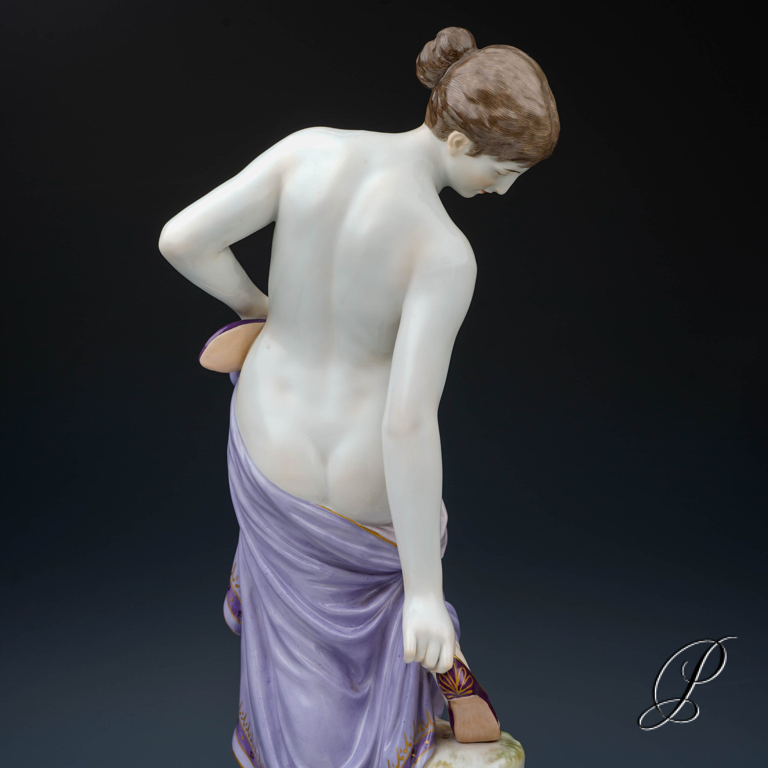 Der Oberkörber unbekleidet. Nur die Beine sind durch eine Draperie bedeckt. Mit einem Fuß stützt sich die Dame an einem Felsen ab und schlüpft in eine Sandale. Eine unschuldig dargestellte Weiblichkeit, die kurz vor dem Moment des Ankleidens dargestellt ist und sich vor Blicken schützend verhüllt.