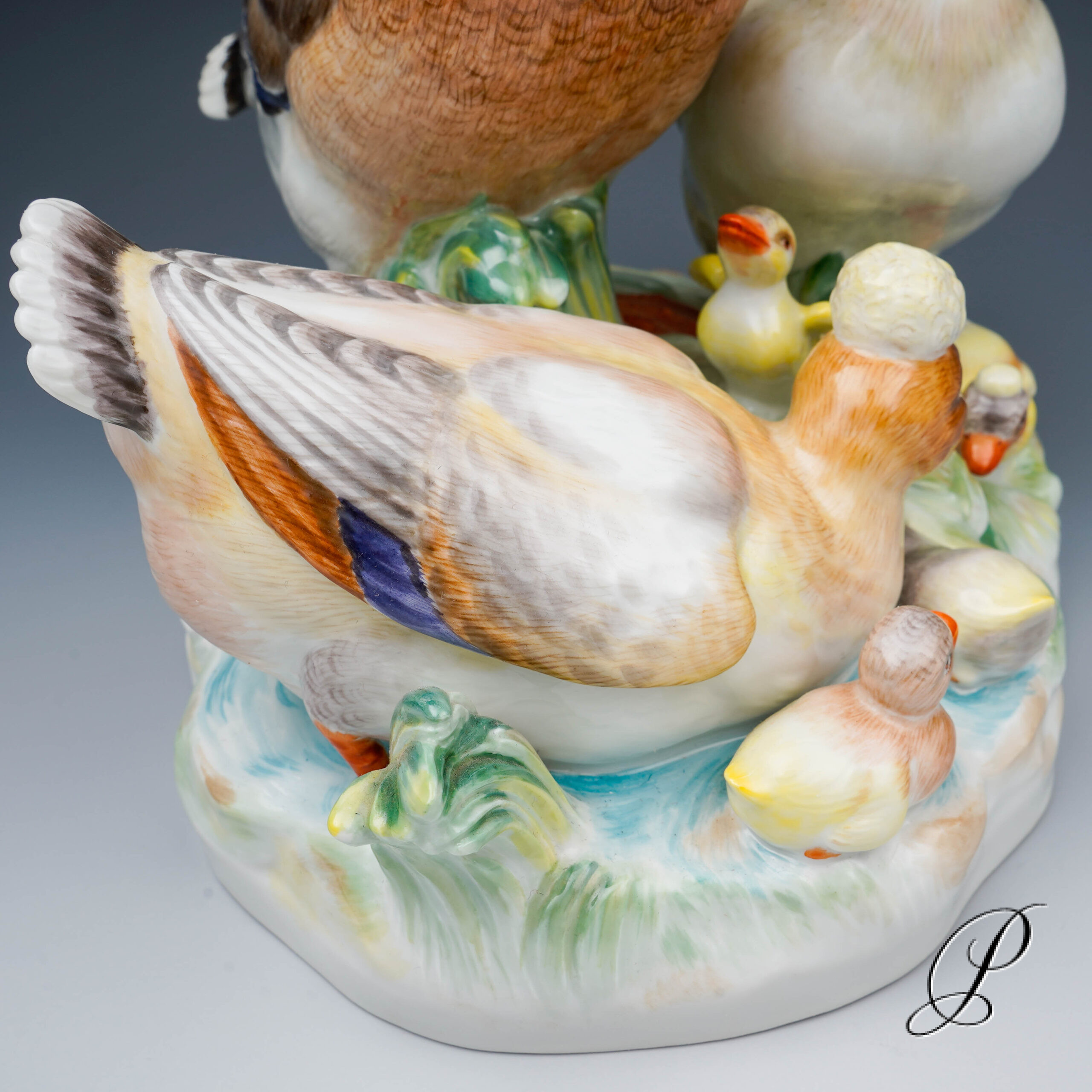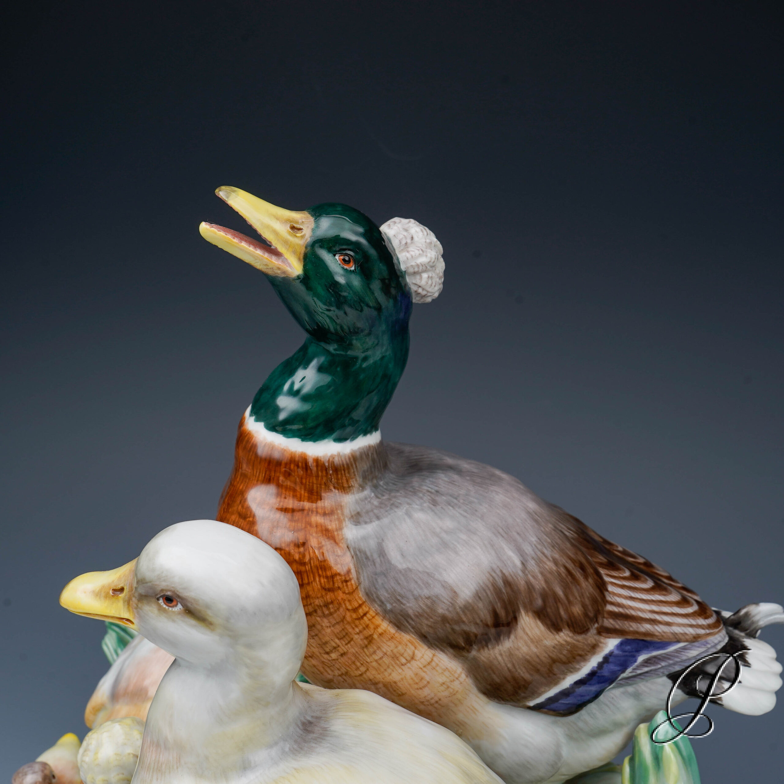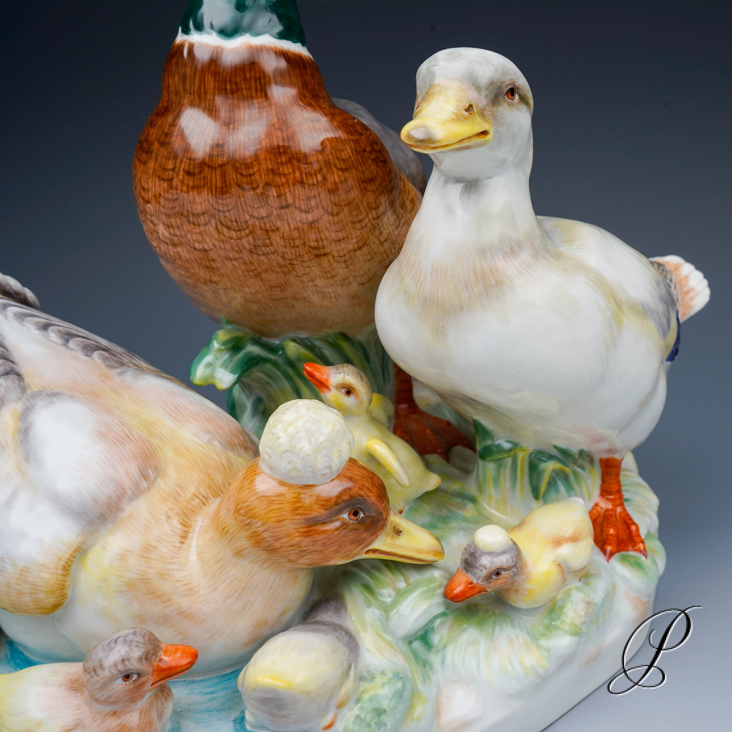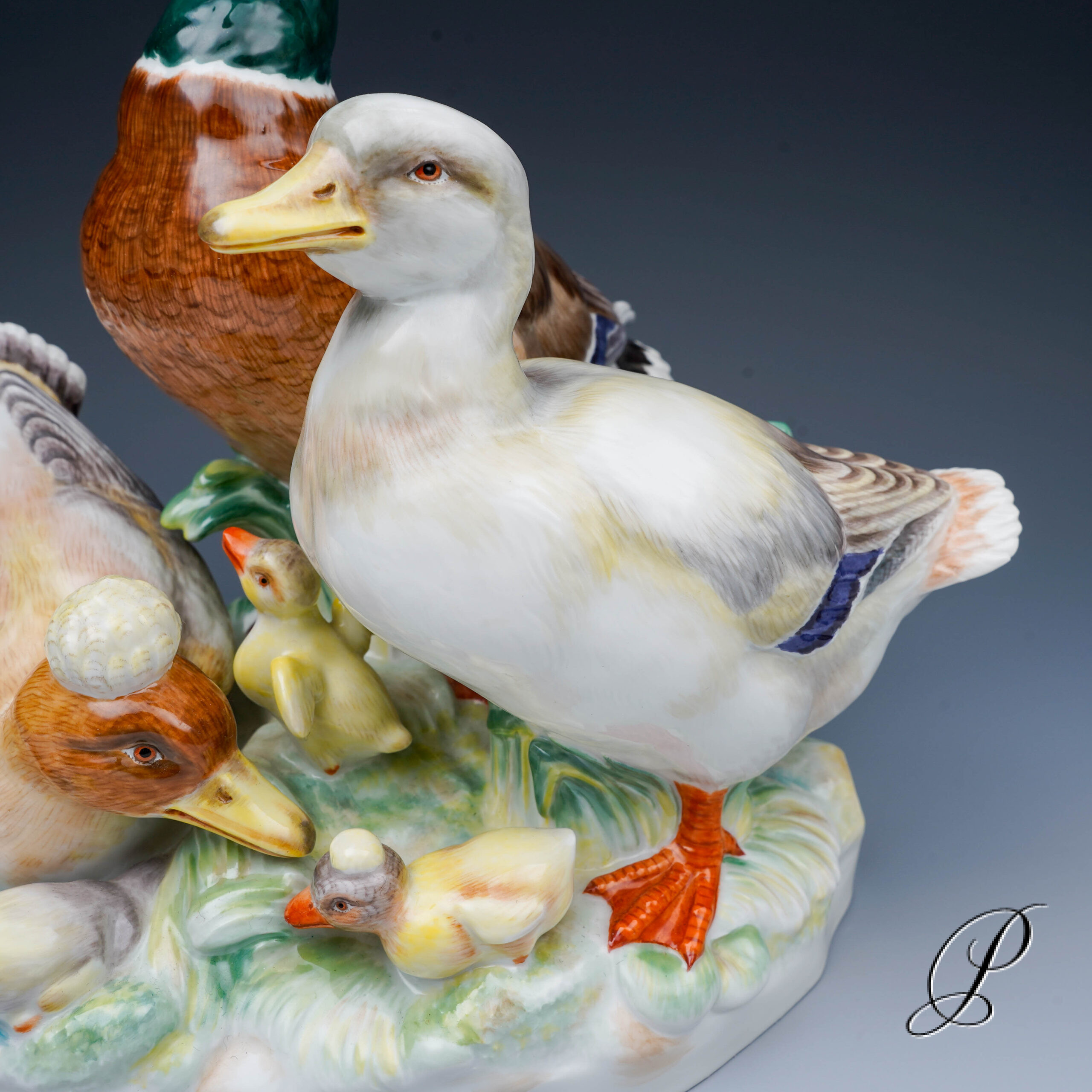 Auf ovalem Natursockel zwischen Schilf stehende Entenfamilie. Zentral emporblickender Enterich mit zwei sitzenden bzw. schwimmenden Enten und einer Schar Küken. Farbenprächtige, fein reliefierte Gefieder. Traumhafte Malerei!!!