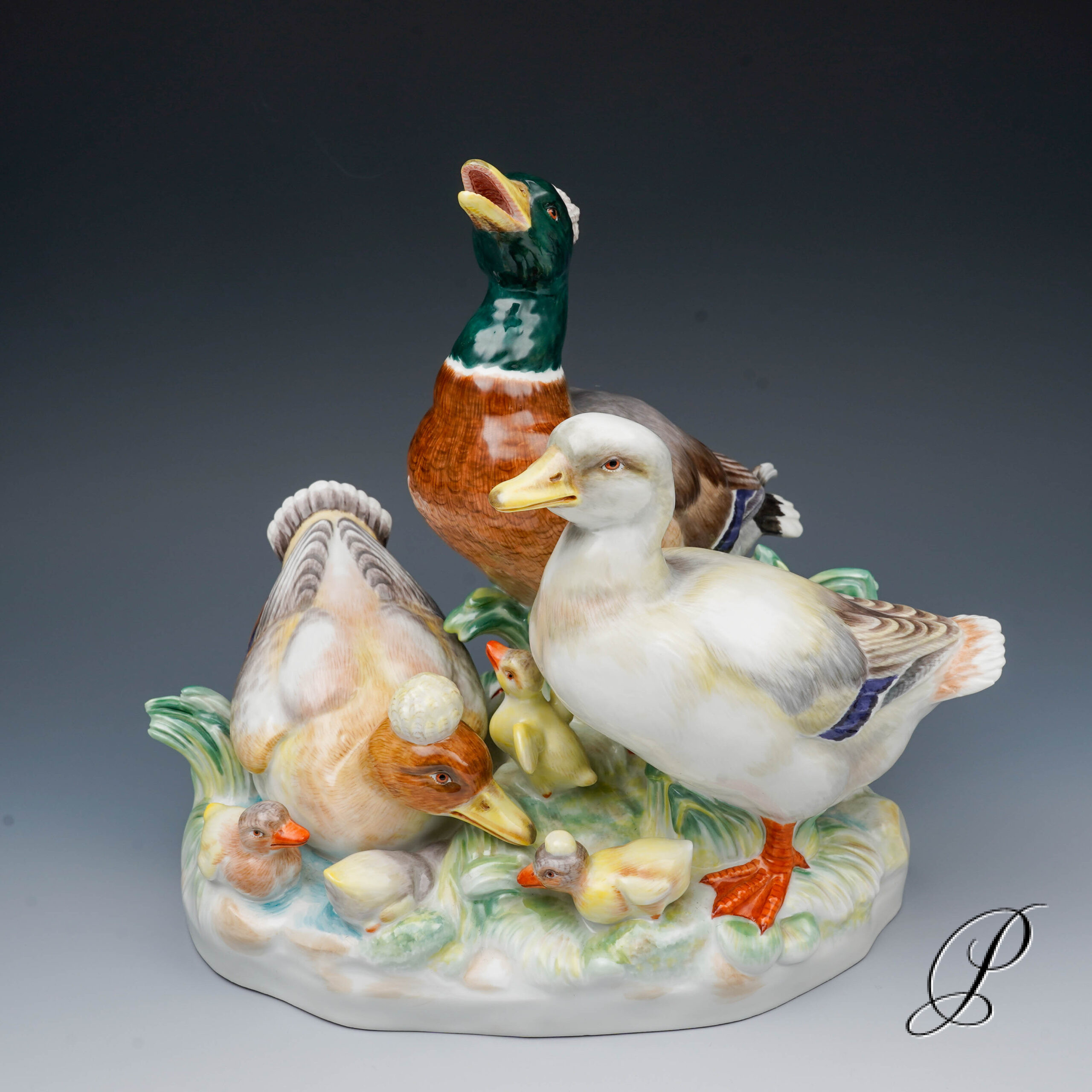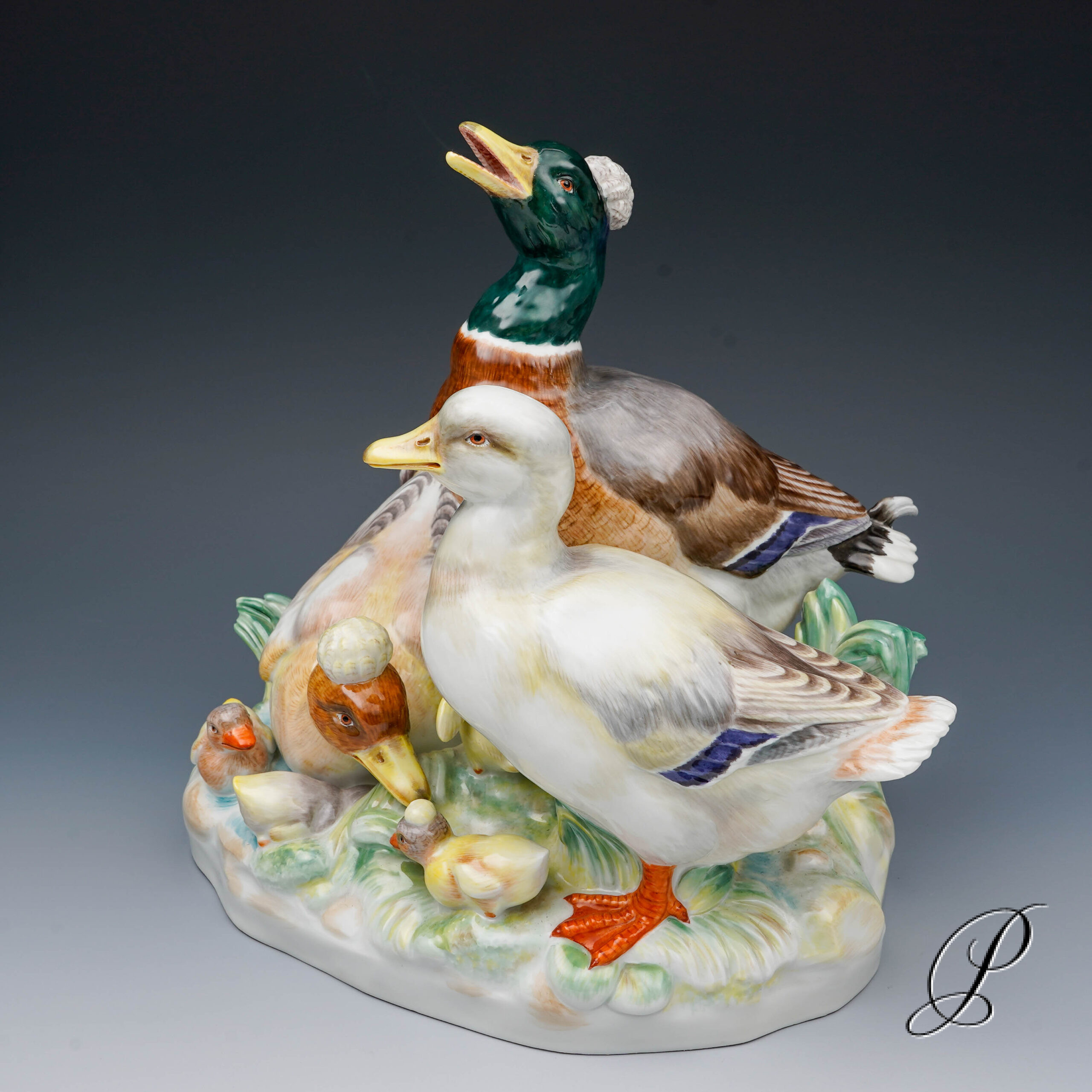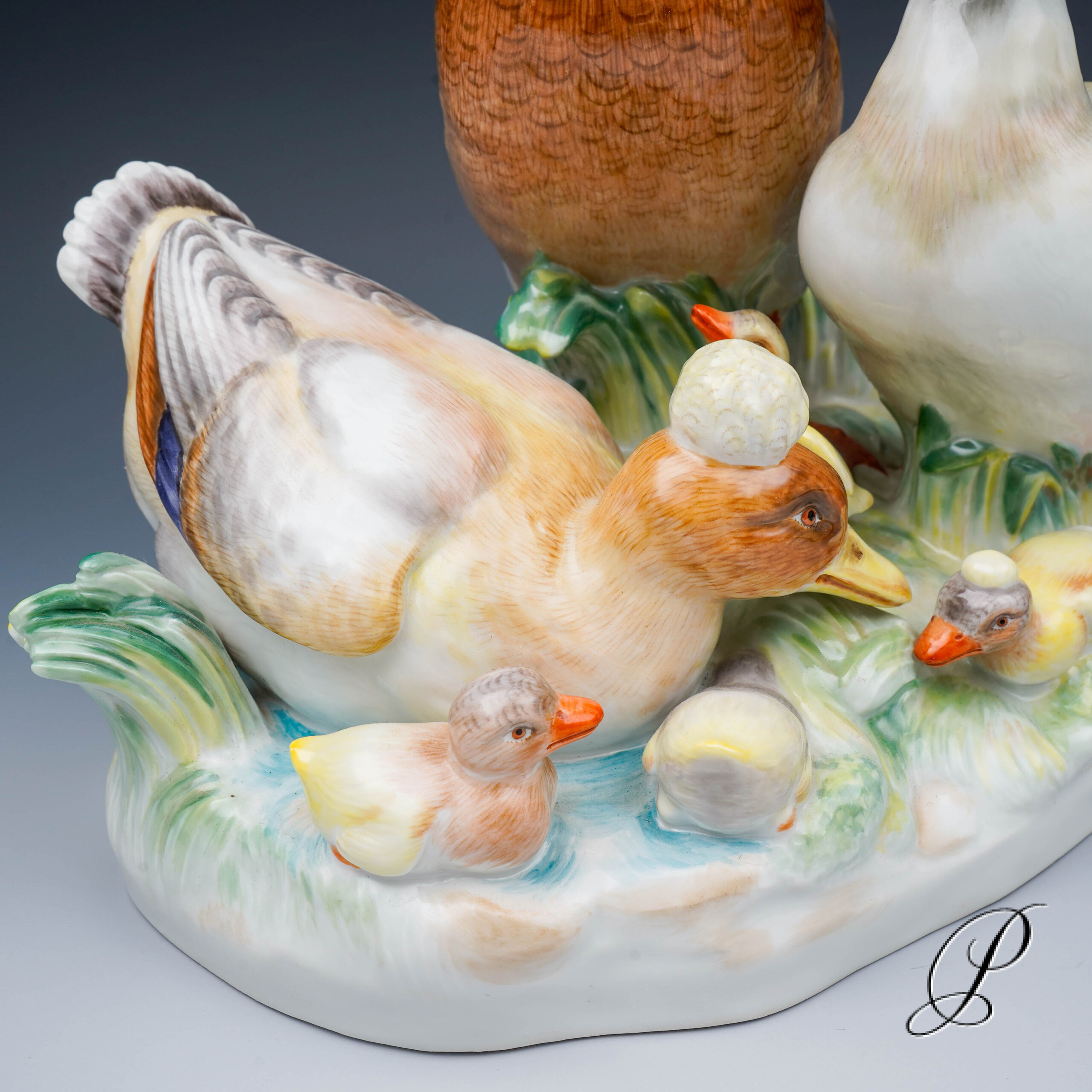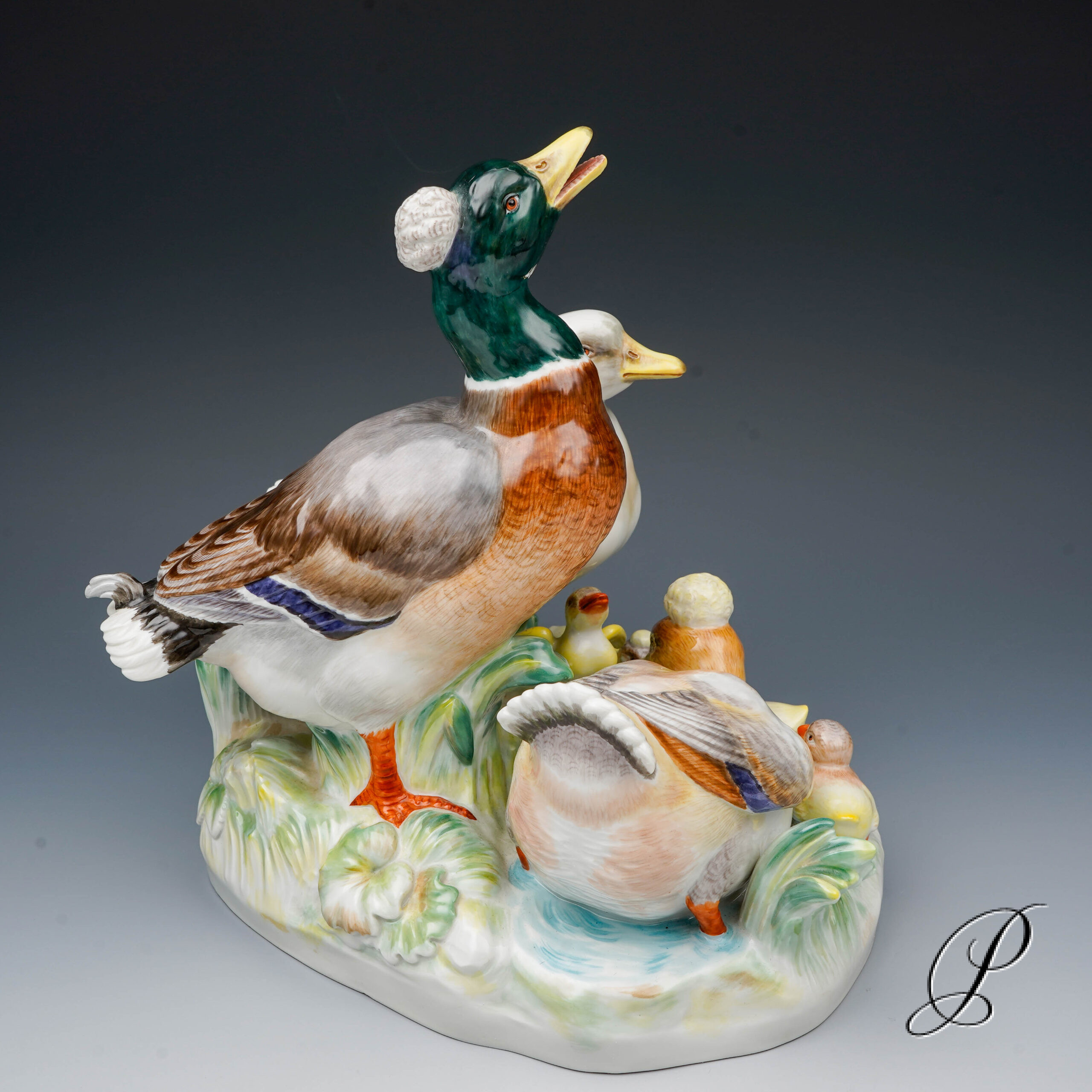 Auf ovalem Natursockel zwischen Schilf stehende Entenfamilie. Zentral emporblickender Enterich mit zwei sitzenden bzw. schwimmenden Enten und einer Schar Küken. Farbenprächtige, fein reliefierte Gefieder. Traumhafte Malerei!!!