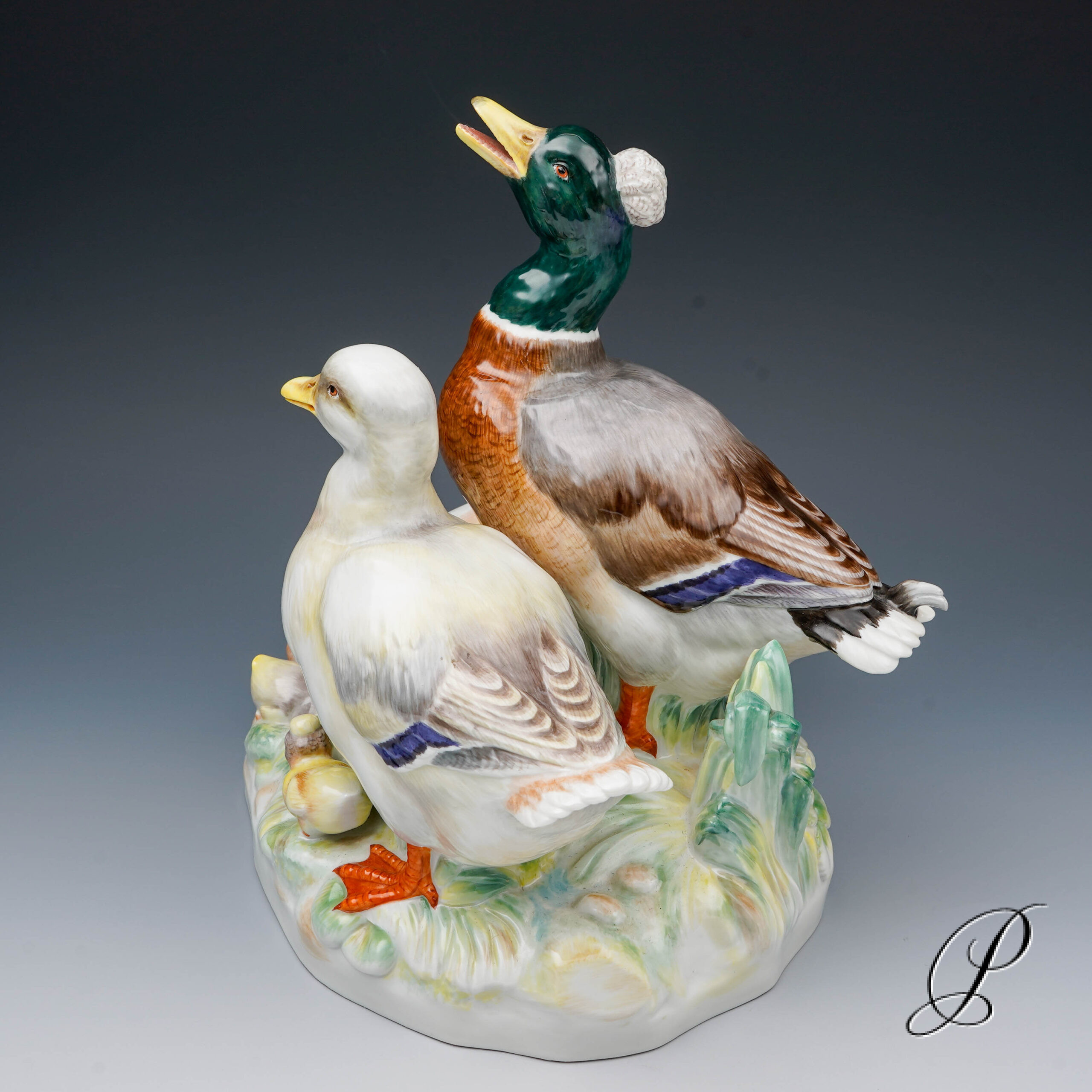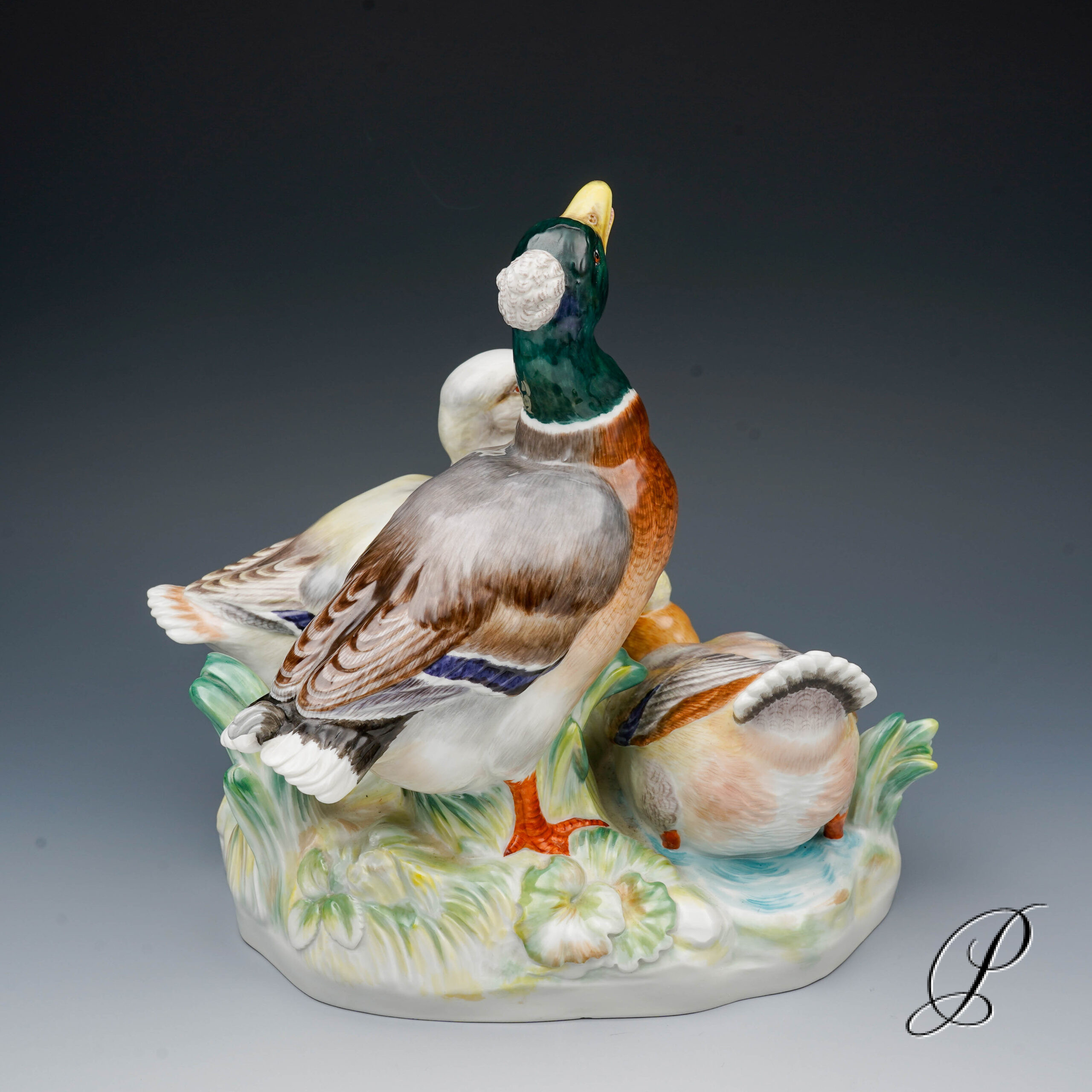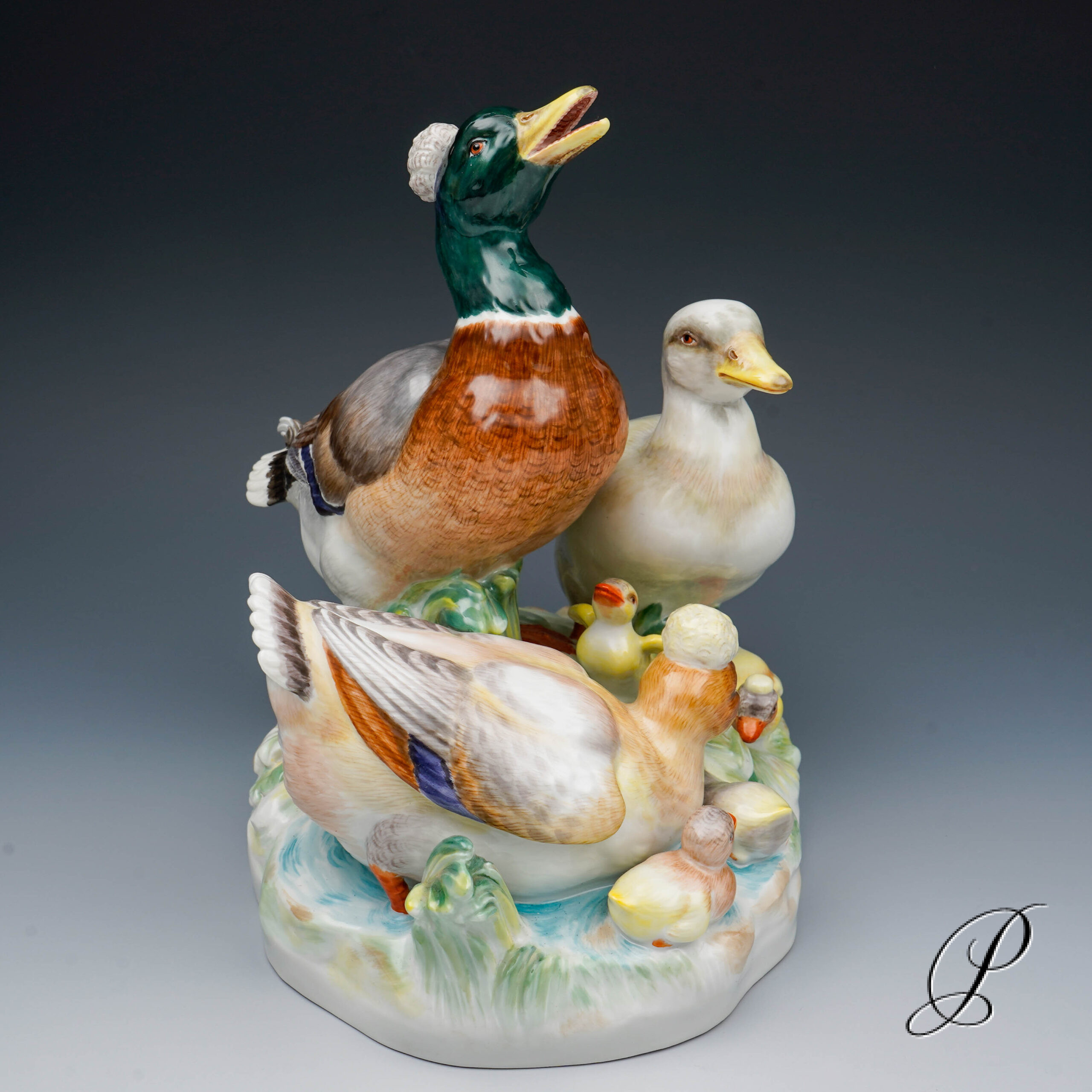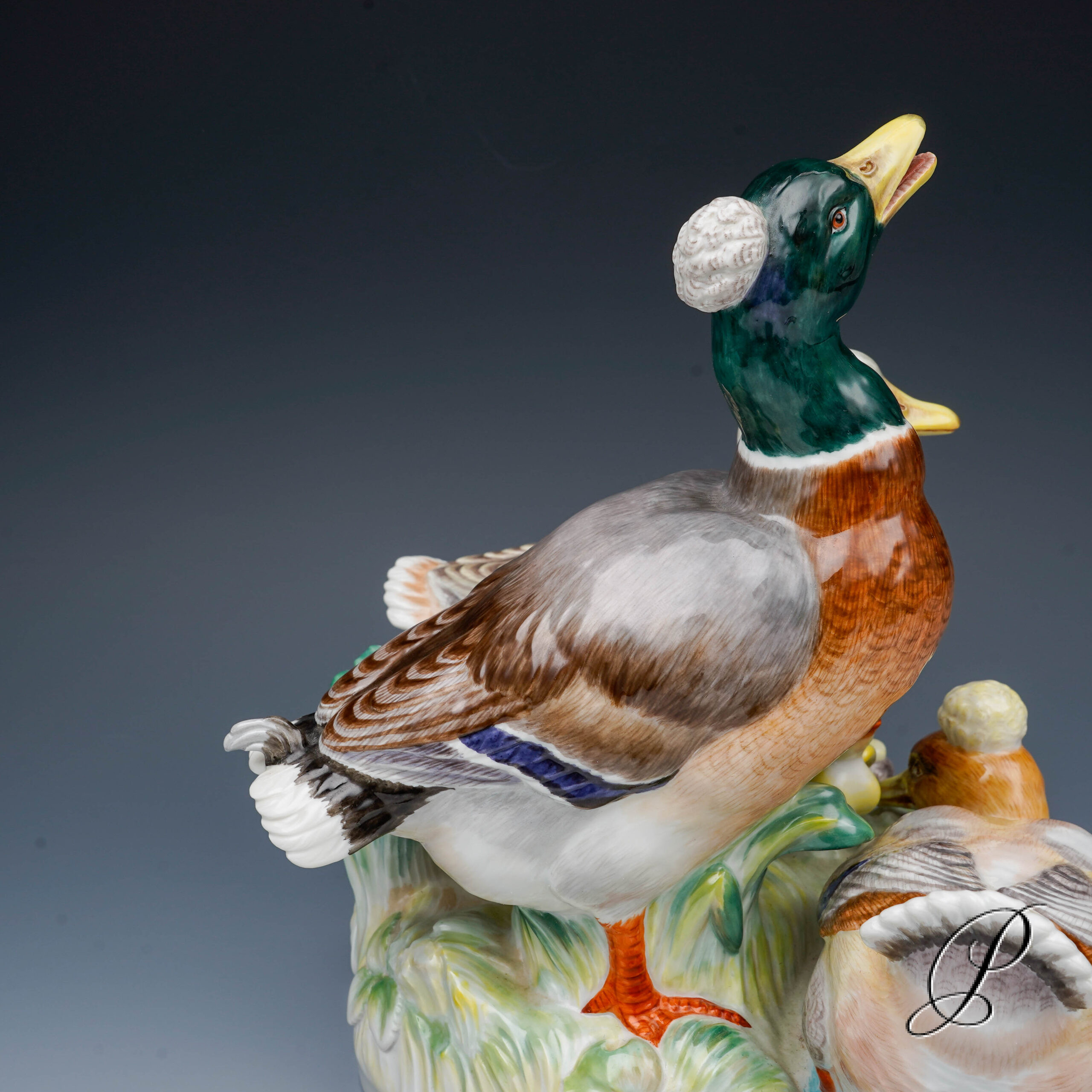Auf ovalem Natursockel zwischen Schilf stehende Entenfamilie. Zentral emporblickender Enterich mit zwei sitzenden bzw. schwimmenden Enten und einer Schar Küken. Farbenprächtige, fein reliefierte Gefieder. Traumhafte Malerei!!!