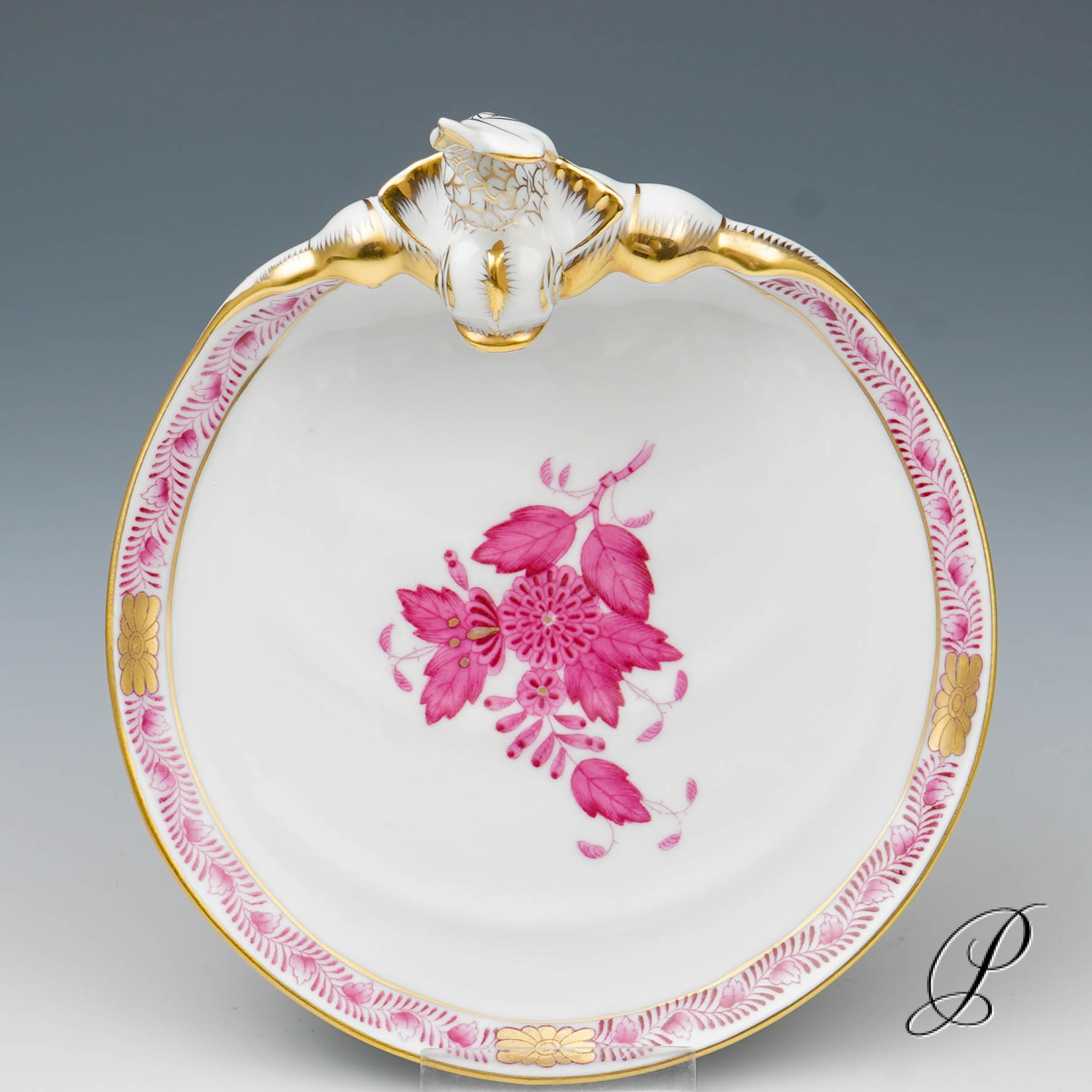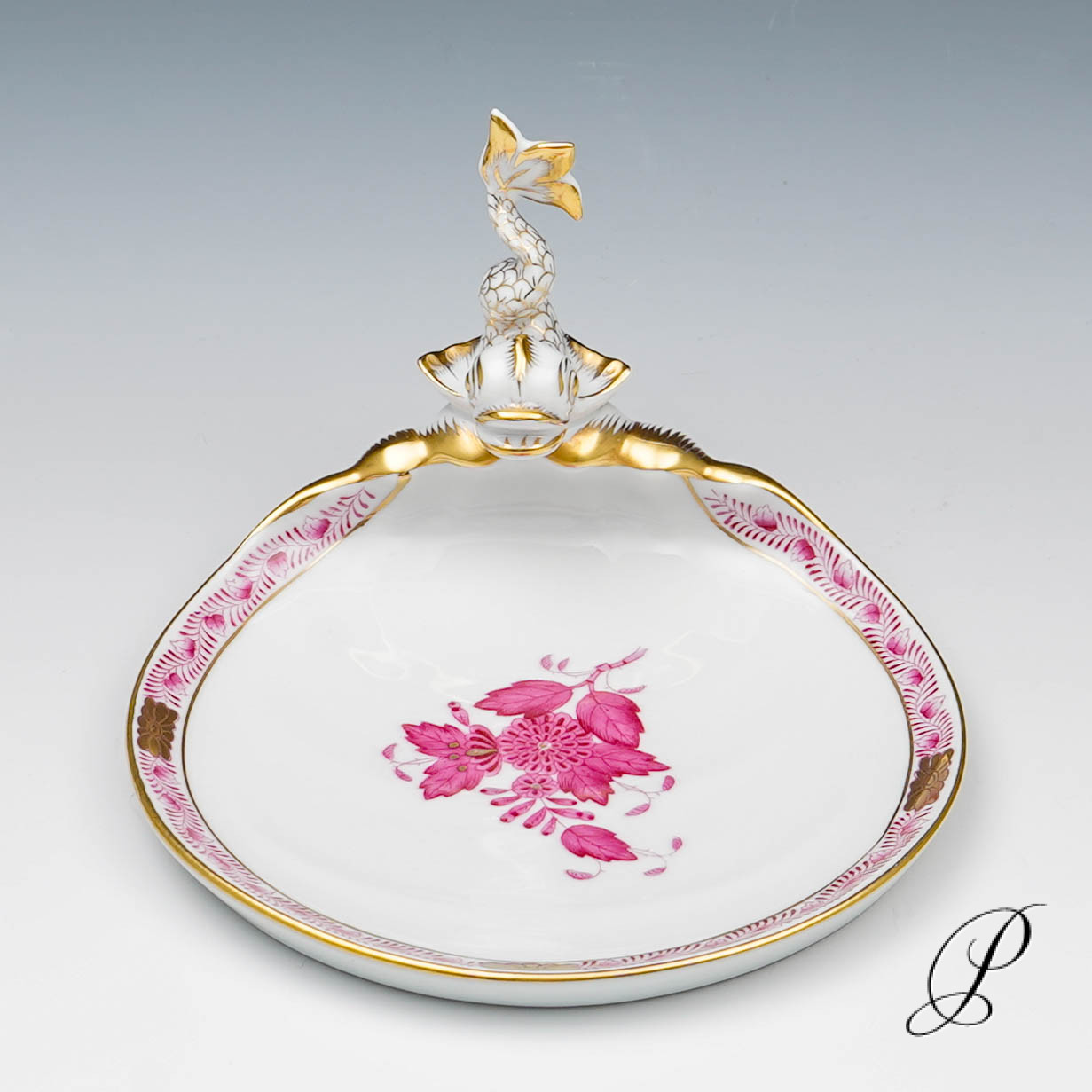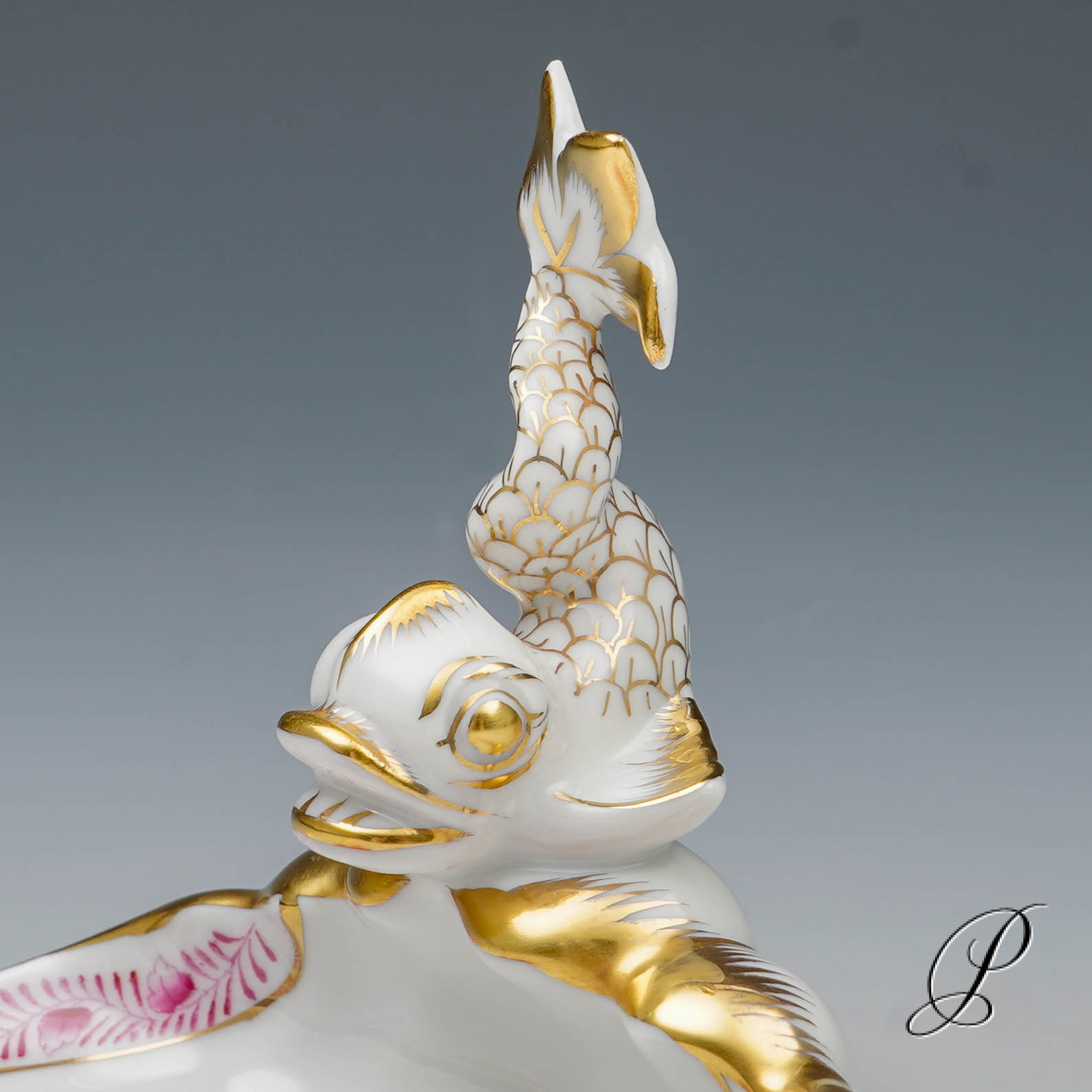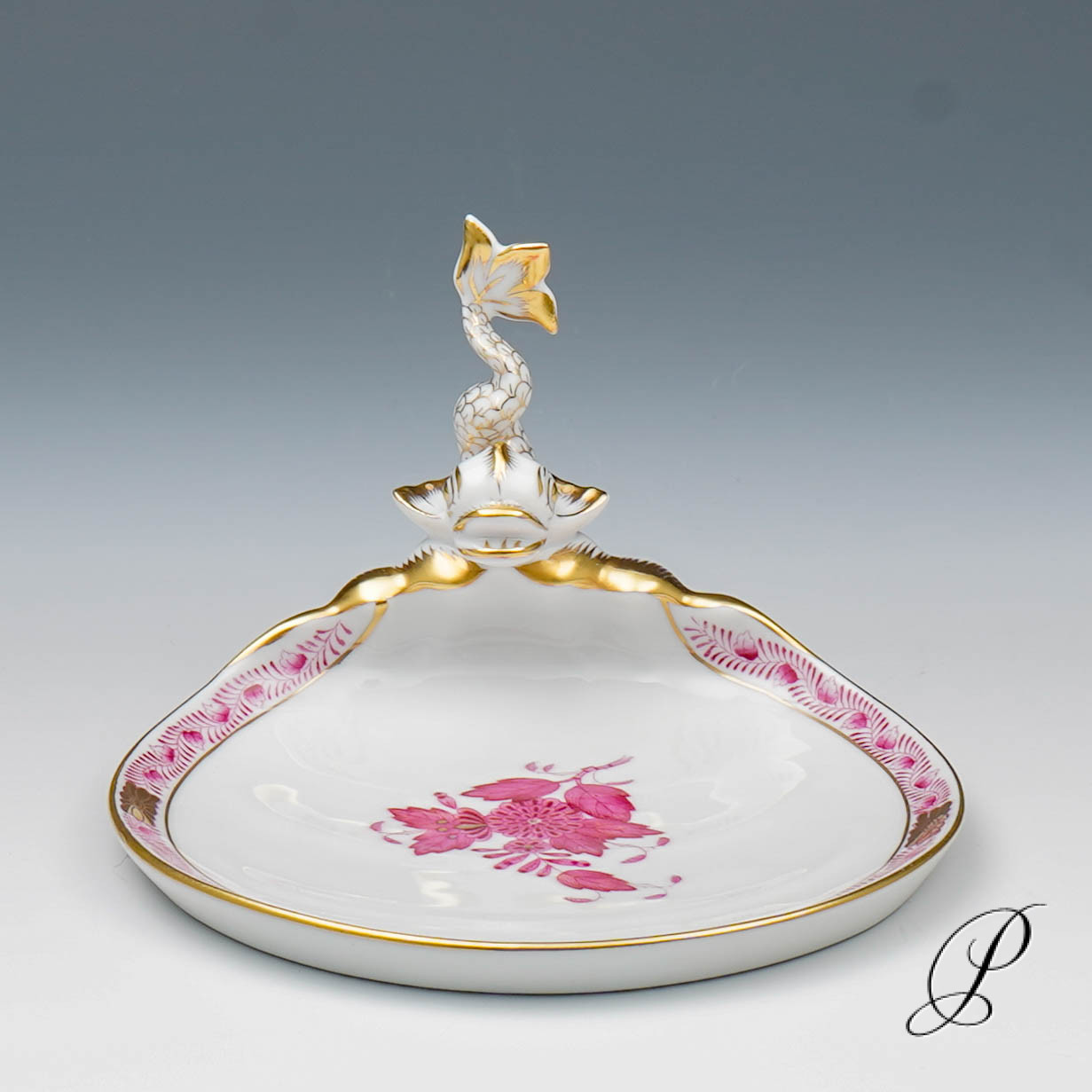 Dekor: Apponyi purpur. Handmalerei. Maße: Teller Durchmnesser 13cm. Höhe inkl. Fisch 8,5cm.
