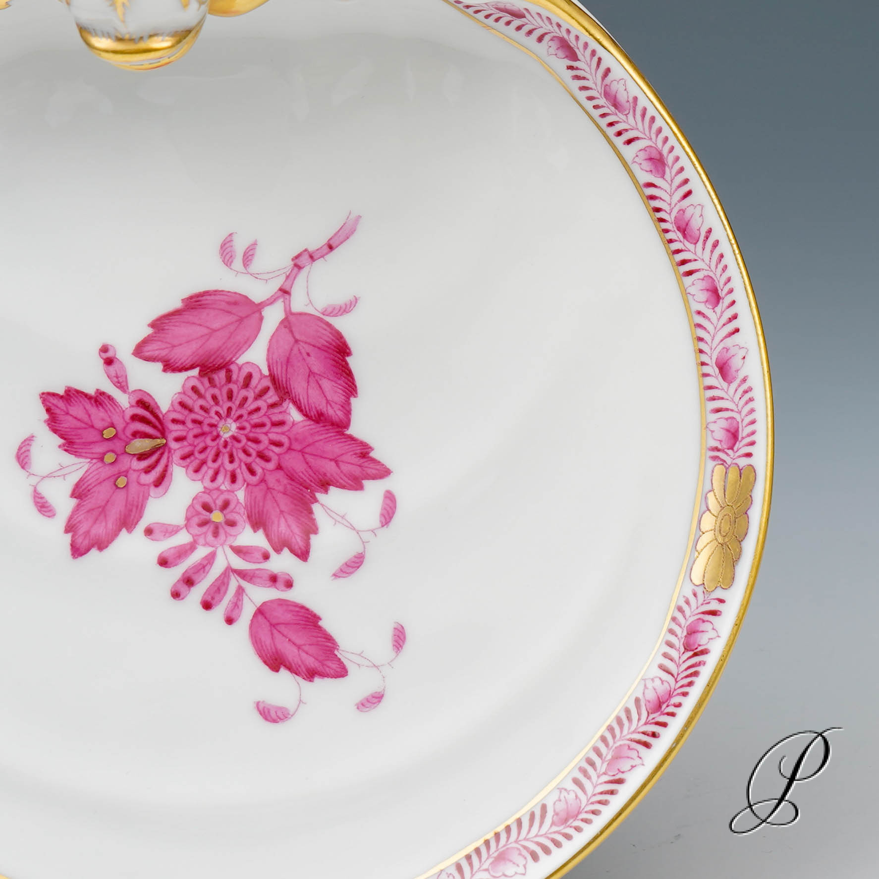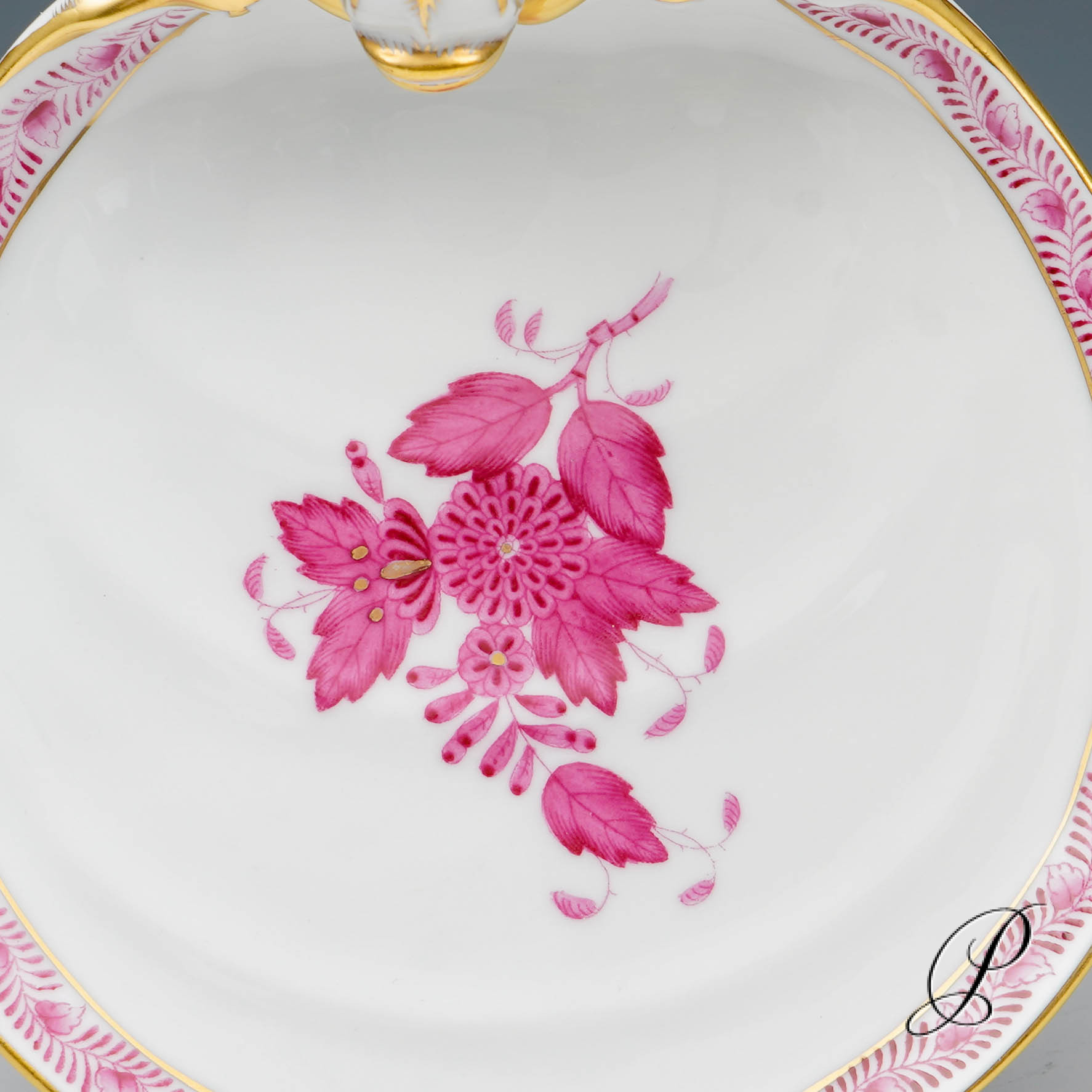 Das Dekor Apponyi gibt es in verschiedenen Farbvarianten. Der Name verbindet sich mit dem Grafen Albert Apponyi, der dieses Motiv in der Herend Manufaktur bestellte. Das Dekor wurde in Anlehnung an das fernöstliche Motiv „Indischer Blumenkorb“ entworfen. Eine stilisierte Pfingstrose in Konturmalerei welche von 6 Streumotiven und einer Girlande aus stilisierten Blättern umgeben ist.