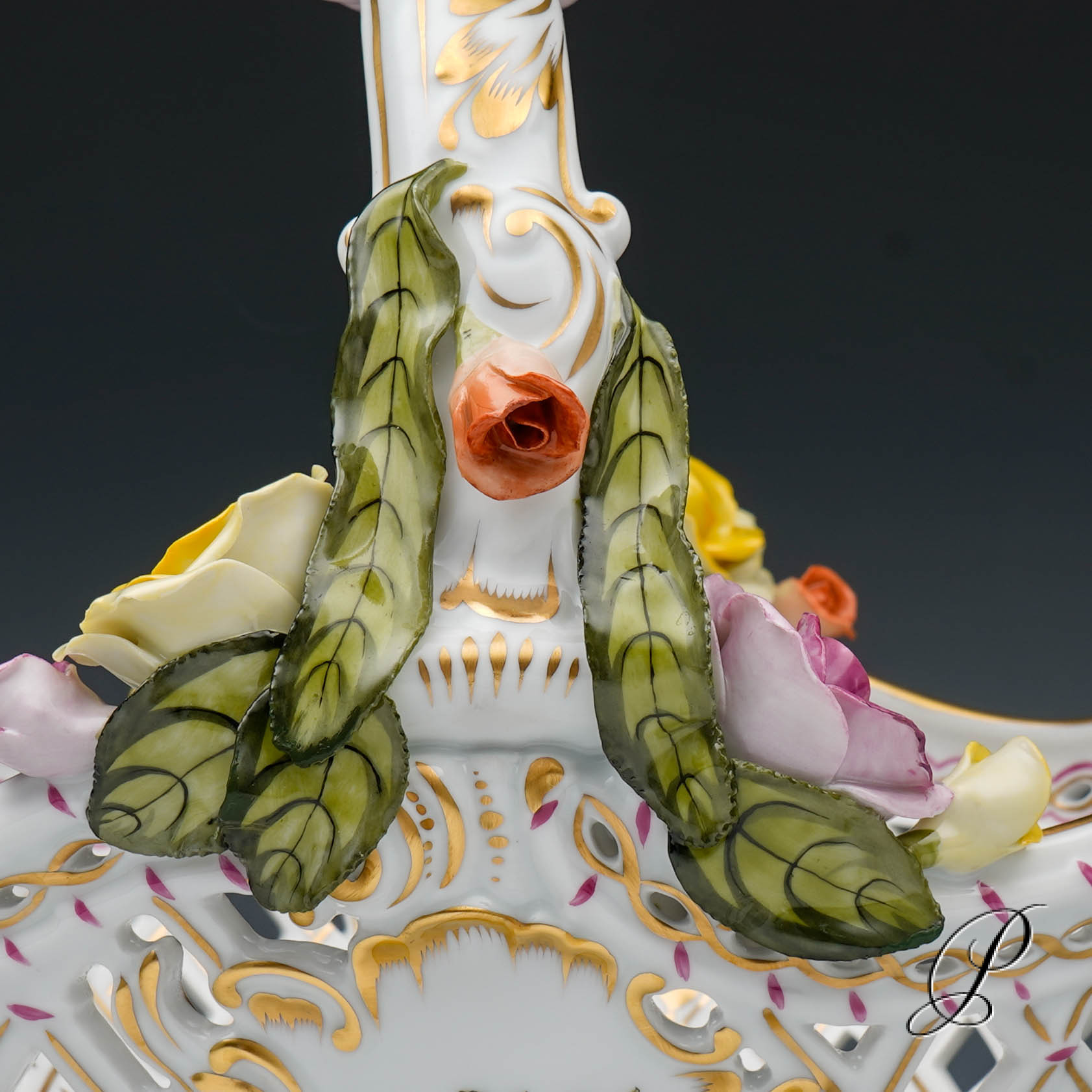 Ringsherum belegt mit per Hand modellierten Blumen und Blätter. Bemalt im Dekor Rothschild und einer tollen Vergoldung. Wandung durchbrochen gearbeitet. Sehr aufwendig. Man bedenke alles Handarbeit!!!!